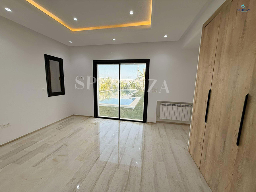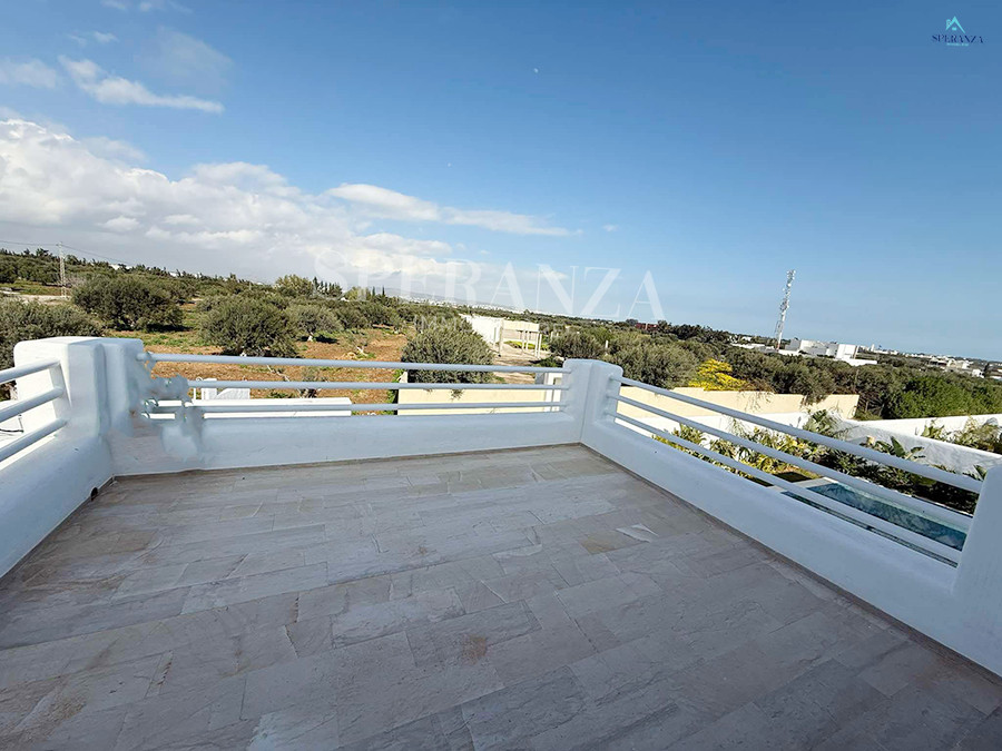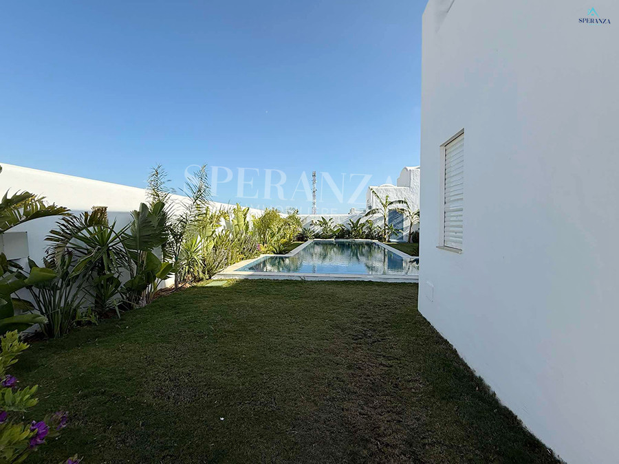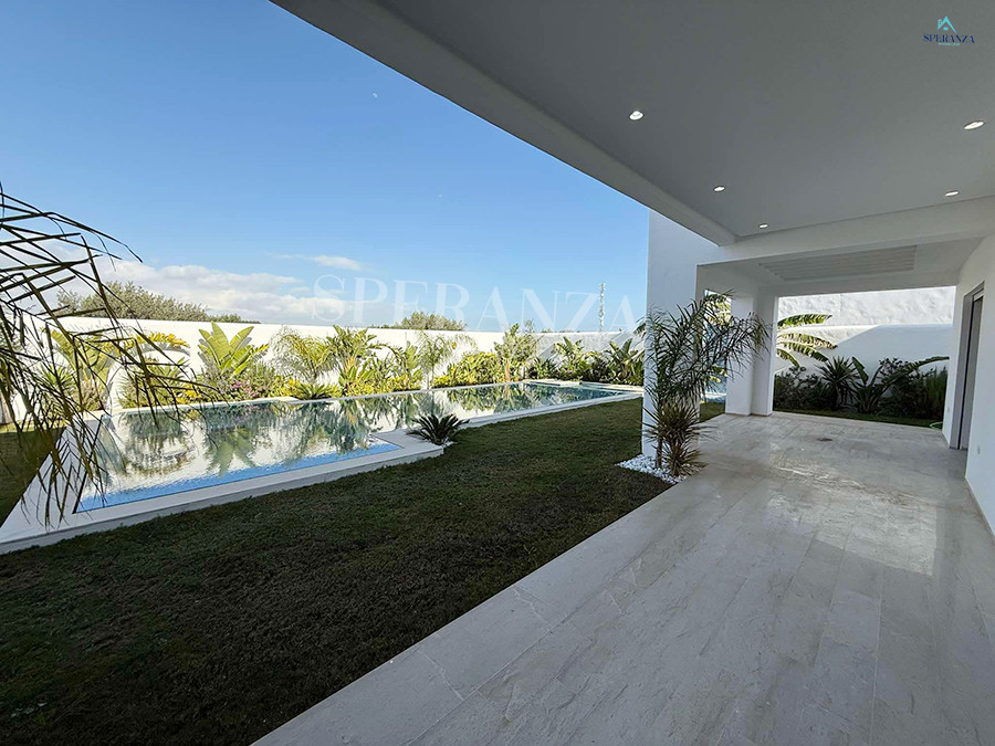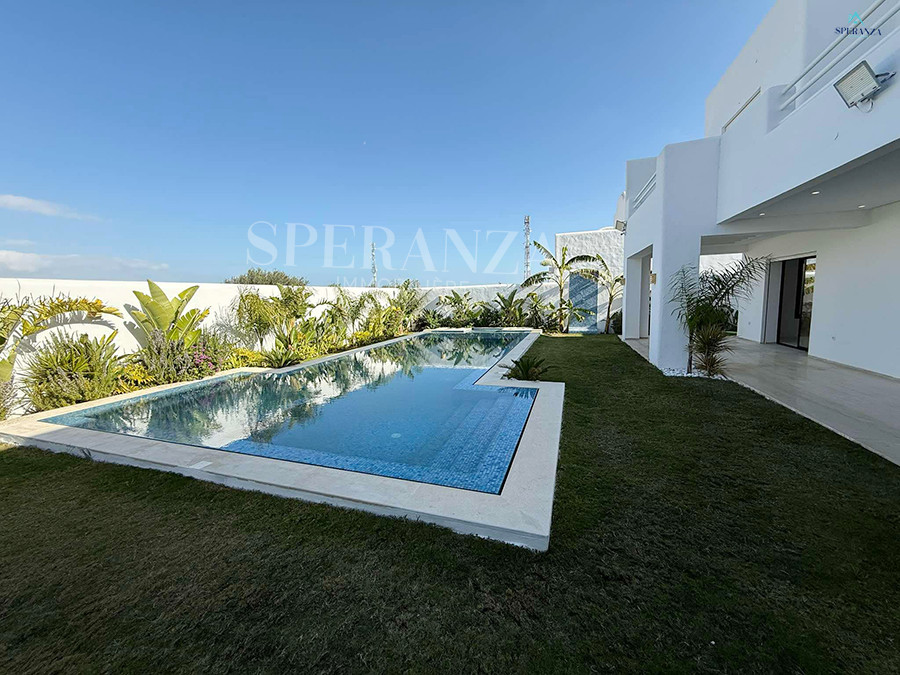 Speranza immobilière Hammamet vous propose à la vente Cette villa est située à Hammamet Sud. L'entrée bénéficie d'un jardin gazonné avec une piscine. La partie jour est composée principalement d'un salon lumineux grâce à ses fenêtres qui offrent une vue sur le jardin ,salon séjour, une cuisine dispose de plusieurs éléments de rangement ,une salle d'eau pour les invités,une suite parentale . Un escalier nous mène au 1er étage à la partie nuit qui se compose de trois suites parentales avec terrasse qui offre une vue sur le jardin et piscine ,et un garage .