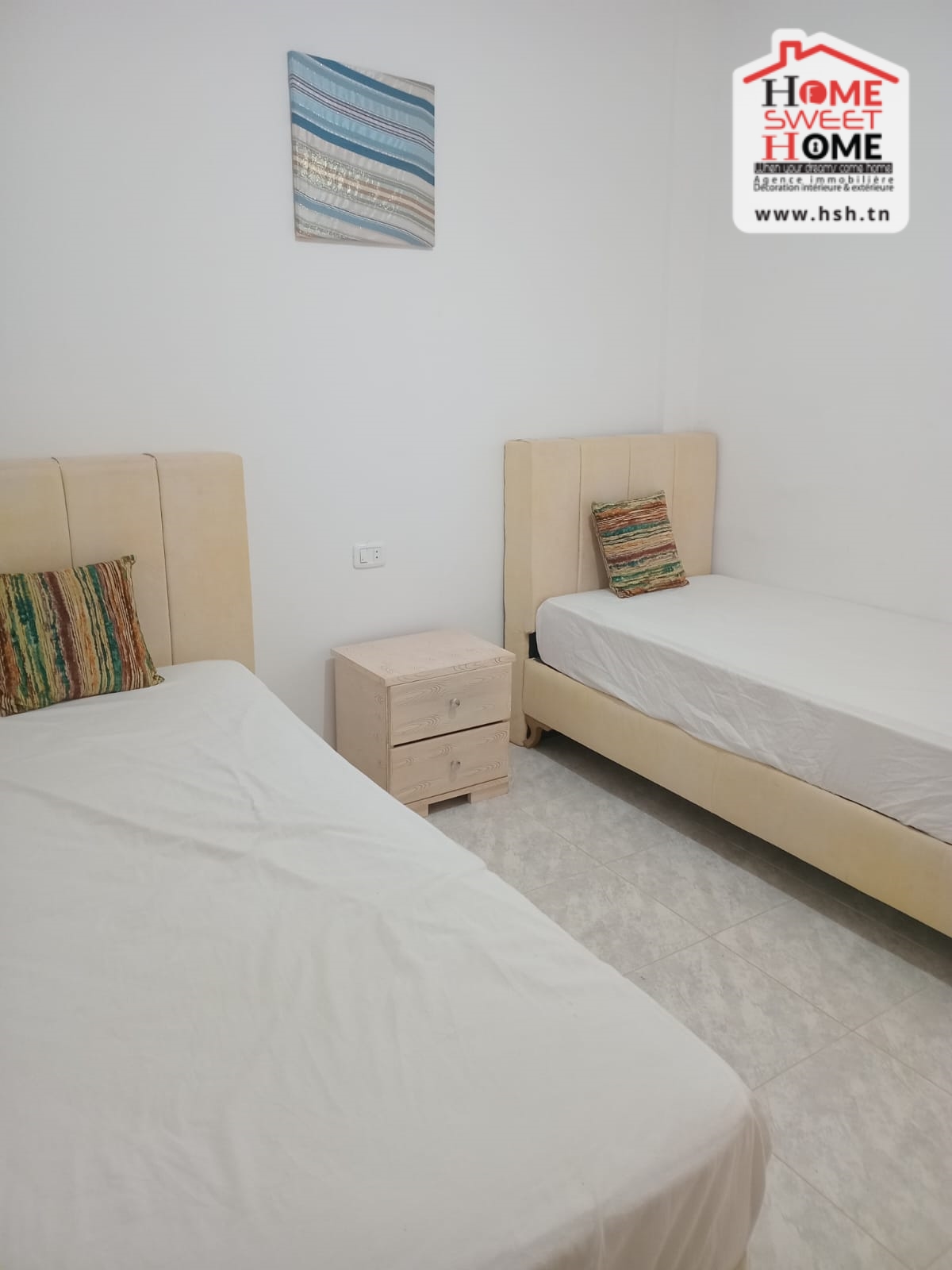 شقة ساحرة تقع في الطابق الأول في شقة في جنين المنصورة، قليبية. A L'entrée، في صالون به شرفة، ومطبخ مجهز مع séchoir، وغرفتين، وغرفة حمام.