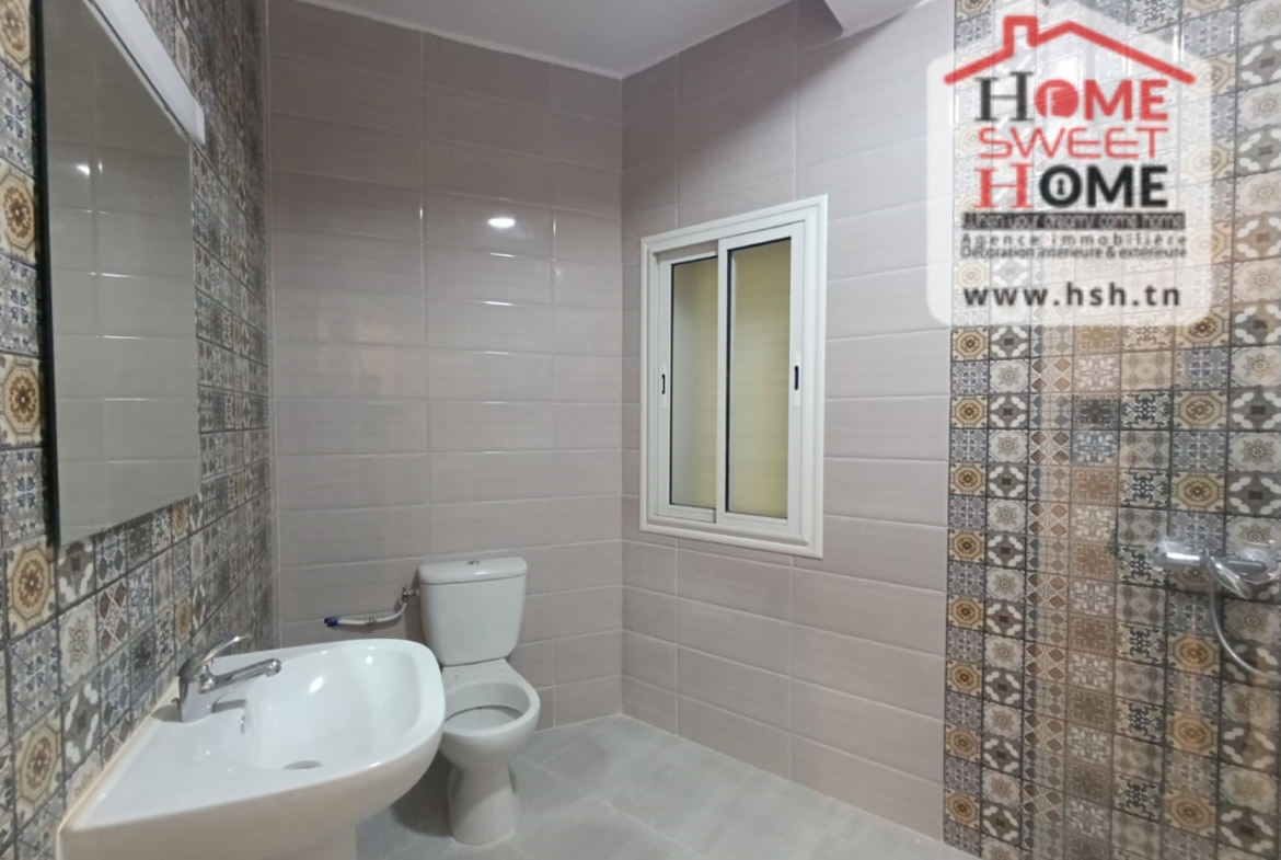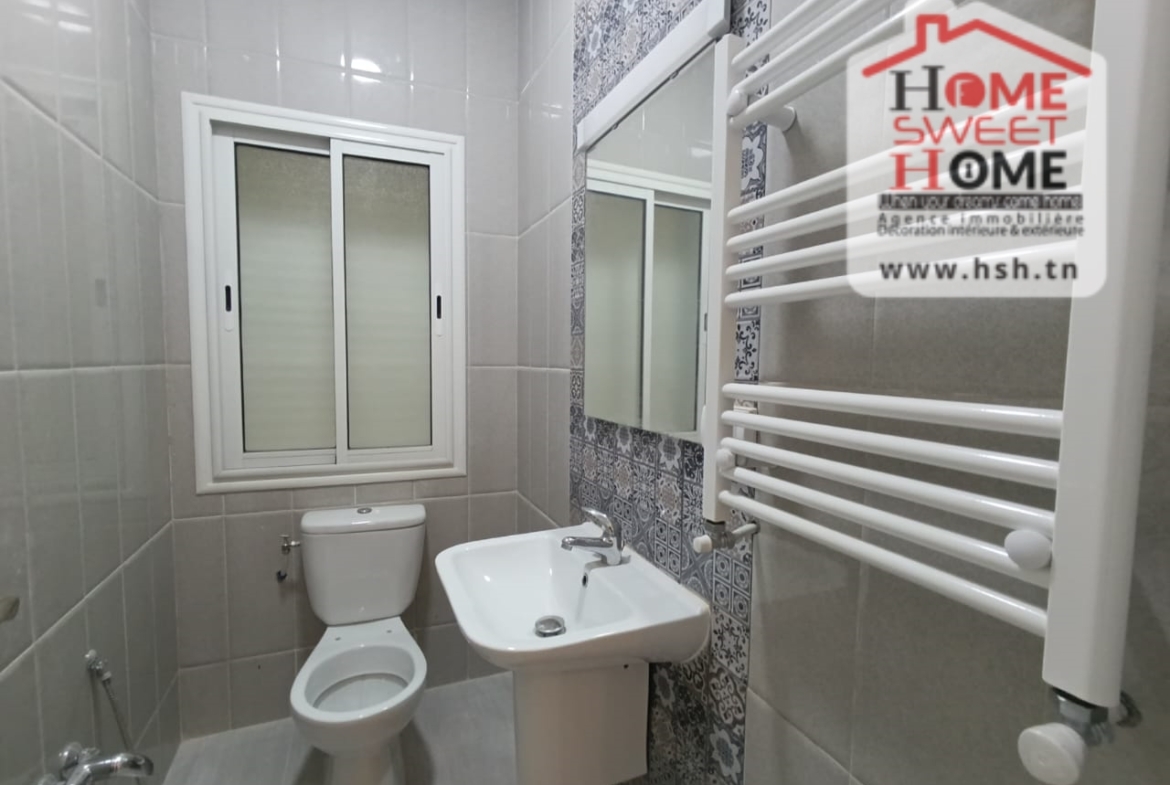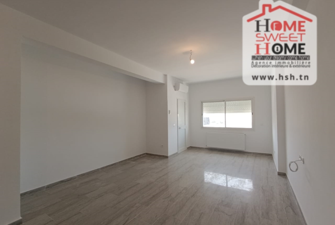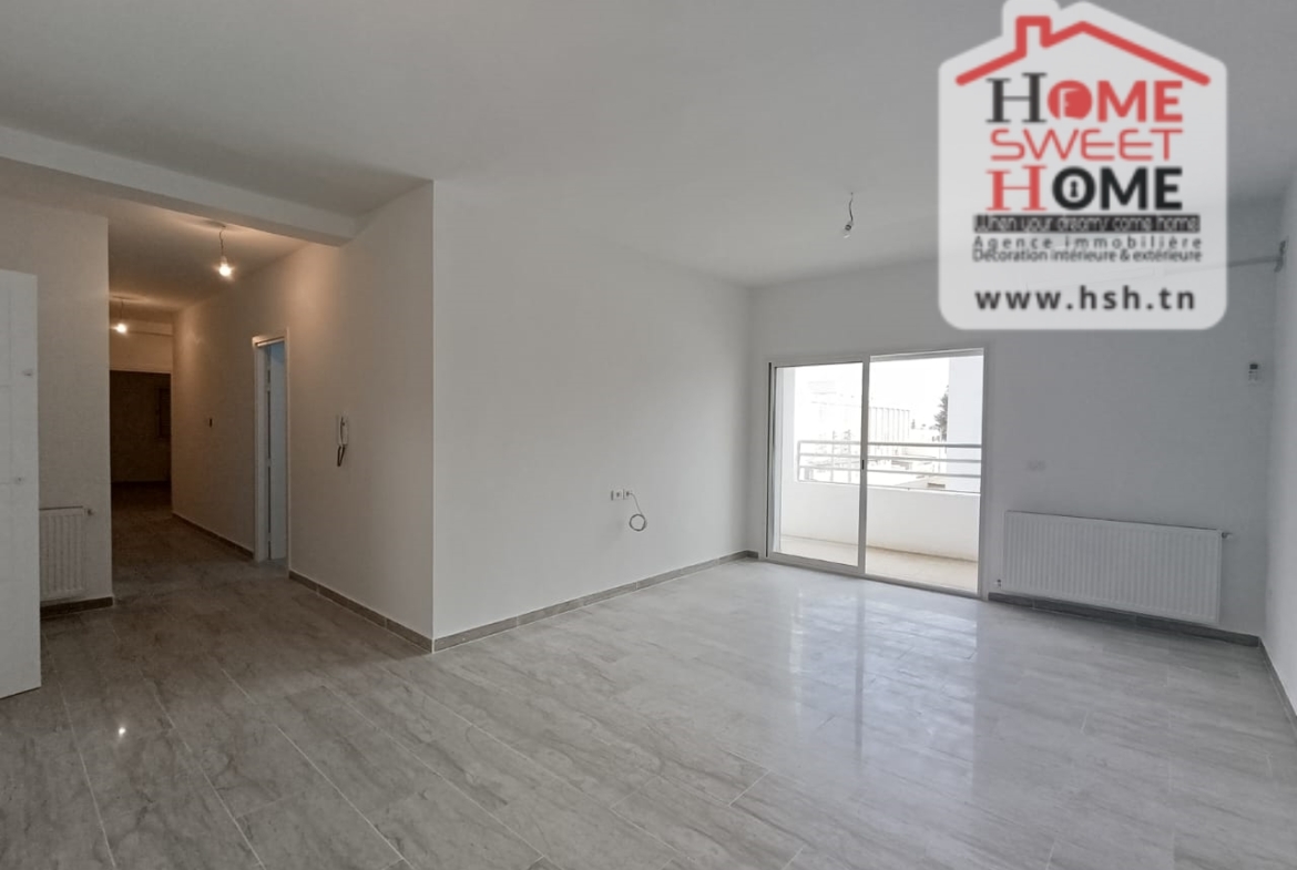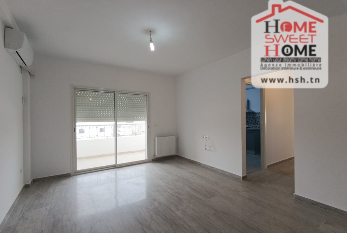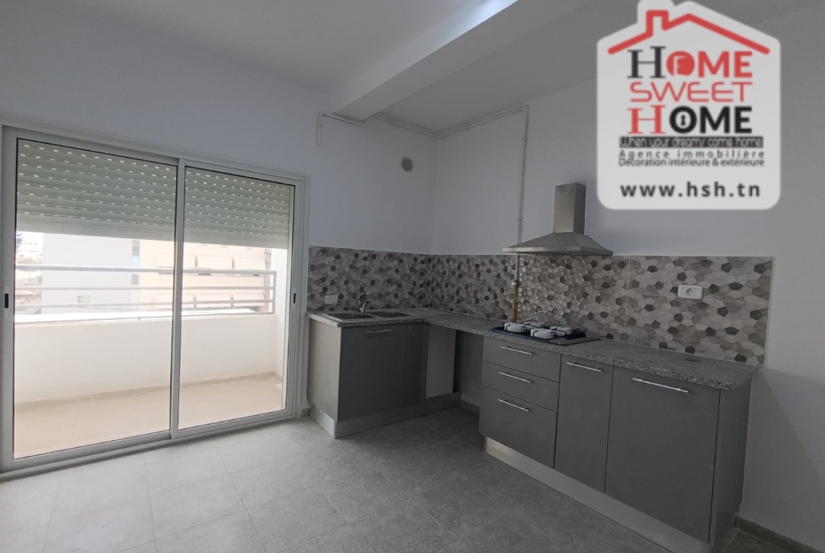 Un Appart au 2éme étage site dans un immeuble privé à Sidi Daoud, La Marsa. في المدخل، في صالون مع شرفة، ومطبخ مجهز مع الراحة، وغرفة في الأريكة وغرفة حمام. في الخارج، على طريق السيارة.