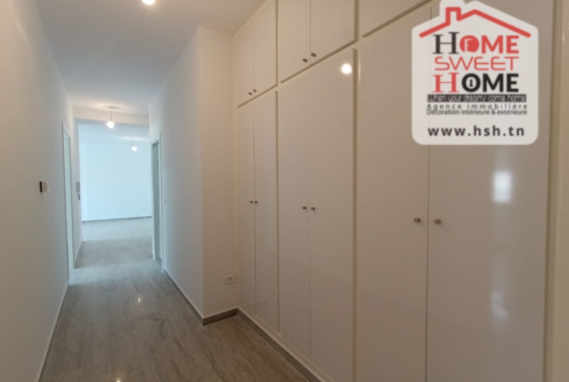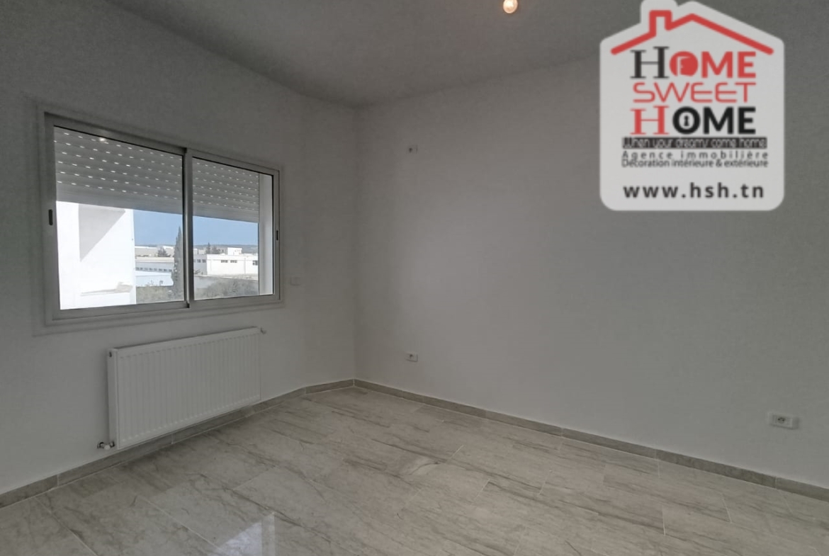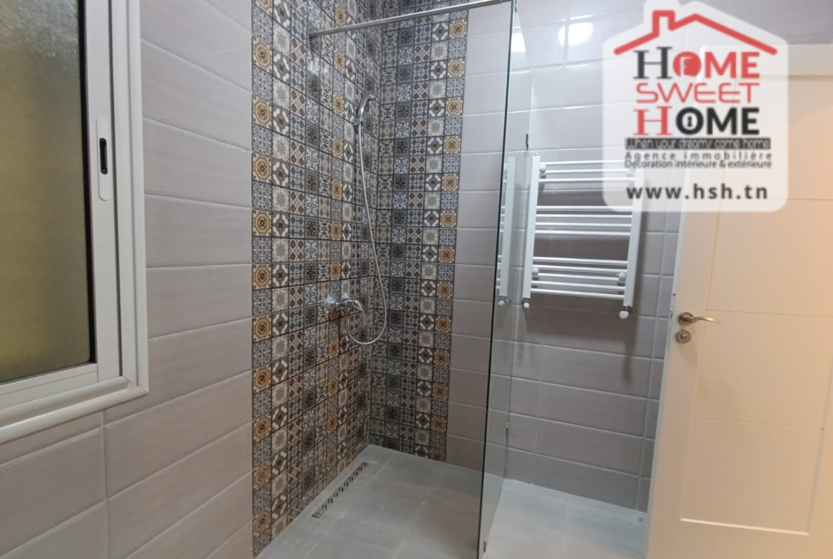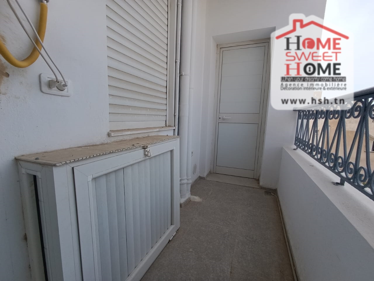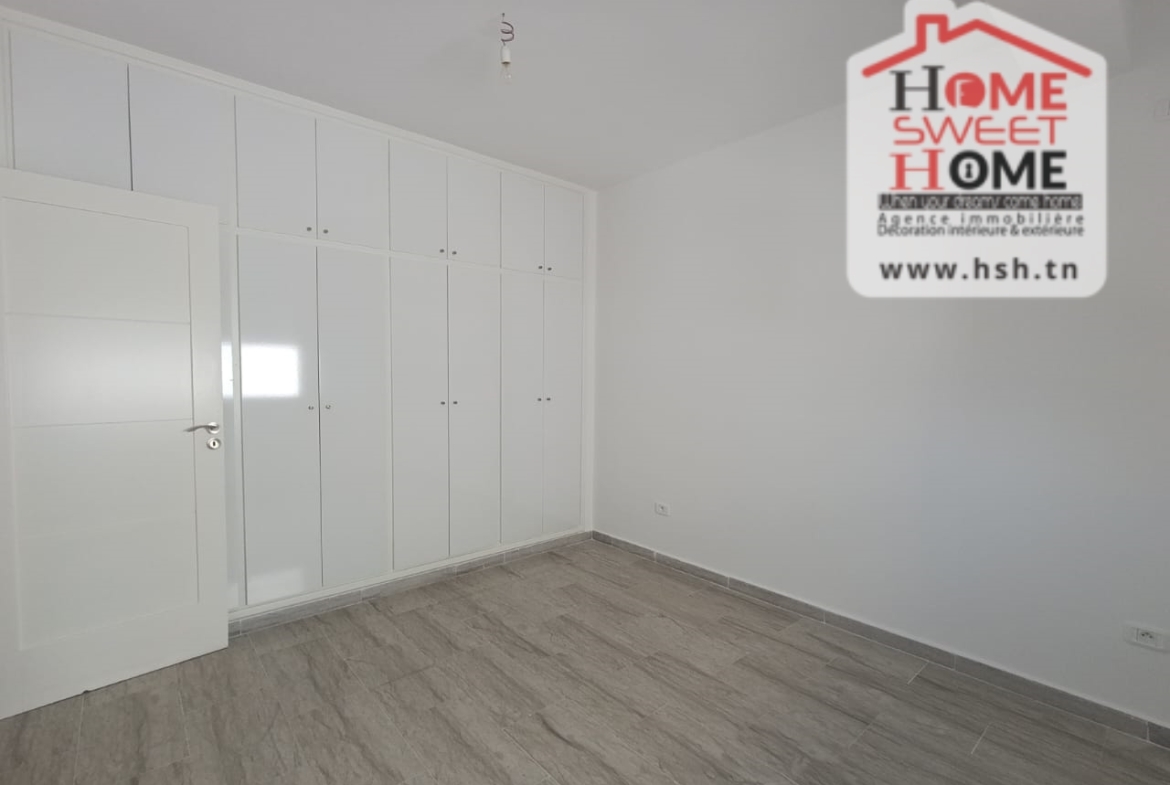Un Appart au 2éme étage site dans un immeuble privé à Sidi Daoud, La Marsa. في المدخل، في صالون مع شرفة، ومطبخ مجهز مع الراحة، وغرفة في الأريكة وغرفة حمام. في الخارج، على طريق السيارة.