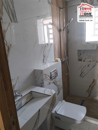 شقة S2 جديدة في RDC بمساحة 85 مترًا مربعًا على مساحة 102 مترًا مربعًا في منطقة جيدة في بهار لزرق. مدخل، في صالون، مطبخ مع طعام شهي، غرفتين للأريكة وغرفة حمام. في الخارج، على شرفة.