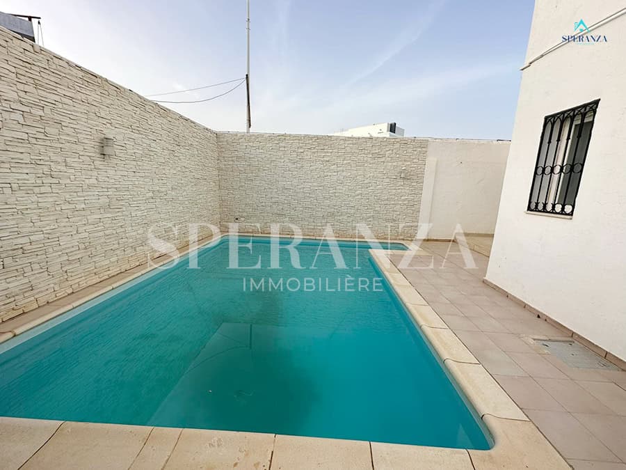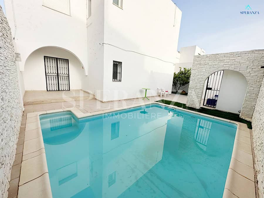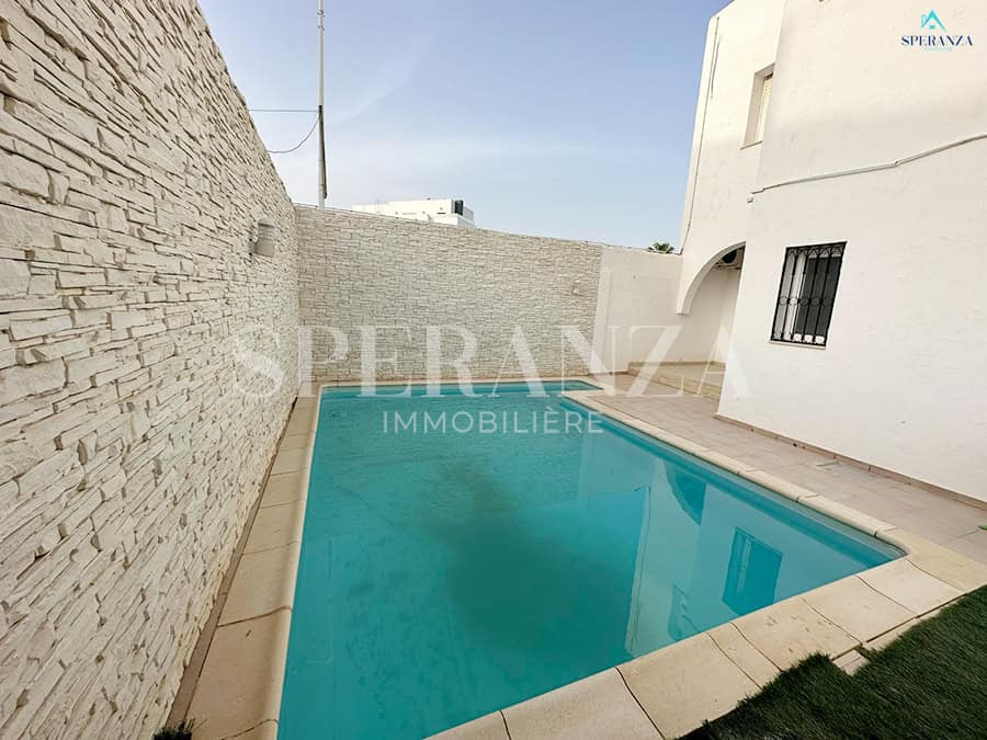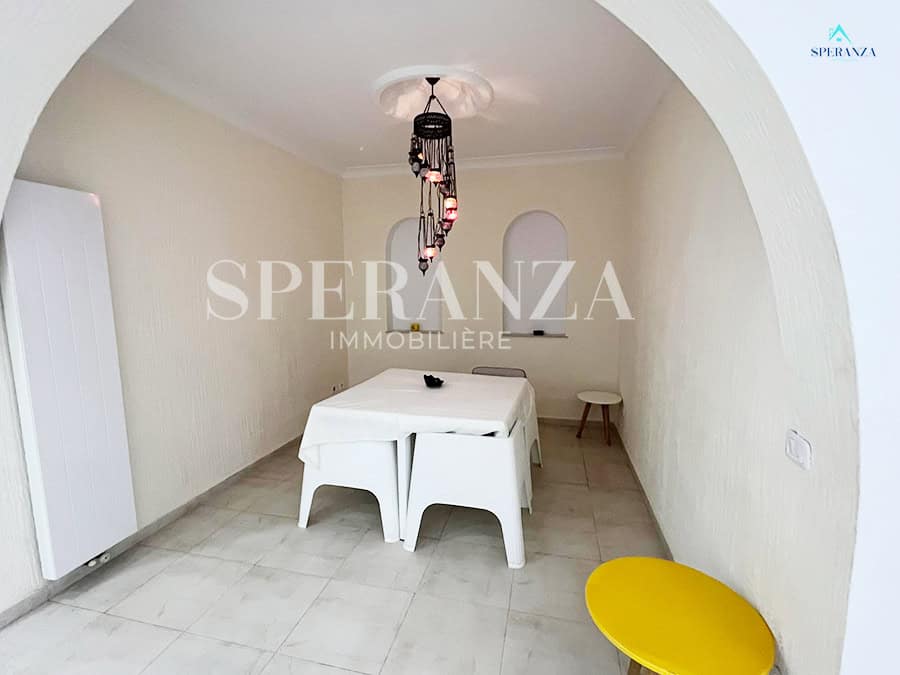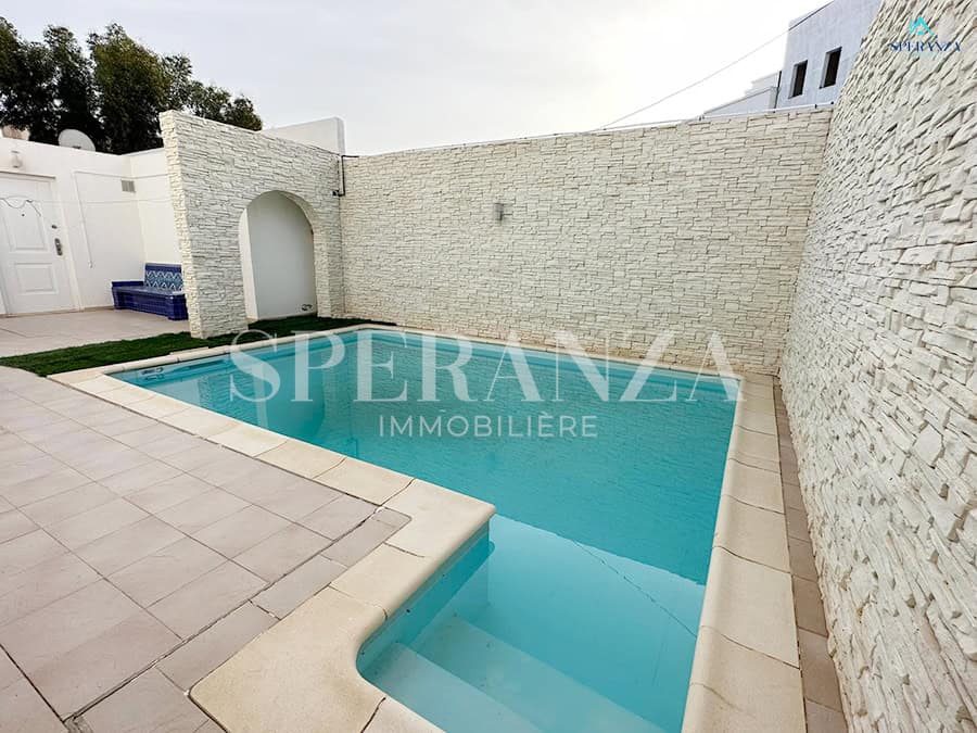 Speranza immobilière Hammamet تقترح عليك لا فينتي، Cette Villa RDC فسيحة تقع في الحمامات الجنوبية. المدخل يقع على حوض سباحة وحديقة صغيرة، في حي هادئ وفي غرفة سكنية. المدخل الرئيسي مفتوح في صالون مضيء . une salle de bain commune pour les invites، une مطبخ وكالة ومنظم من خلال les élements de rangements nécessaires، salon séjour، un Terrasse، trois chambres à الأريكة. مرآب للأمم المتحدة