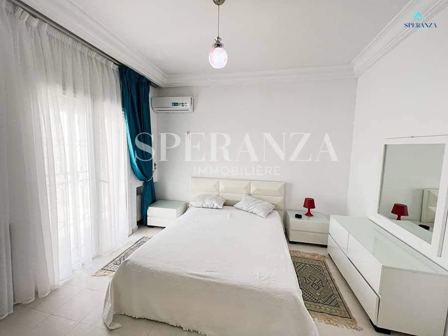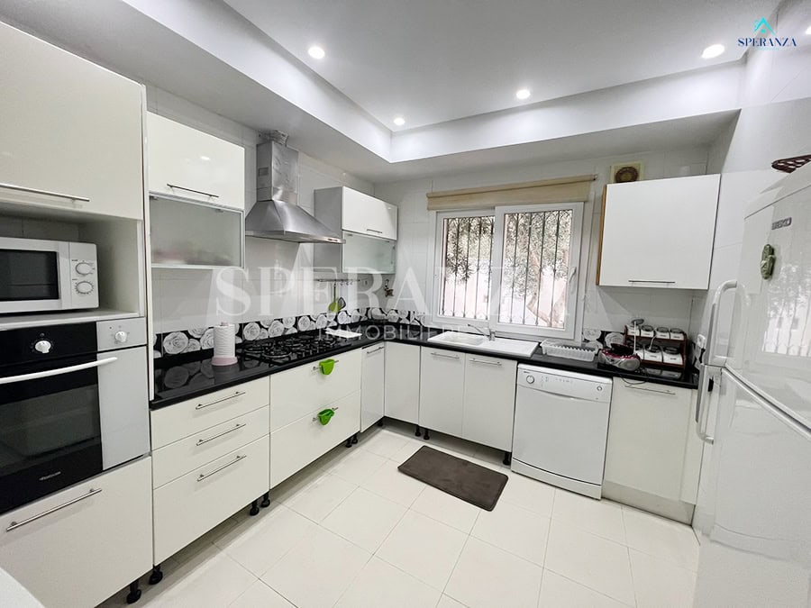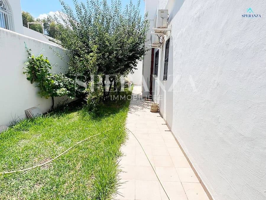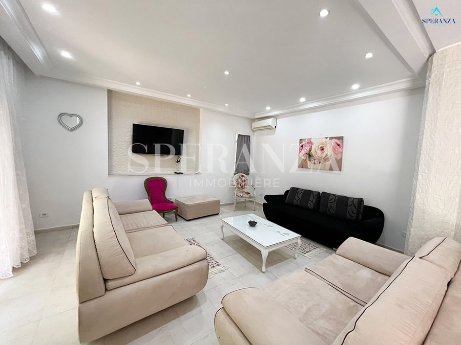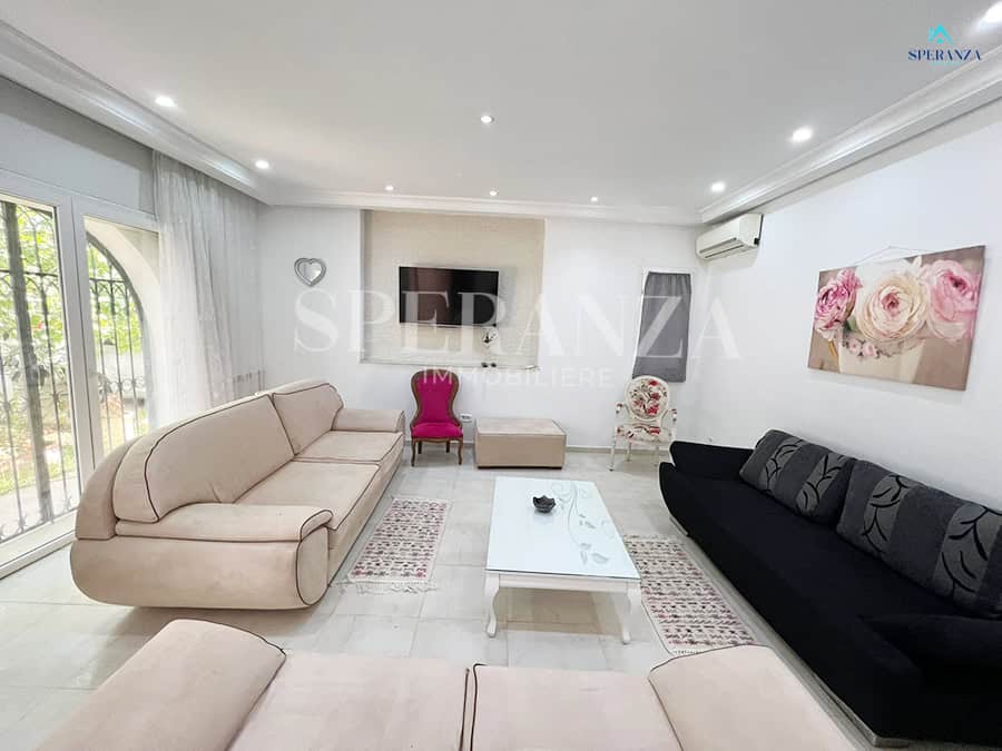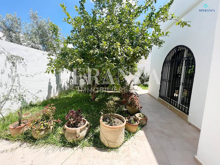 Speranza immobilière Hammamet تقترح عليك لا فينتي، Cette Villa RDC فسيحة تقع في الحمامات الجنوبية. المدخل يقع على حوض سباحة وحديقة صغيرة، في حي هادئ وفي غرفة سكنية. المدخل الرئيسي مفتوح في صالون مضيء . une salle de bain commune pour les invites، une مطبخ وكالة ومنظم من خلال les élements de rangements nécessaires، salon séjour، un Terrasse، trois chambres à الأريكة. مرآب للأمم المتحدة