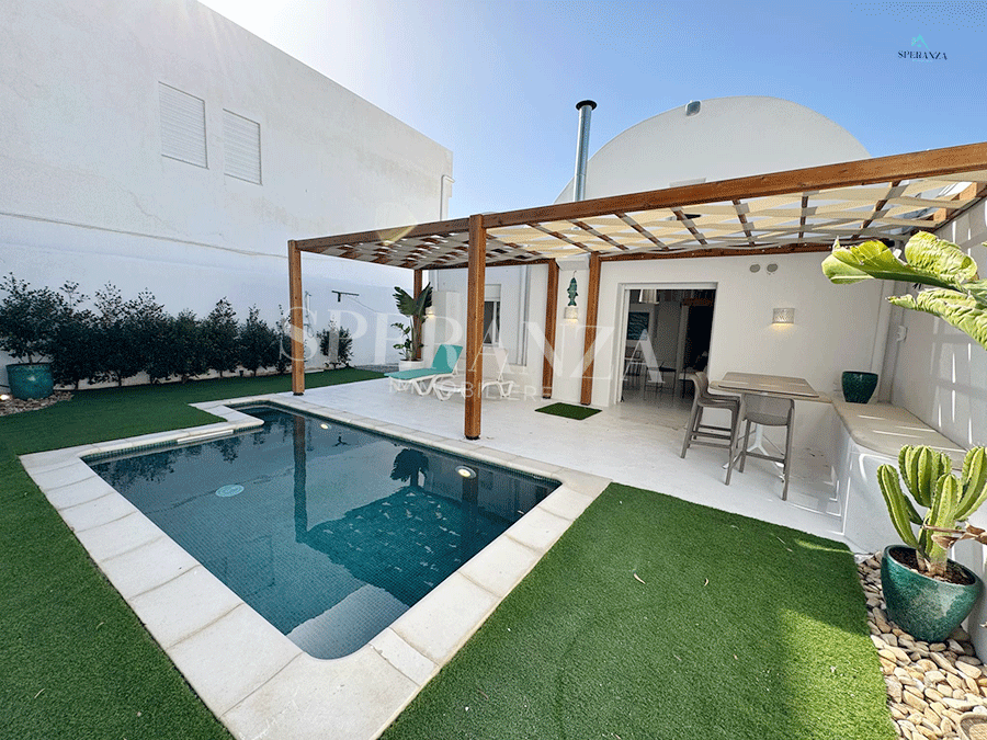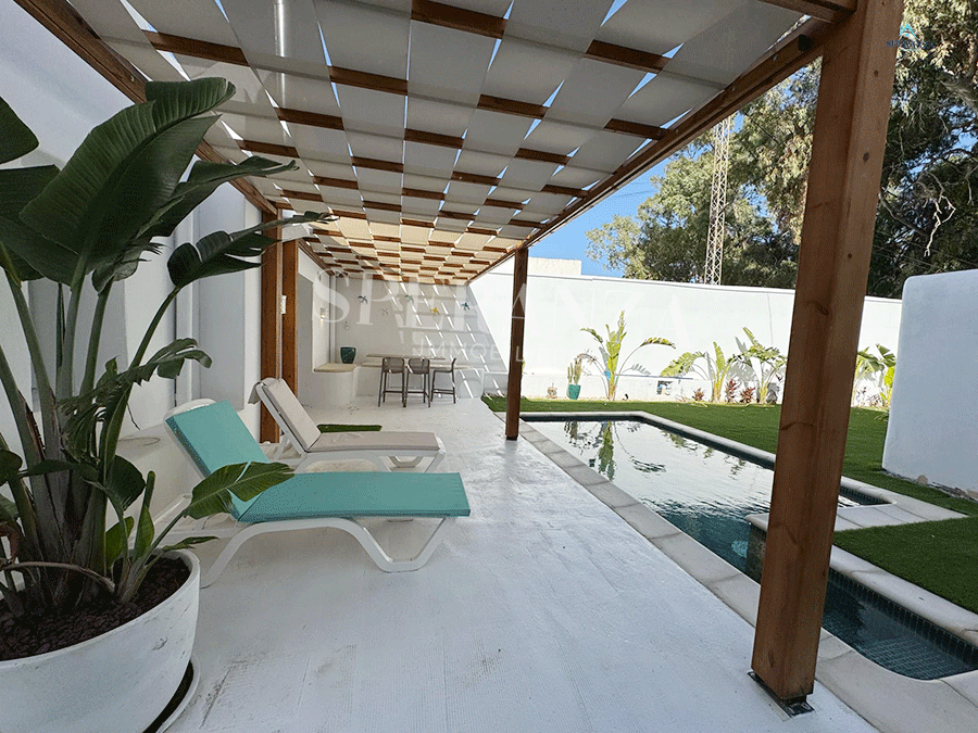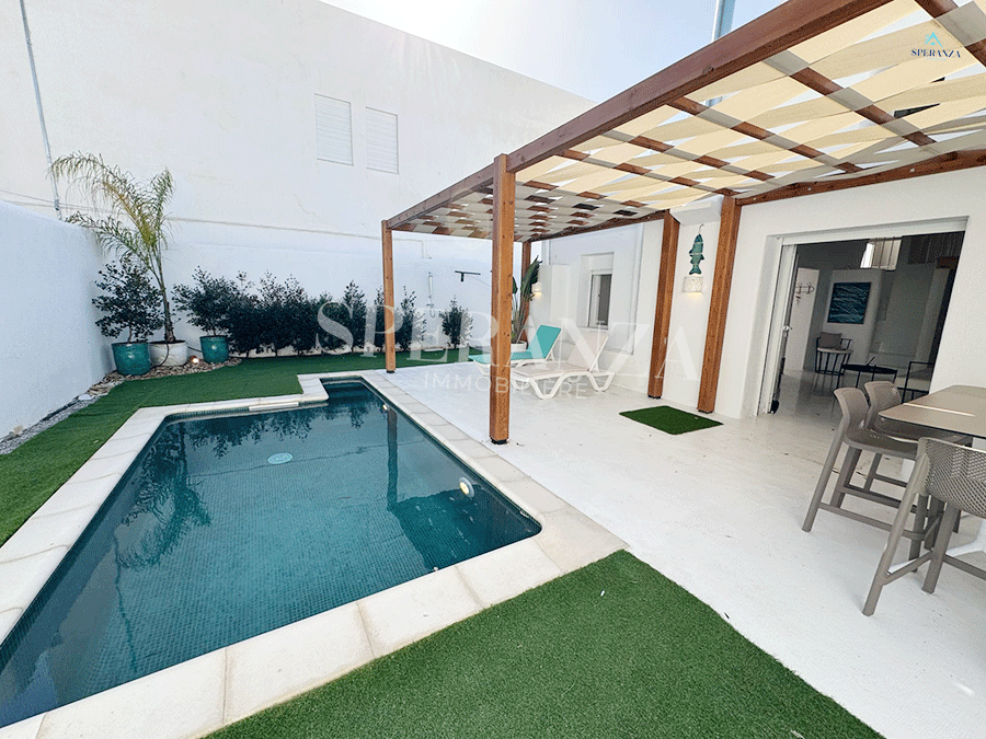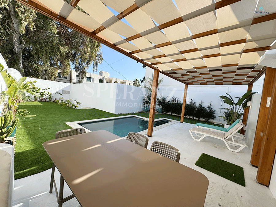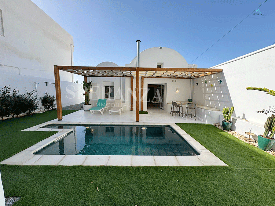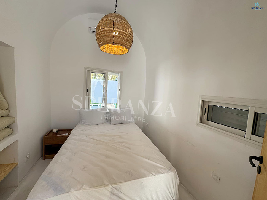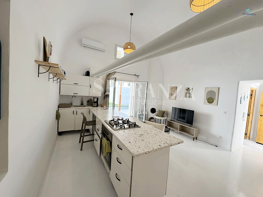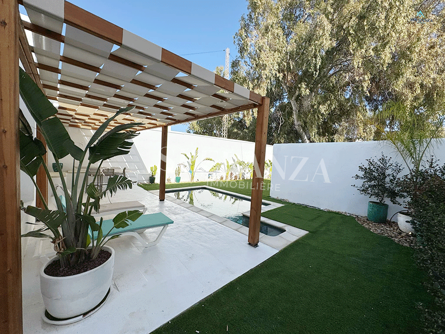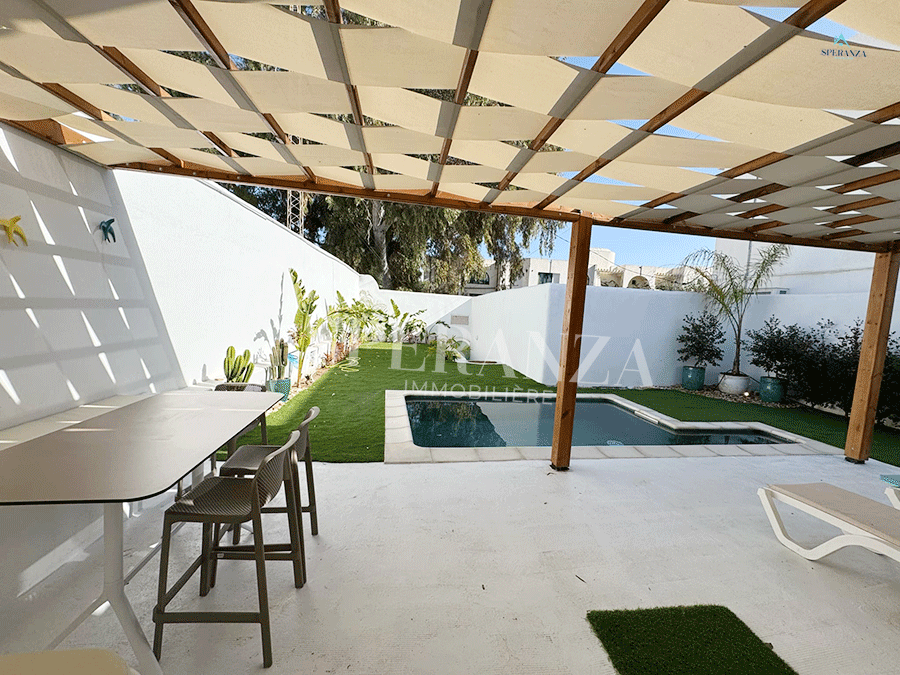 تقترح شركة Speranza immobilière Hammamet زيارة فيلا RDC التي تقع في مركز الحمامات. تتميز هذه الفيلا بطرازها الحديث والأرابيسك. يتكون الجزء اليومي بشكل أساسي من صالون مضيء ومطبخ منسق بمساحات واسعة وإضاءة رائعة على نوافذه توفر رؤية على الحديقة، وغرفة مياه للمدعوين، ويتم تشكيل الجزء الليلي من خلال جناح الوالدين وغرفة للأريكة مع الملابس .L'escalier nous méne au 1er étage qui est composé par un séjour .