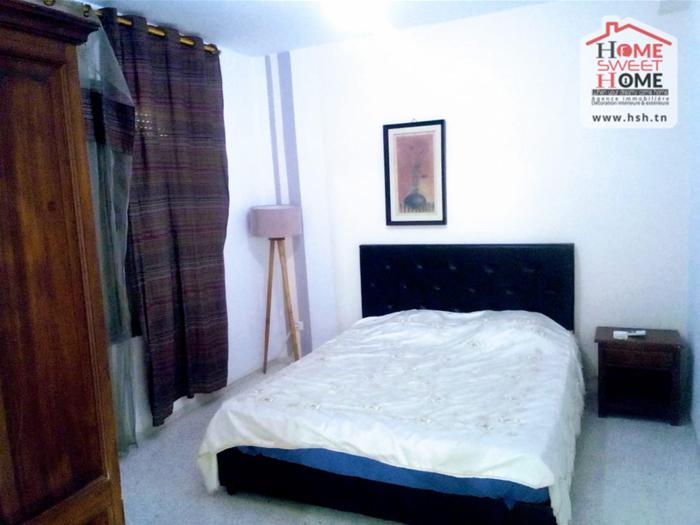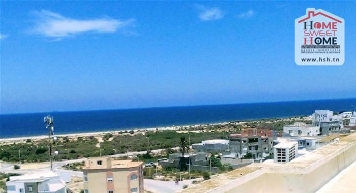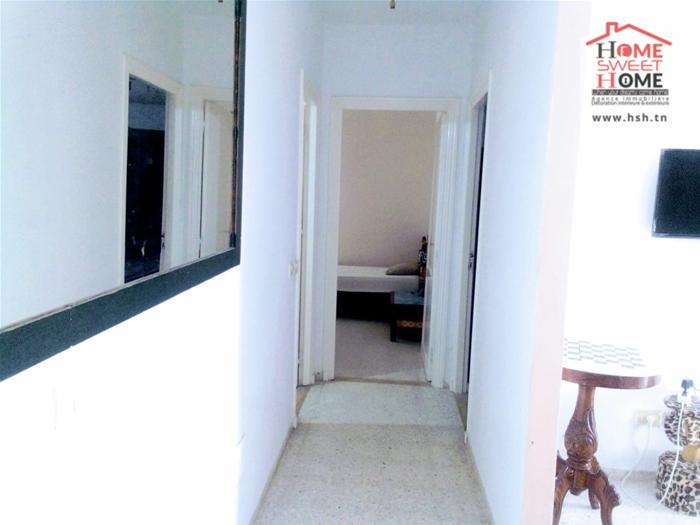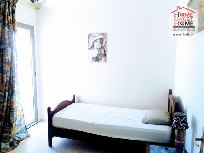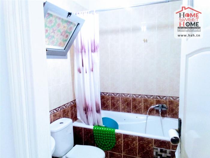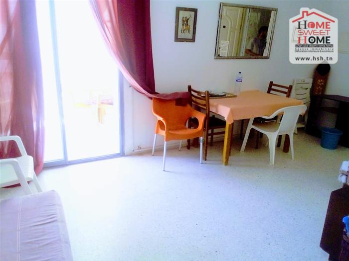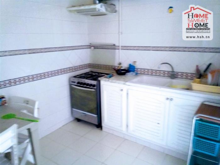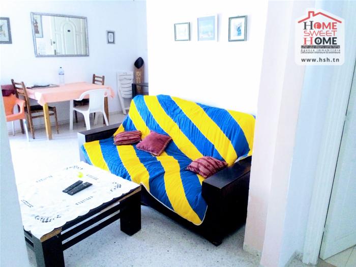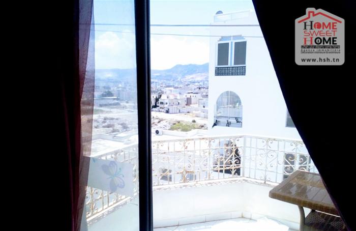 Un appartement S 2 meublé, situé au 5 éme étage d'une résidence sécurisée avec ascenseur à Borj Cedria. À l'entrée, sur un salon avec balcon, une cuisine équipée, deux chambres et une salle de bain. À l'extérieur, sur une place de parking.