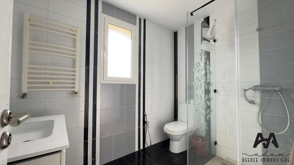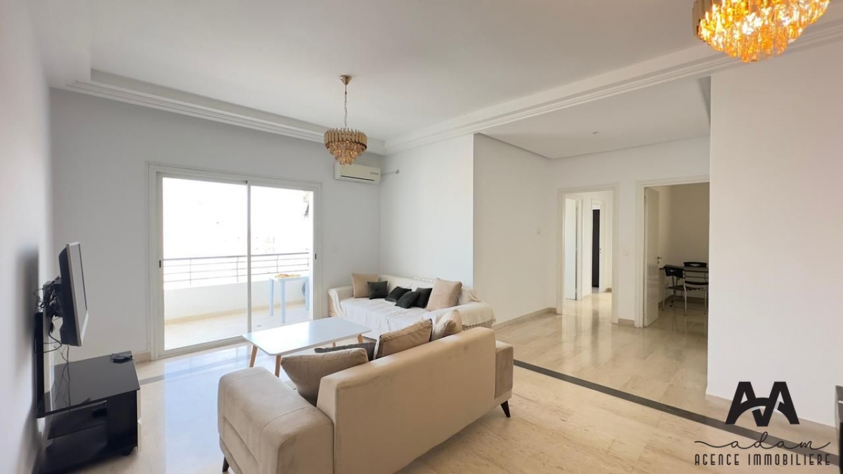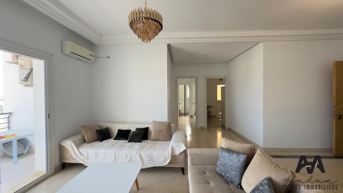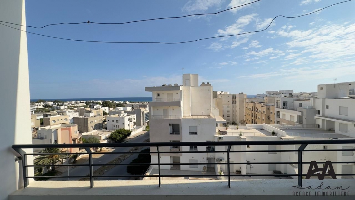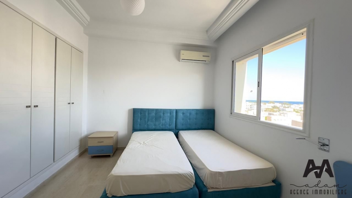 Un appartement S+2 meublé, situé au 6ème étage d'une résidence moderne, sécurisée et gardée 24h/24, avec ascenseur double, terrasse vue sur mer et place de parking au sous-sol.