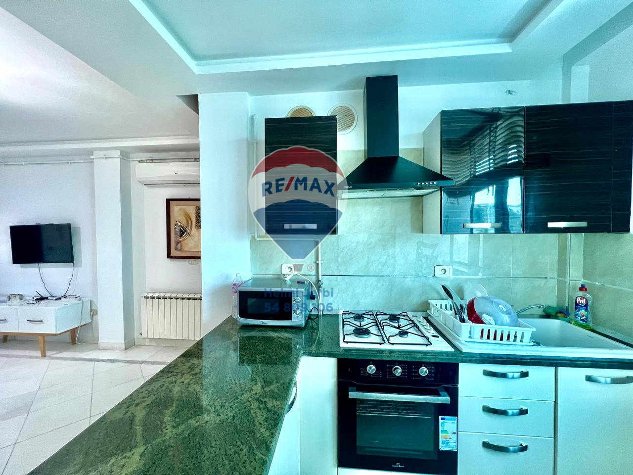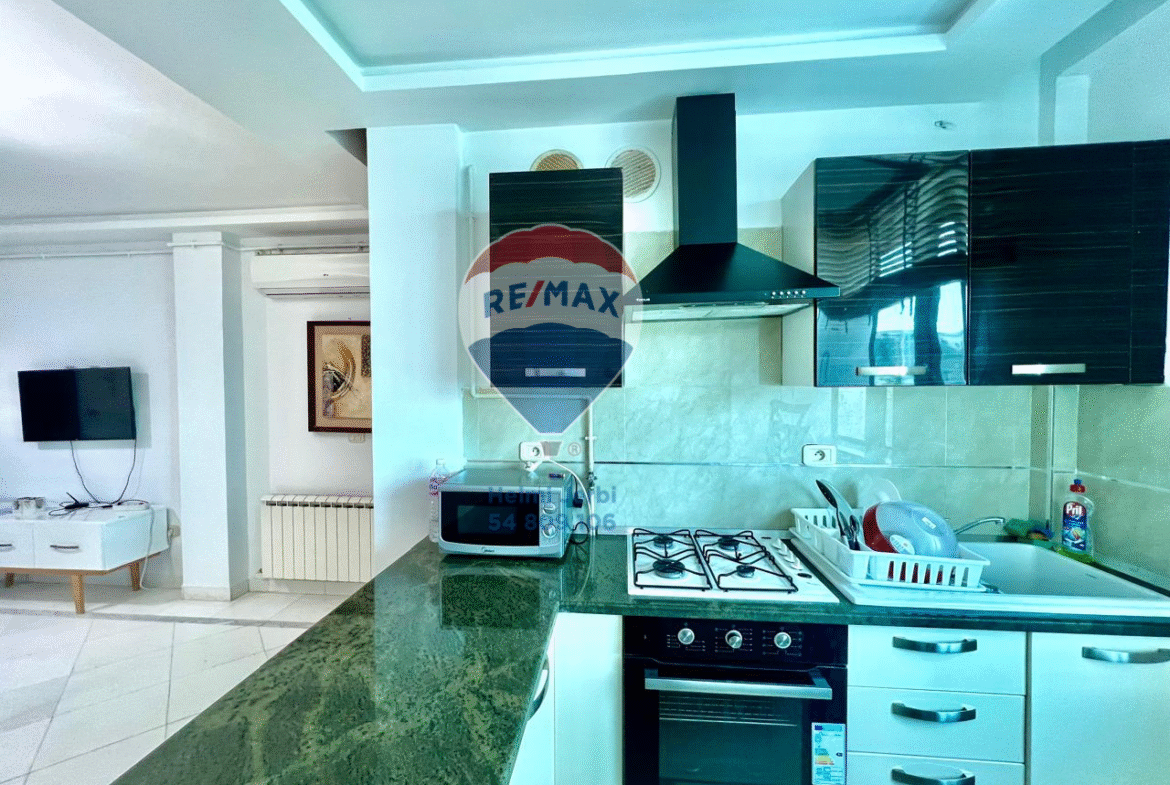 -Une cuisine américaine qui comporte plusieurs éléments de rangements et équipée de Four, plaque électrique et hotte.