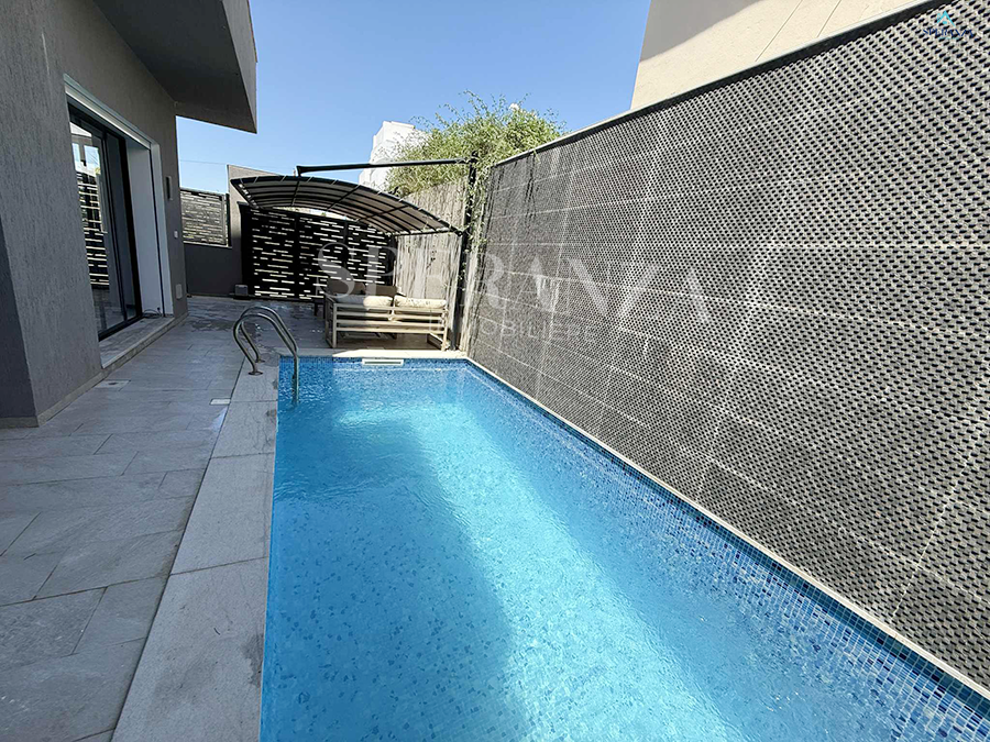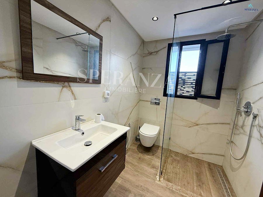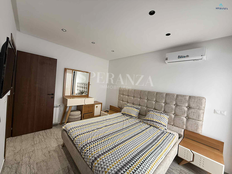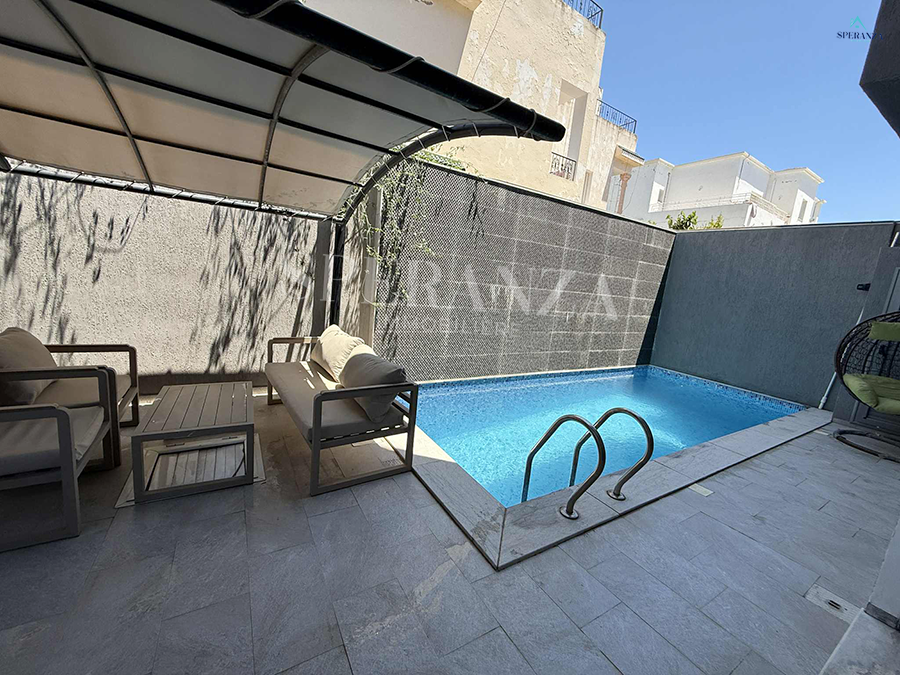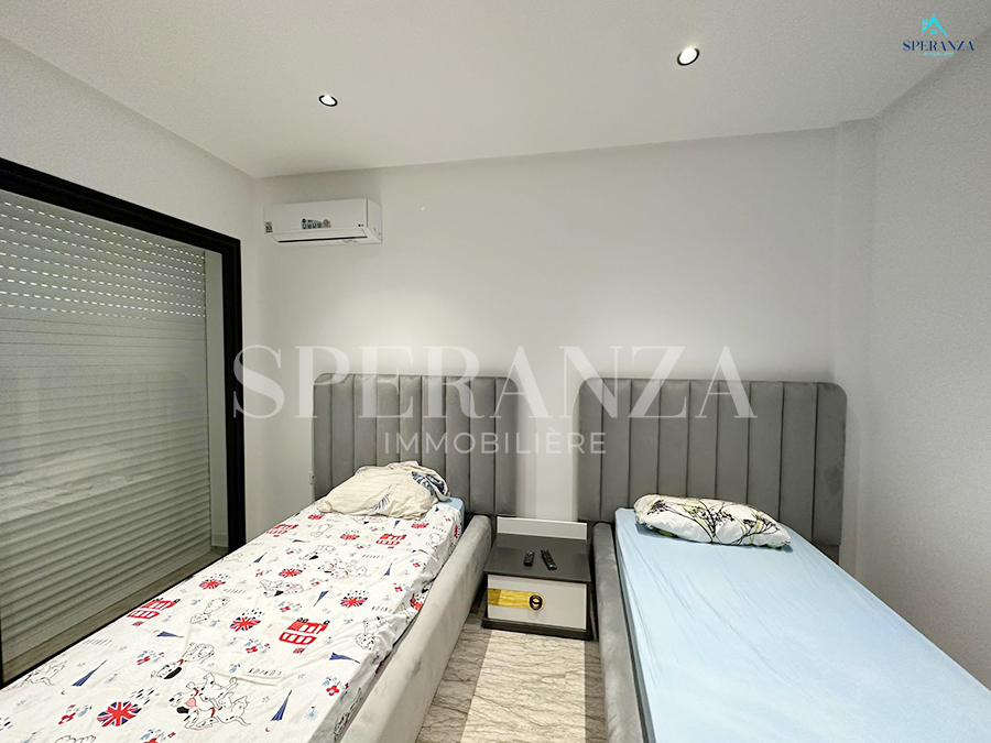 Speranza immobilière Hammamet vous propose à la location annuelle ,cet appartement RDC qui se situe à Hammamet,dans une résidence calme et sécurisée.L'entrée principale donne sur une piscine.Il se compose par une kitchenette aménagée par les éléments de rangement nécessaires,salle d'eau. Le compartiment nuit dispose de deux chambres à coucher et d'une suite parentale. et un Garage .