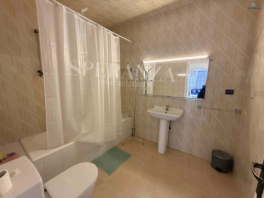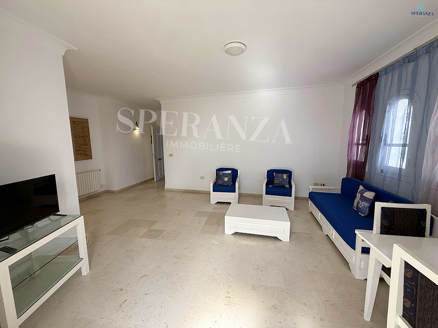 Speranza immobilière Hammamet vous propose à la location annuelle Cet appartement au 1ér étage, proche de toutes commodités à Hammamet nord ,dans un quartier calme et sécurisé. L'entrée principale possède un salon lumineux, une cuisine équipée et bien aménagée et une salle de bain. La partie nuit se compose de deux chambres à coucher et une terrasse.