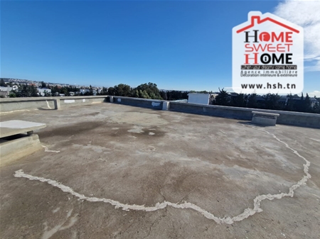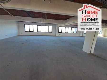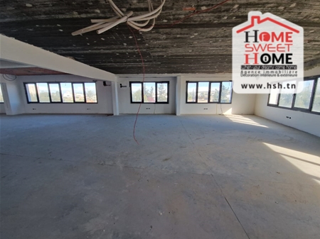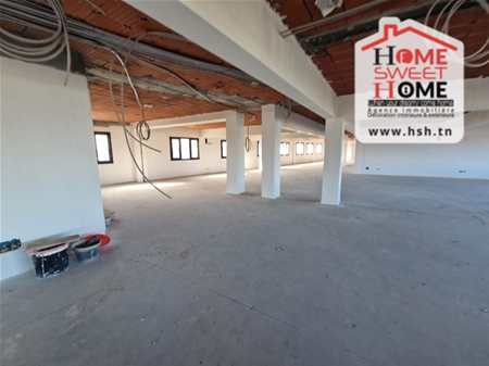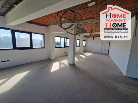 Un local commercial open space au 1er étage d'une superficie de 750m² avec 4m d'hauteur situé à La Soukra. Il se compose de 2 bureaux et d'une salle d'eau. Au 2ème étage, sur une terrasse d'une superficie de 300 m².