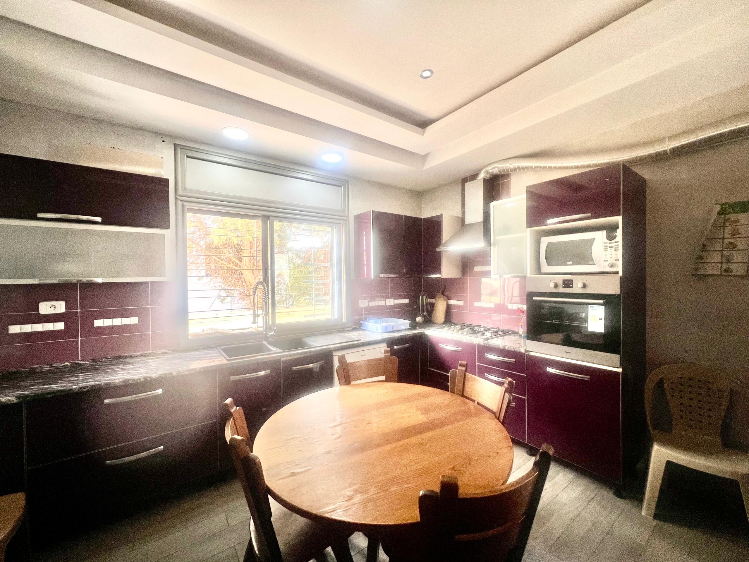 -Une cuisine spacieuse trés bien équipée : hautes, frigidaire, plaque électrique, Table déjeuner , chaises . machine à laver micro-ondes et pour couronner le tout plusieurs éléments de rangement qui comportent vaisselle et ustensiles.