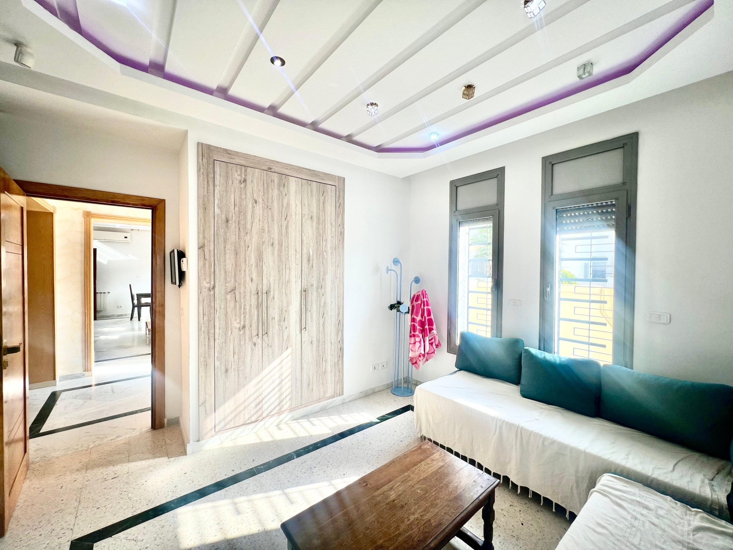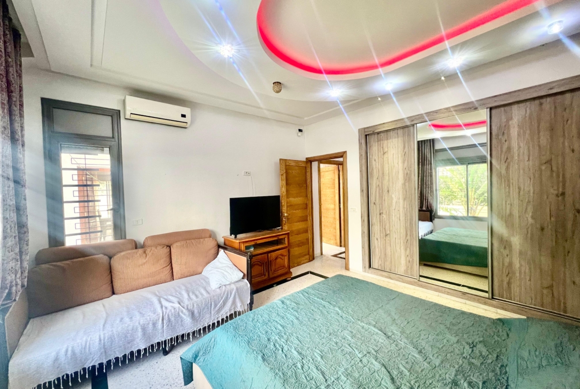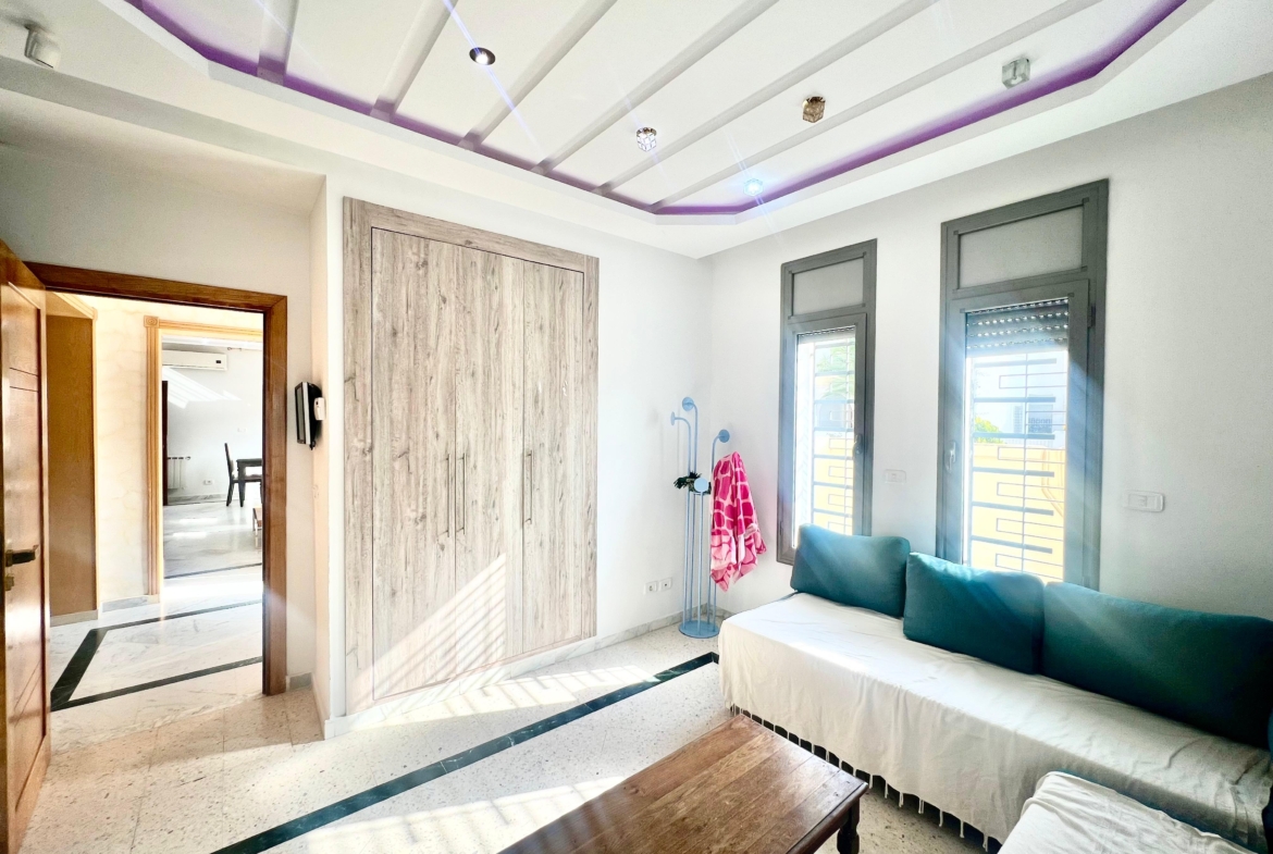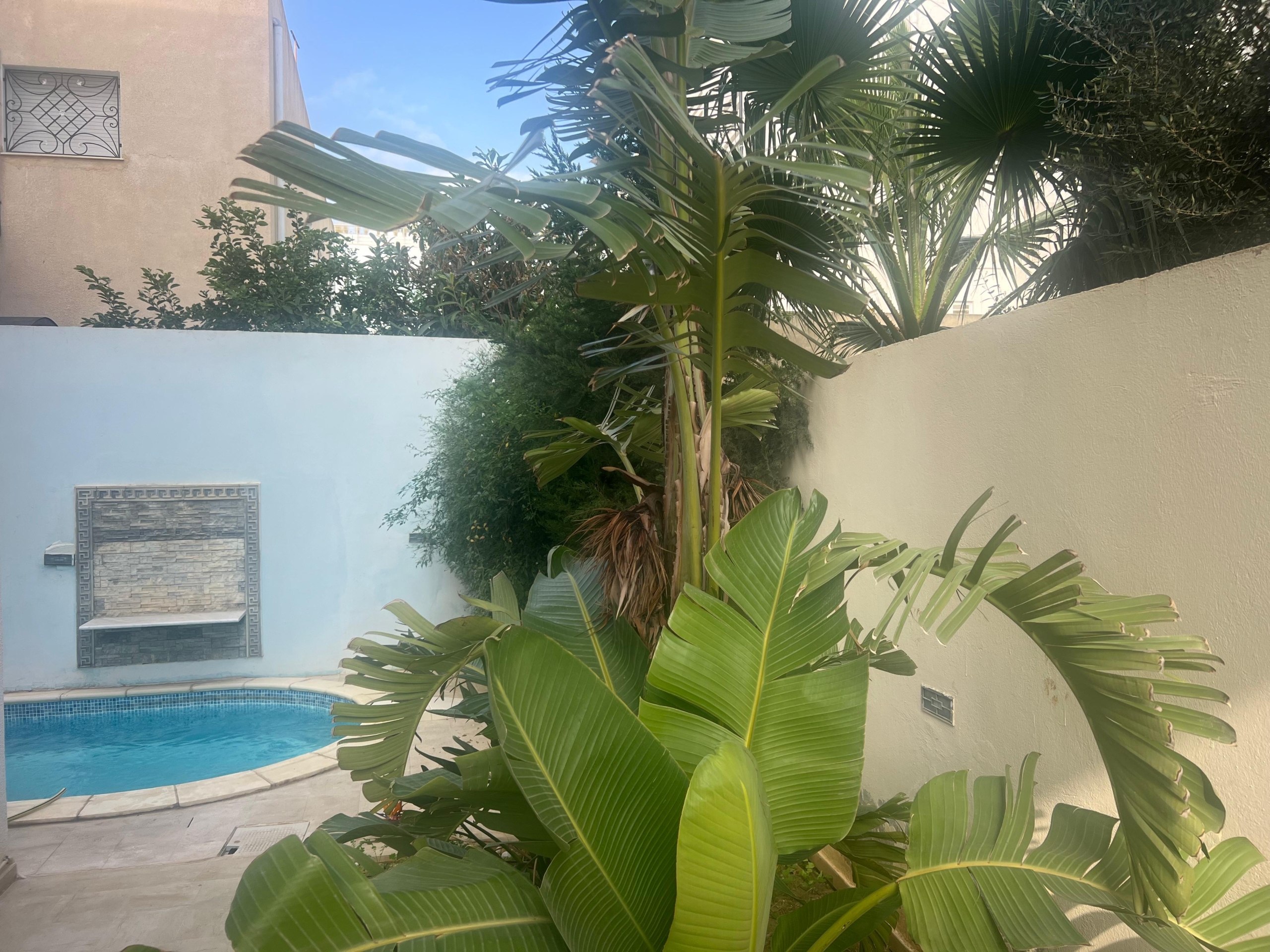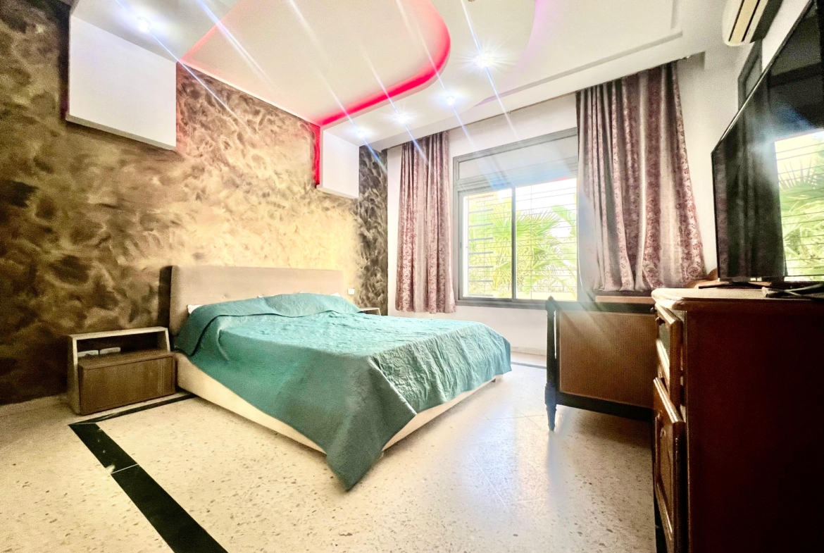 On vous propose à la location un S+3 au RDC ,sans vis à vis , avec accès à une piscine COLLECTIVE (partagée entre 3 appartements seulement) richement meublé dans un R+2 aux Jardins de Carthage .