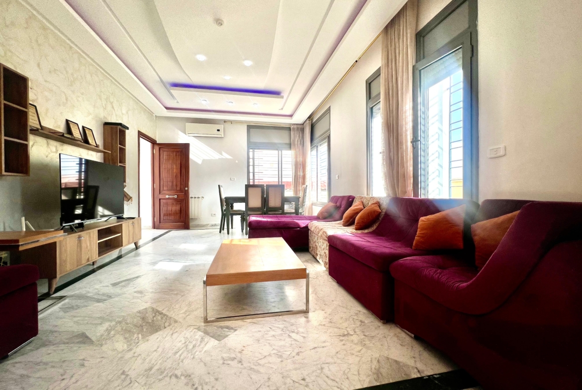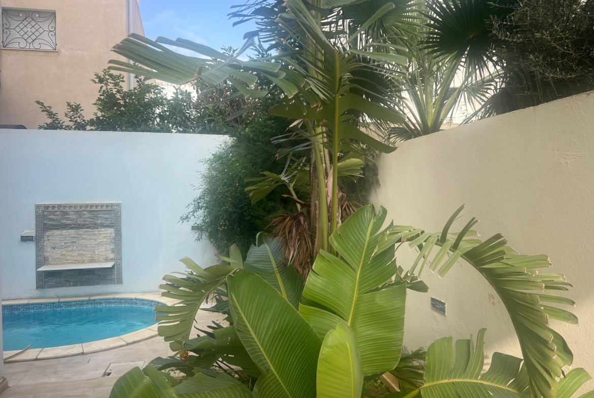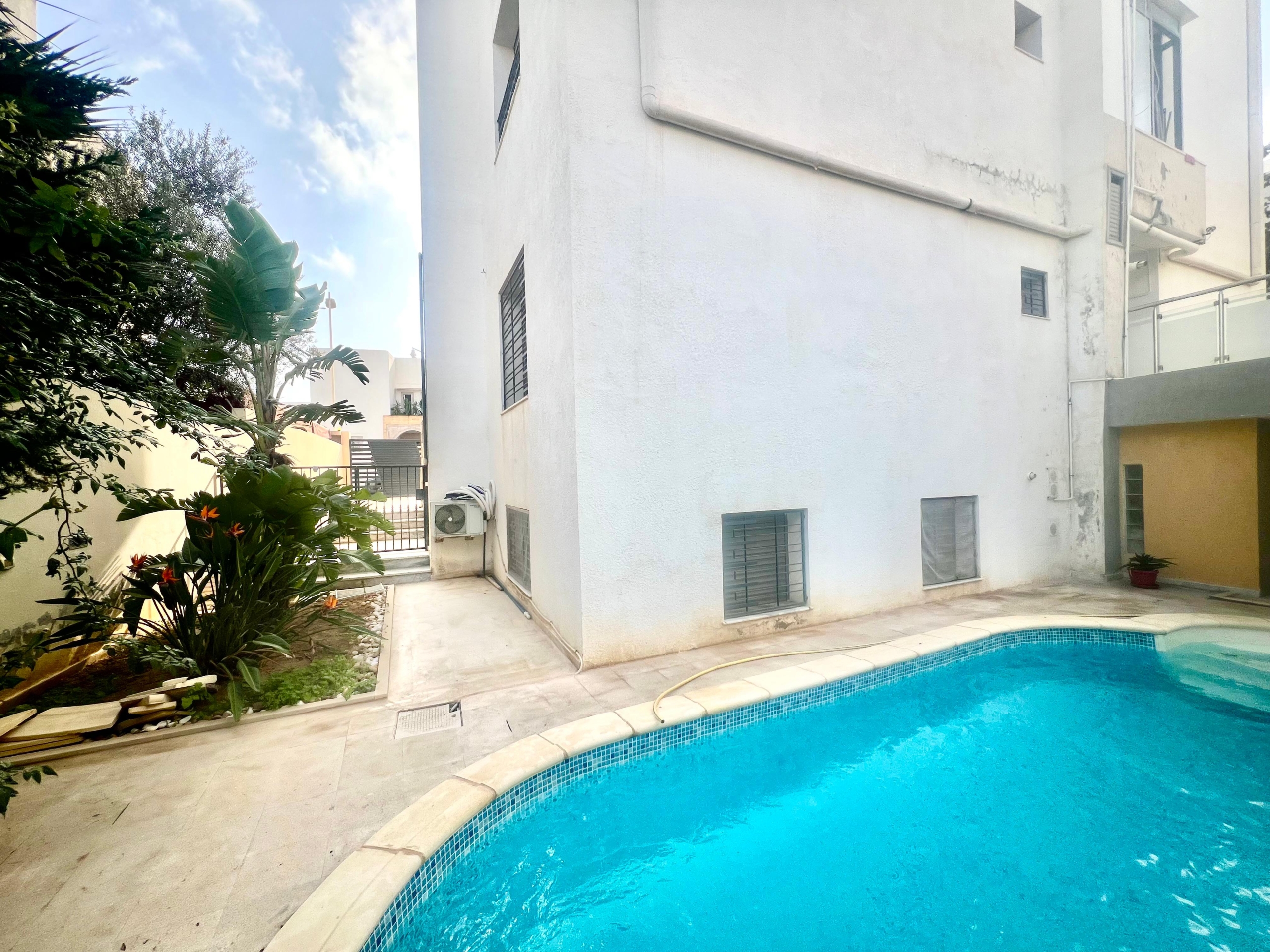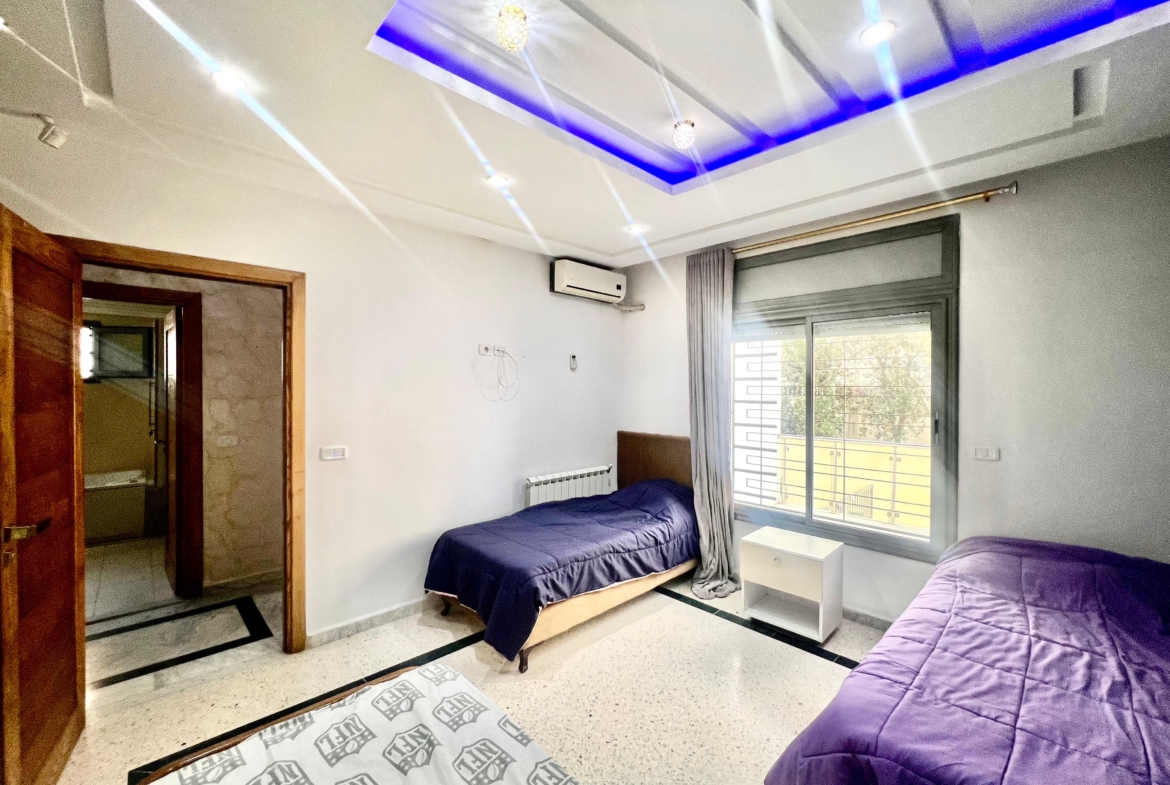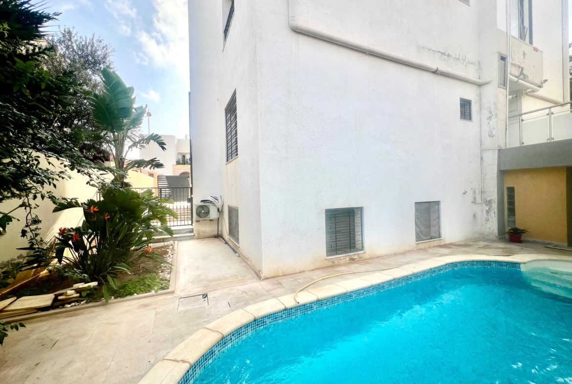 On vous propose à la location un S+3 au RDC ,sans vis à vis , avec accès à une piscine COLLECTIVE (partagée entre 3 appartements seulement) richement meublé dans un R+2 aux Jardins de Carthage .