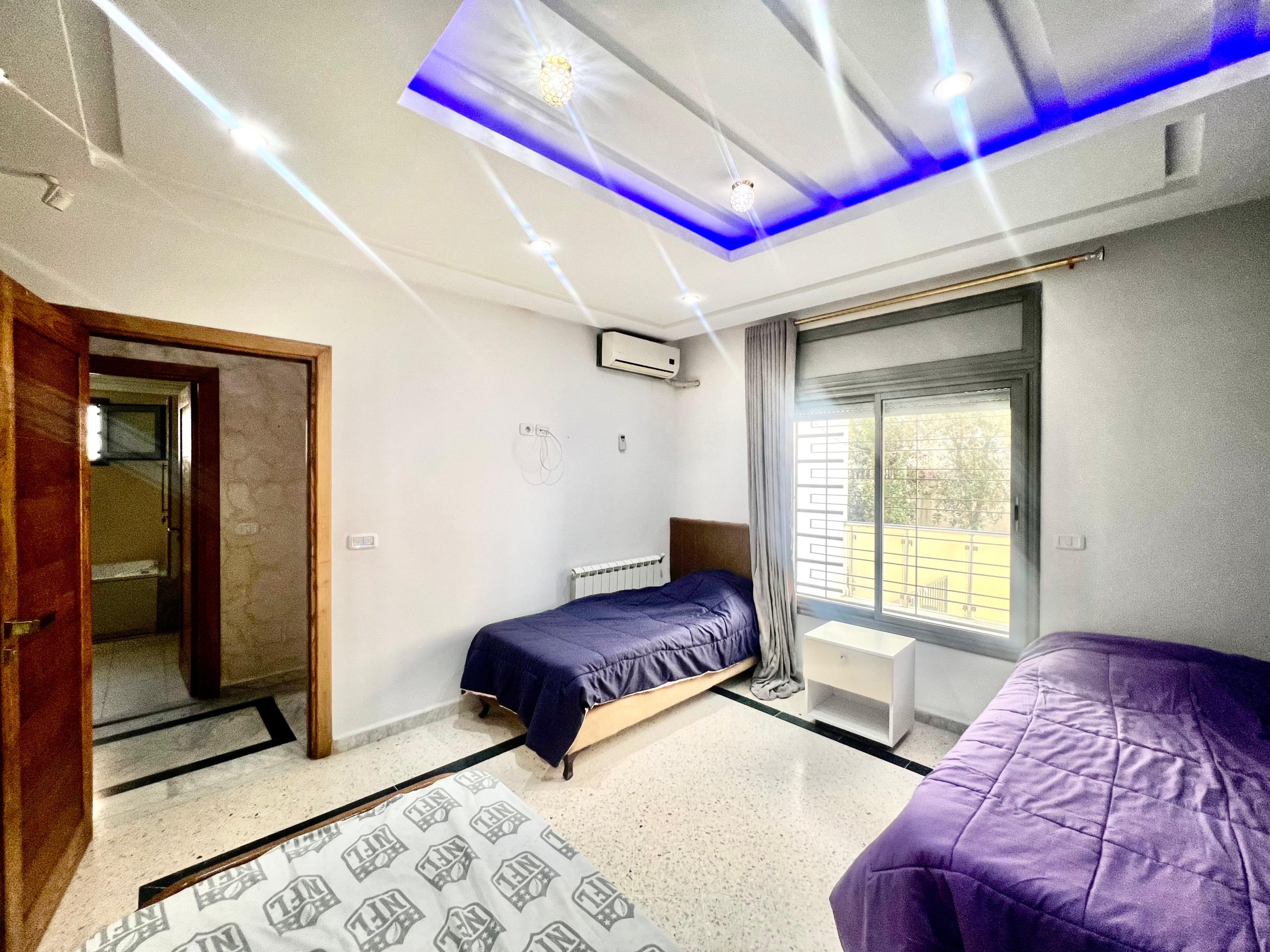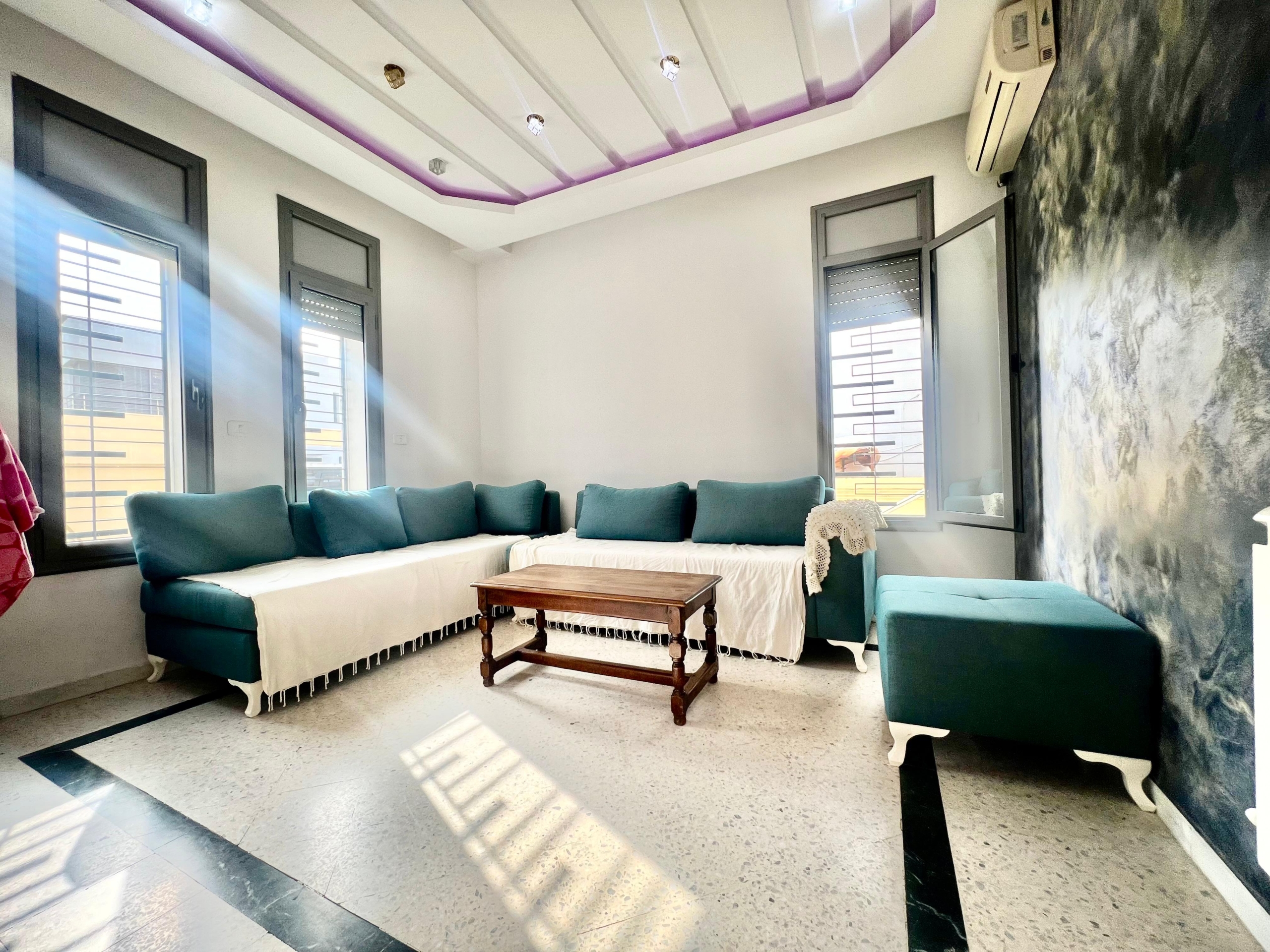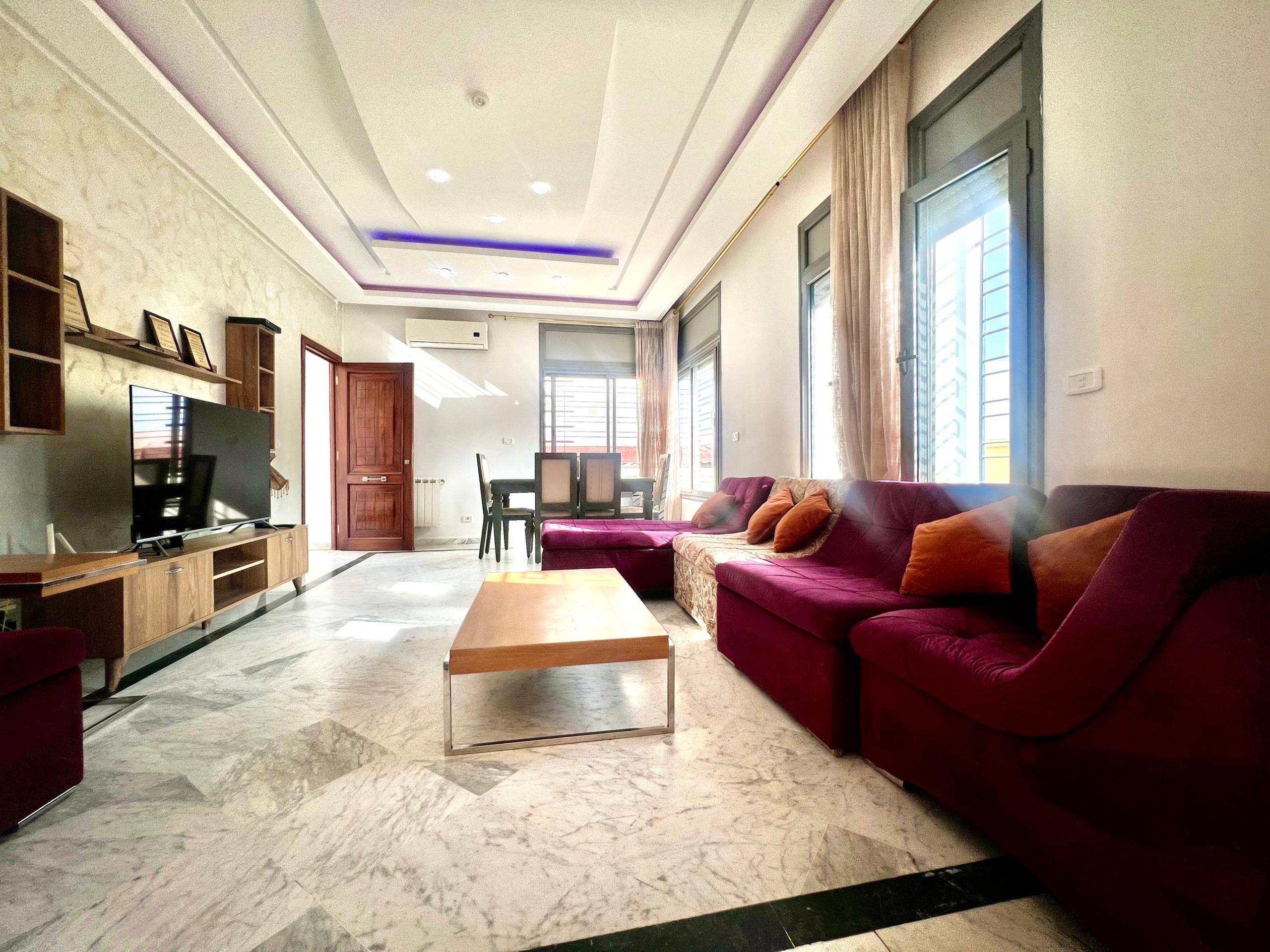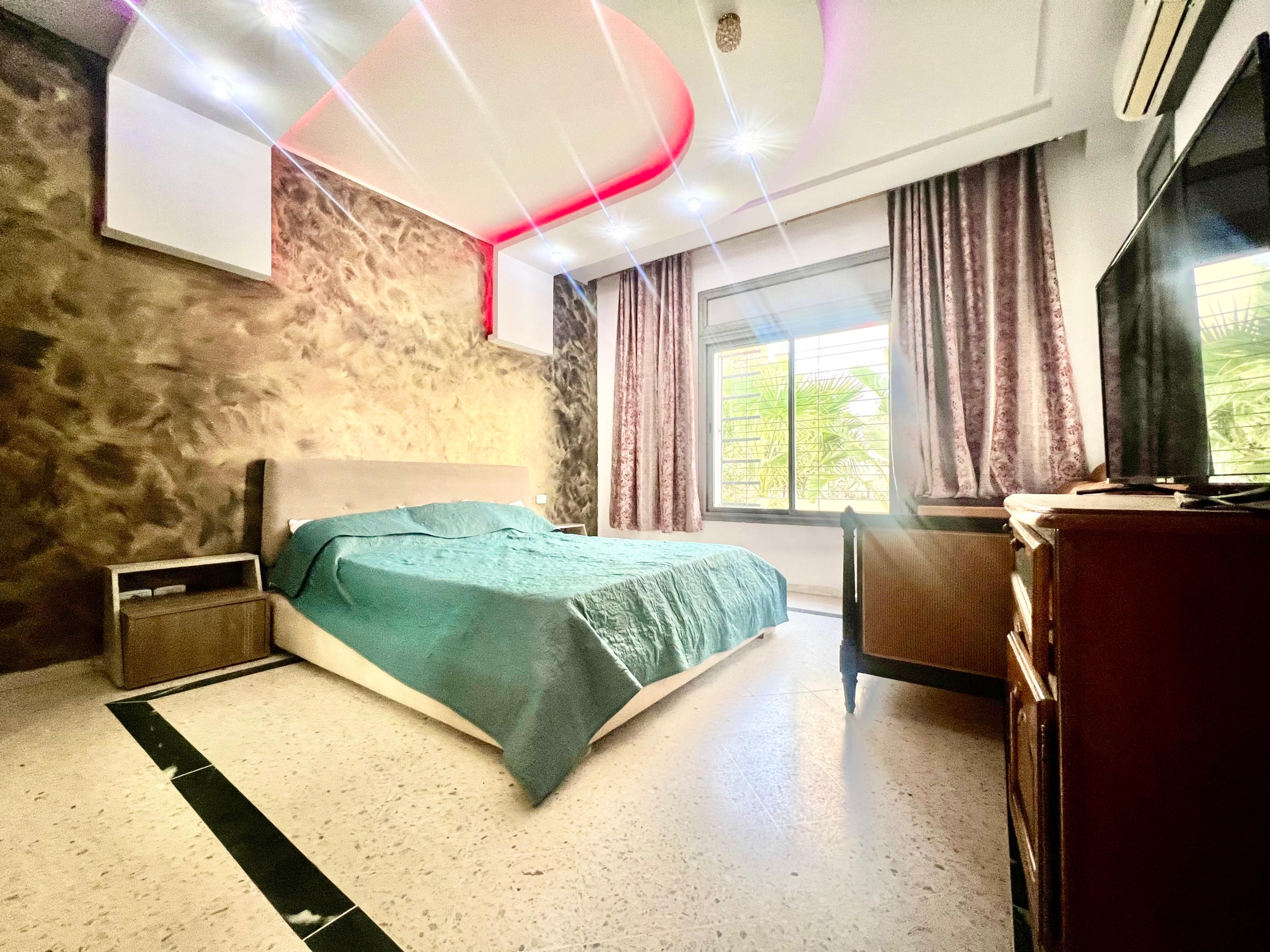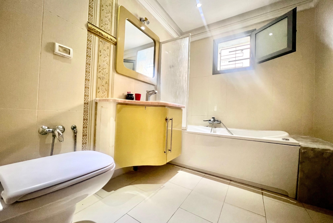 On vous propose à la location un S+3 au RDC ,sans vis à vis , avec accès à une piscine COLLECTIVE (partagée entre 3 appartements seulement) richement meublé dans un R+2 aux Jardins de Carthage .