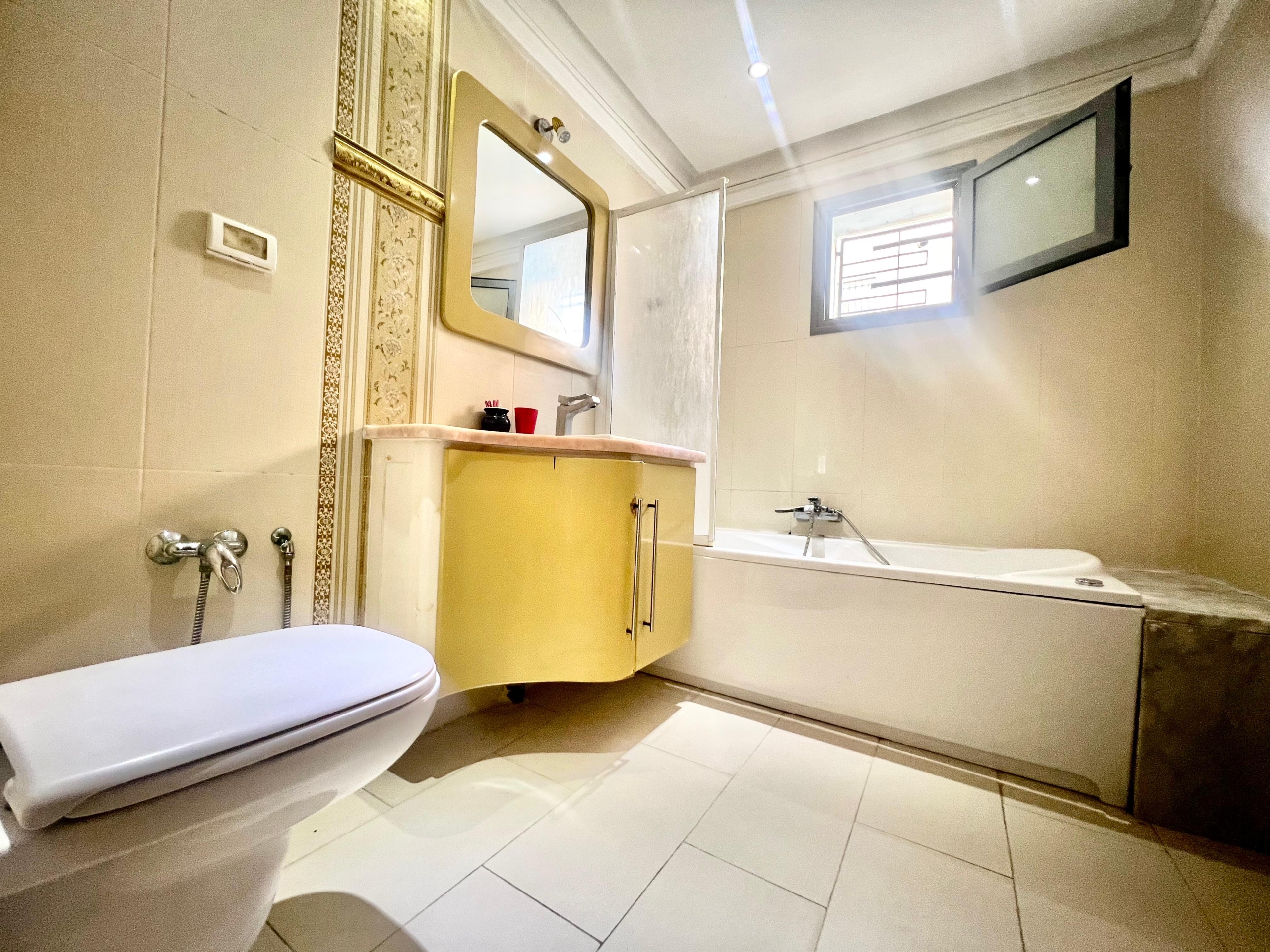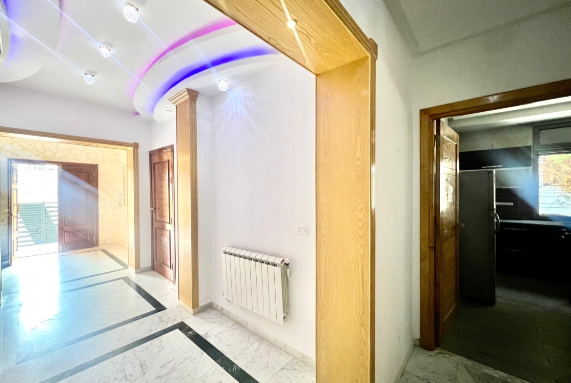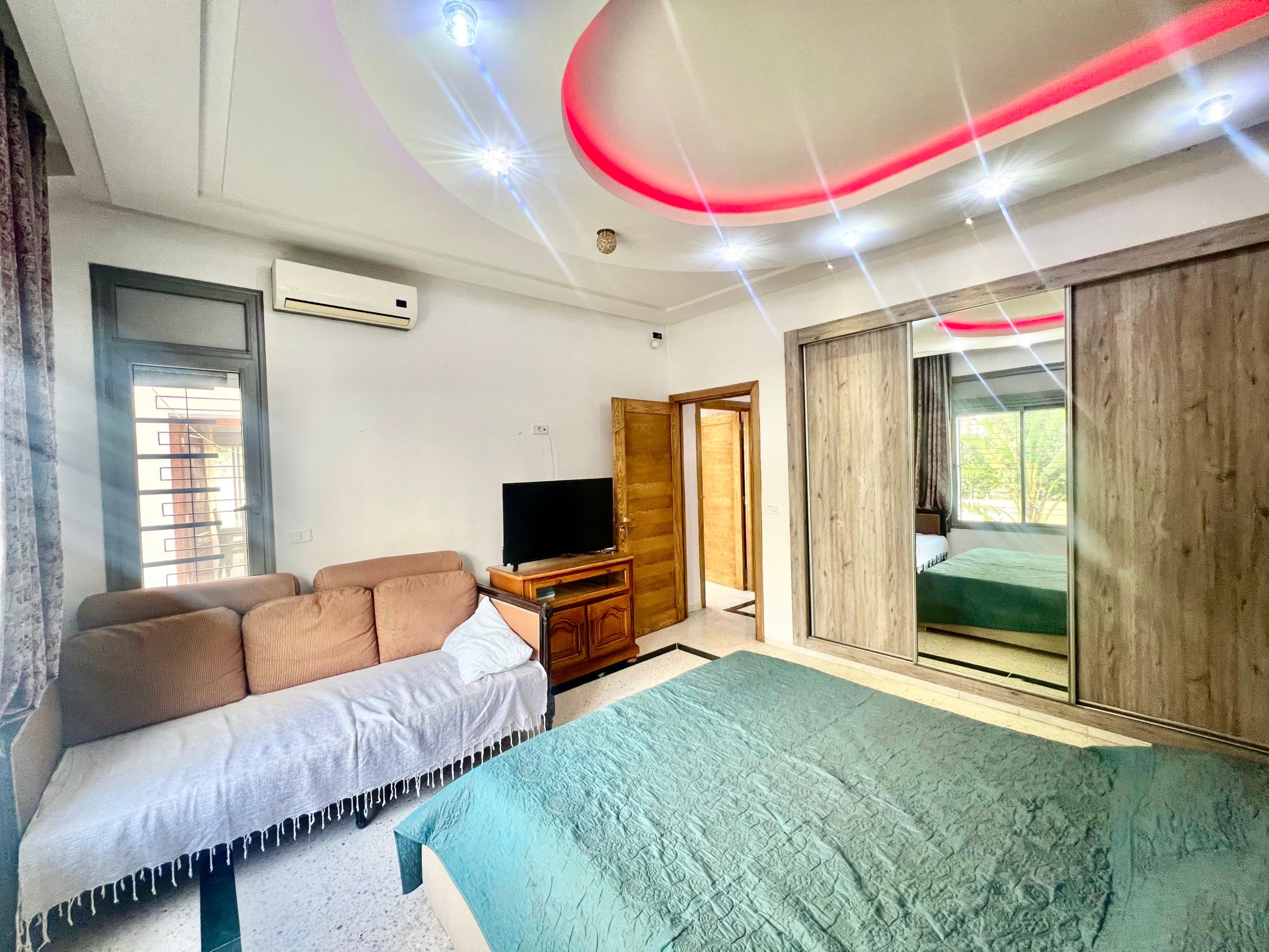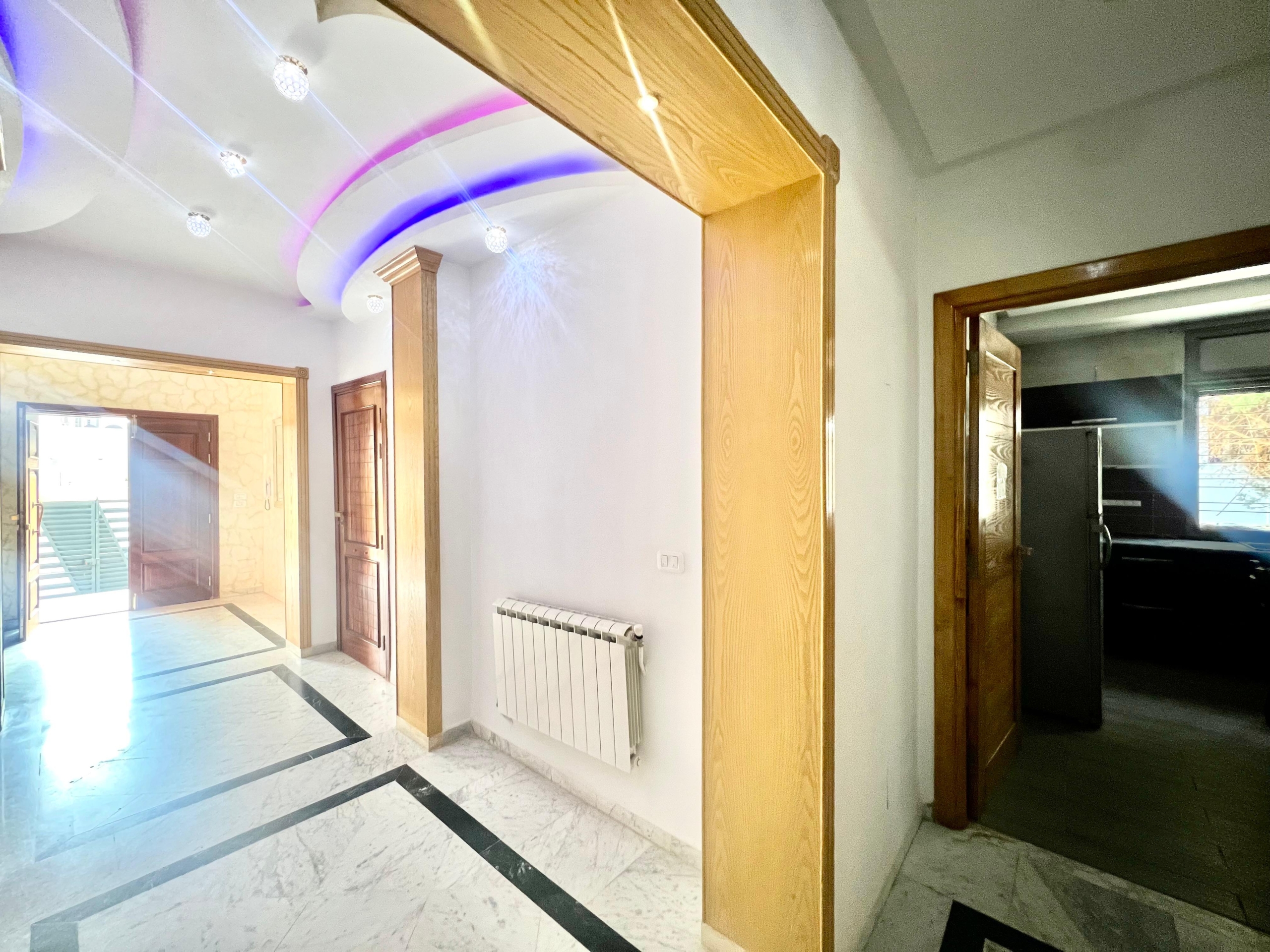 On vous propose à la location un S+3 au RDC ,sans vis à vis , avec accès à une piscine COLLECTIVE (partagée entre 3 appartements seulement) richement meublé dans un R+2 aux Jardins de Carthage .