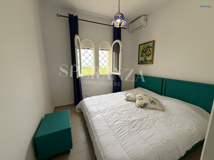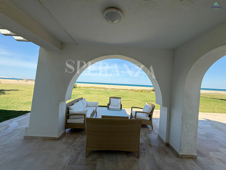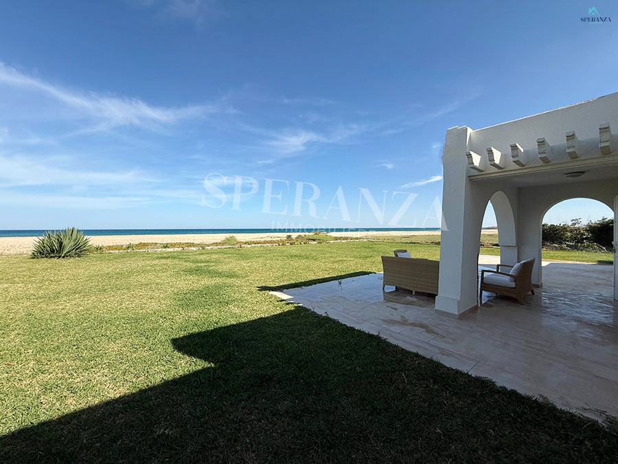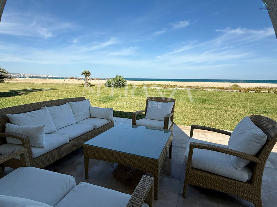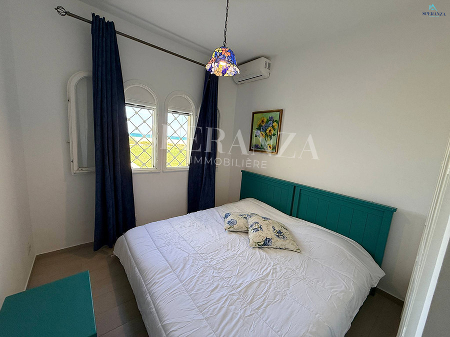 Speranza immobilière Hammamet vous propose à la location vacances cette Villa pieds dans l'eau située à Hammamet sud. Elle est occupée par une piscine collective, un jardin gazonné qui offre plusieurs espaces de détente. La partie jour est composée principalement d'un salon spacieux, d'une cuisine disposant de plusieurs éléments de rangements et d'une salle d'eau pour les invités. Quant à la partie nuit dispose d'une suite parentale,deux chambres à coucher, La villa dispose aussi d'une petite chambre pour la femme de ménage.Et une salle d'eau,ainsi q'une terrasse vue sur mer. Et une place de parking.