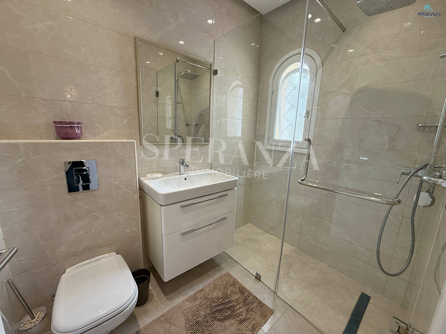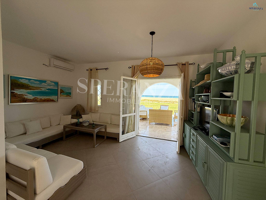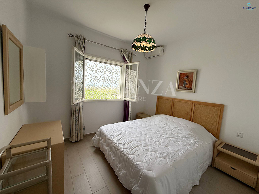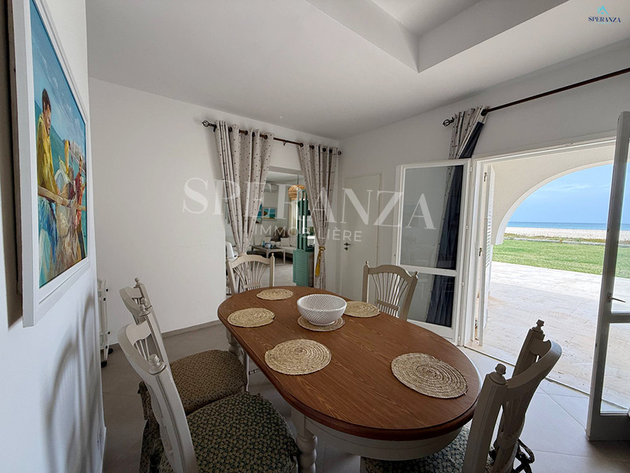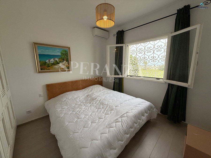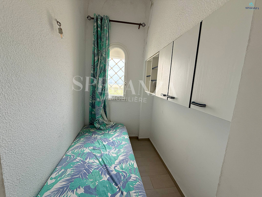 Speranza immobilière Hammamet vous propose à la location vacances cette Villa pieds dans l'eau située à Hammamet sud. Elle est occupée par une piscine collective, un jardin gazonné qui offre plusieurs espaces de détente. La partie jour est composée principalement d'un salon spacieux, d'une cuisine disposant de plusieurs éléments de rangements et d'une salle d'eau pour les invités. Quant à la partie nuit dispose d'une suite parentale,deux chambres à coucher, La villa dispose aussi d'une petite chambre pour la femme de ménage.Et une salle d'eau,ainsi q'une terrasse vue sur mer. Et une place de parking.