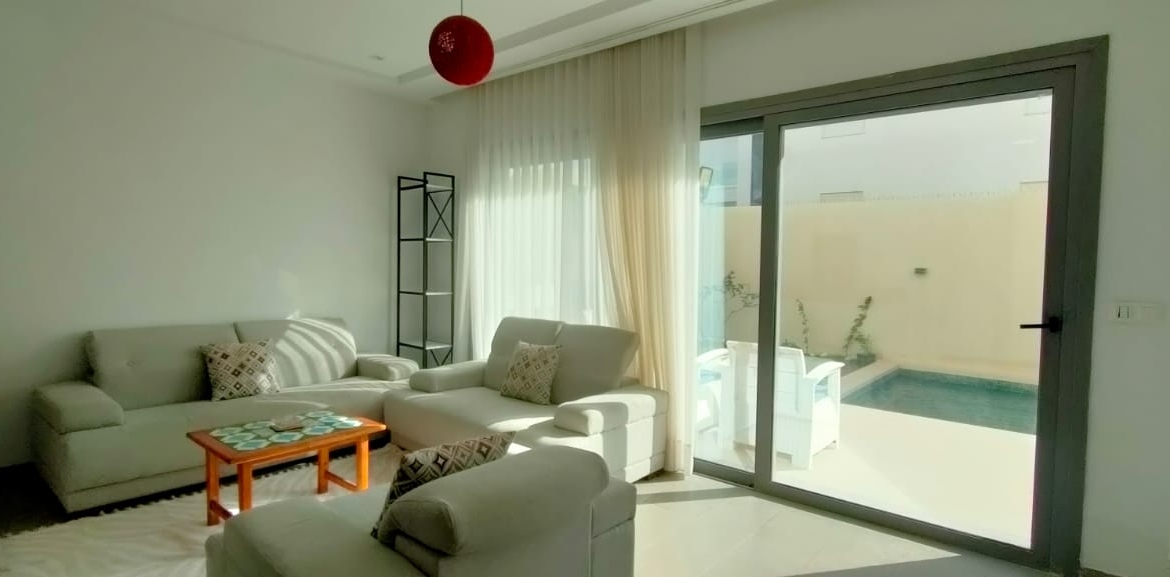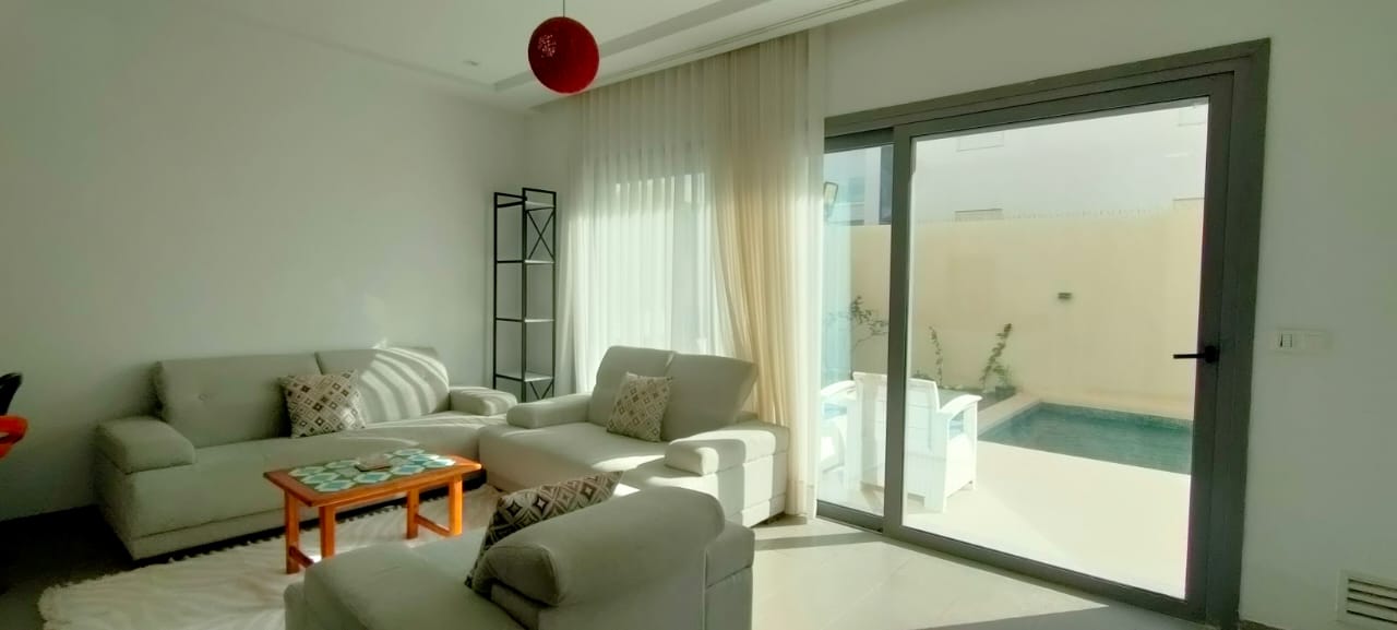 – Un salon qui donne sur la piscine et terrasse