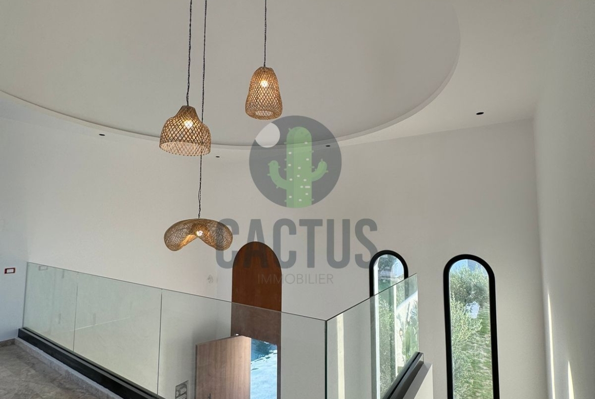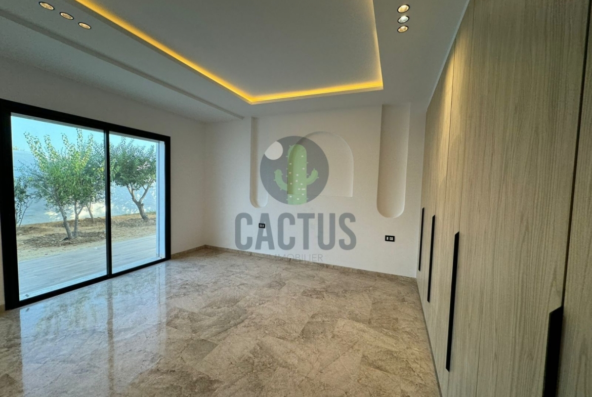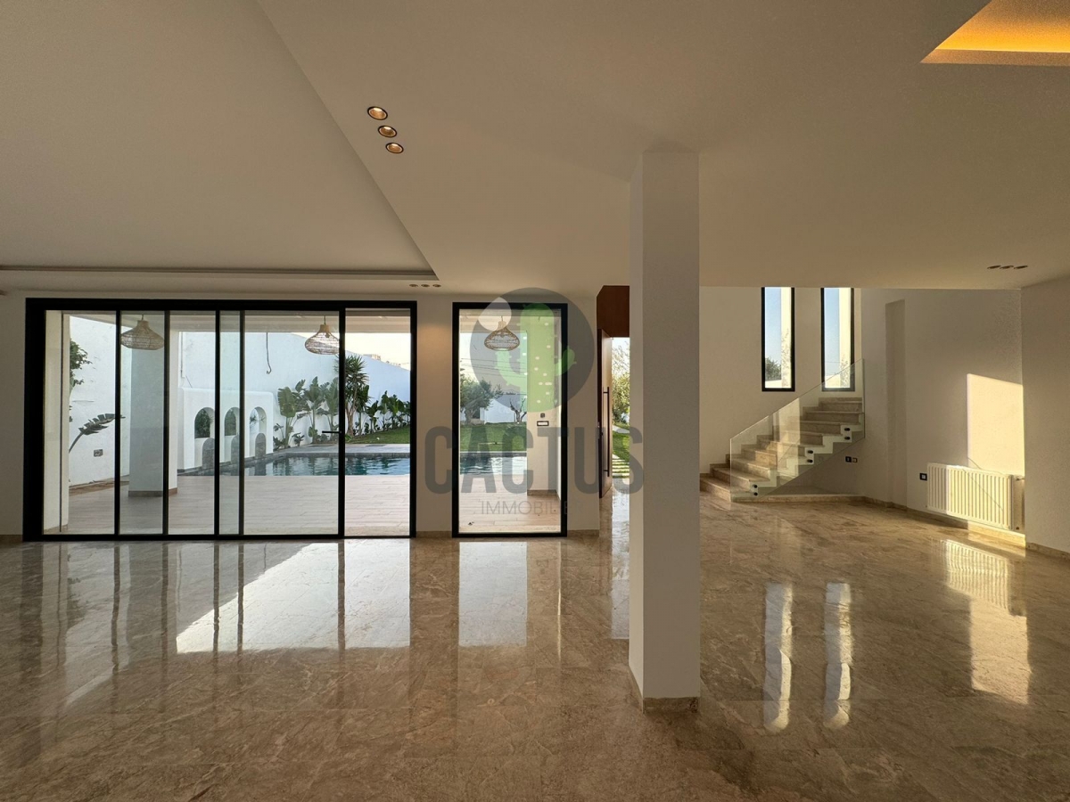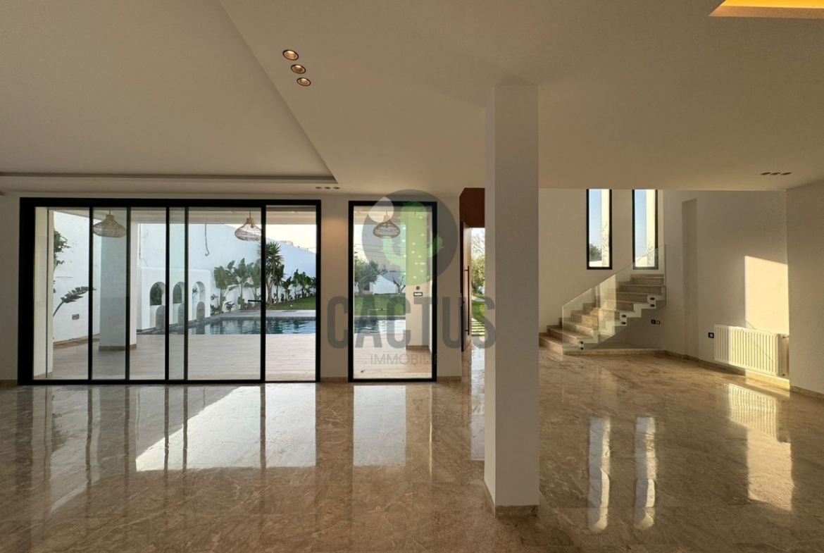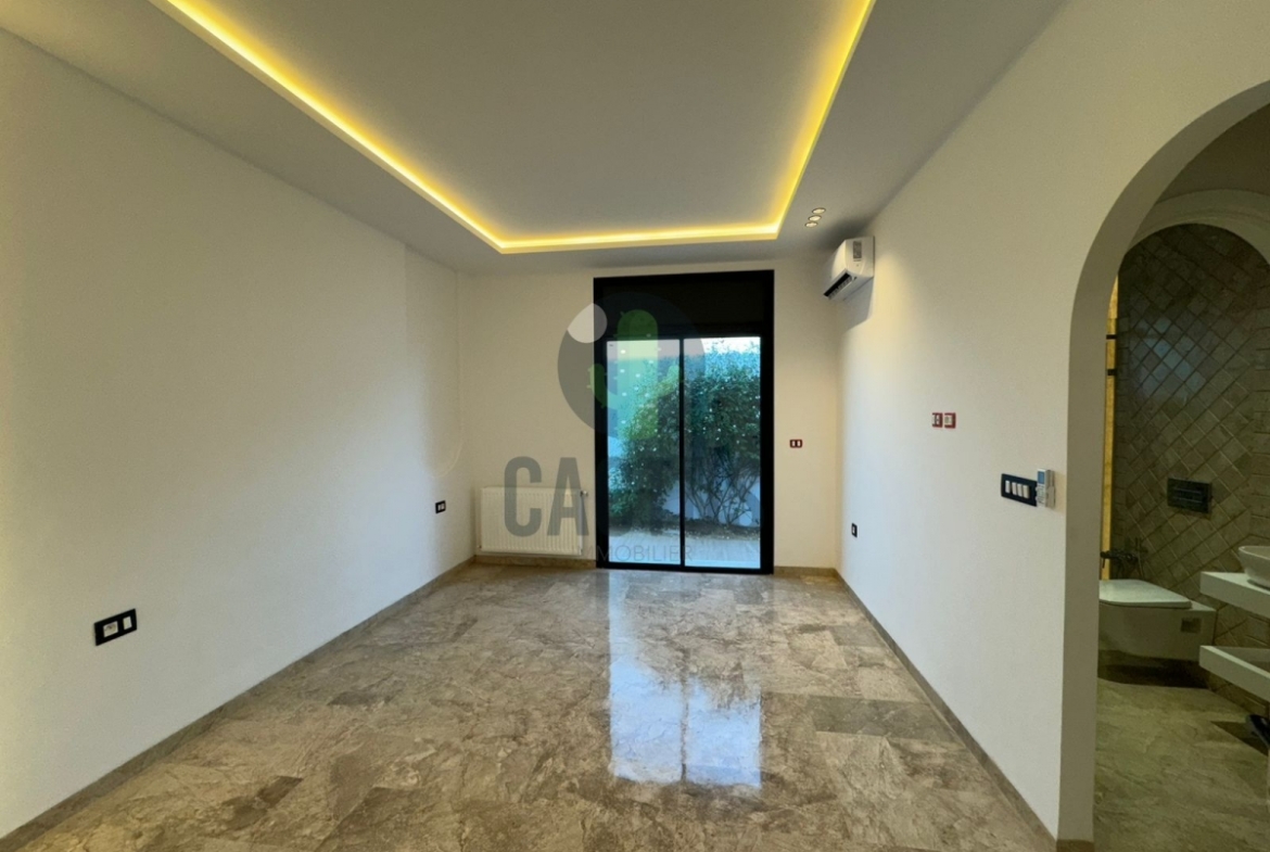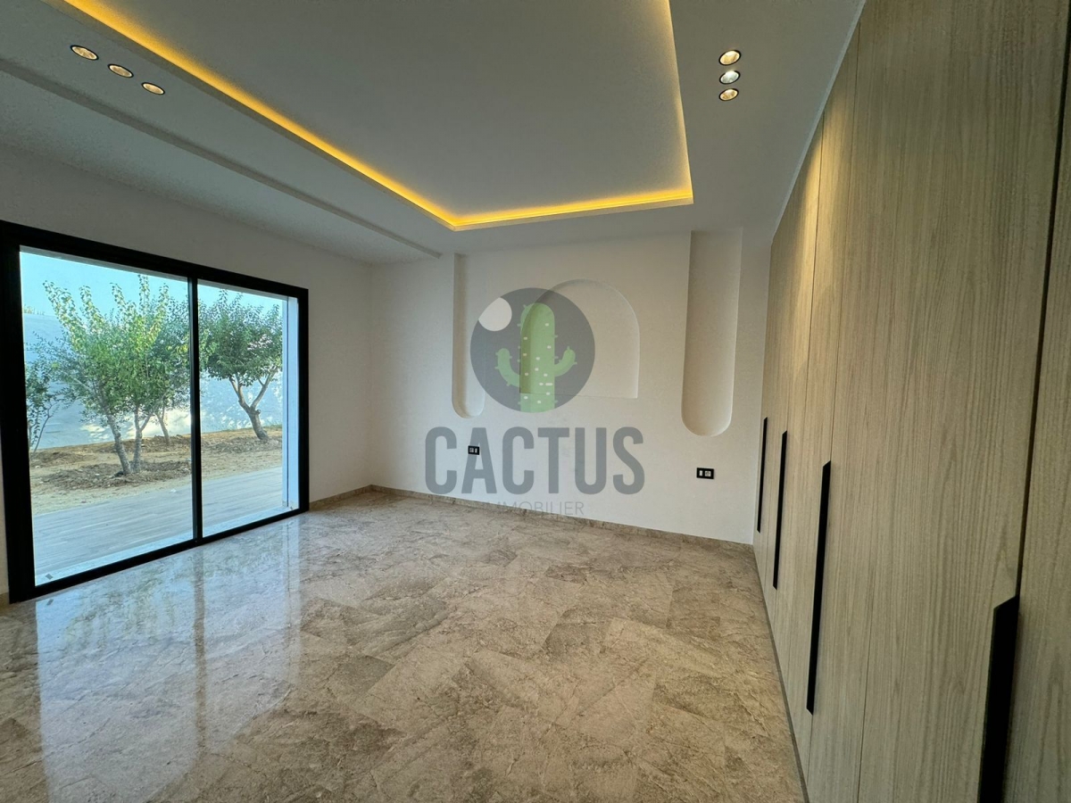 A l'entrée on trouve un spacieux salon lumineux exposé en marbre Kadhel ouvrant sur une terrasse complétée par une jolie piscine avec cascade ainsi qu'une cuisine indépendante bien aménagée et équipée (plaque, hotte et four) complétée par un jardin et une salle d'eau pour les invités.