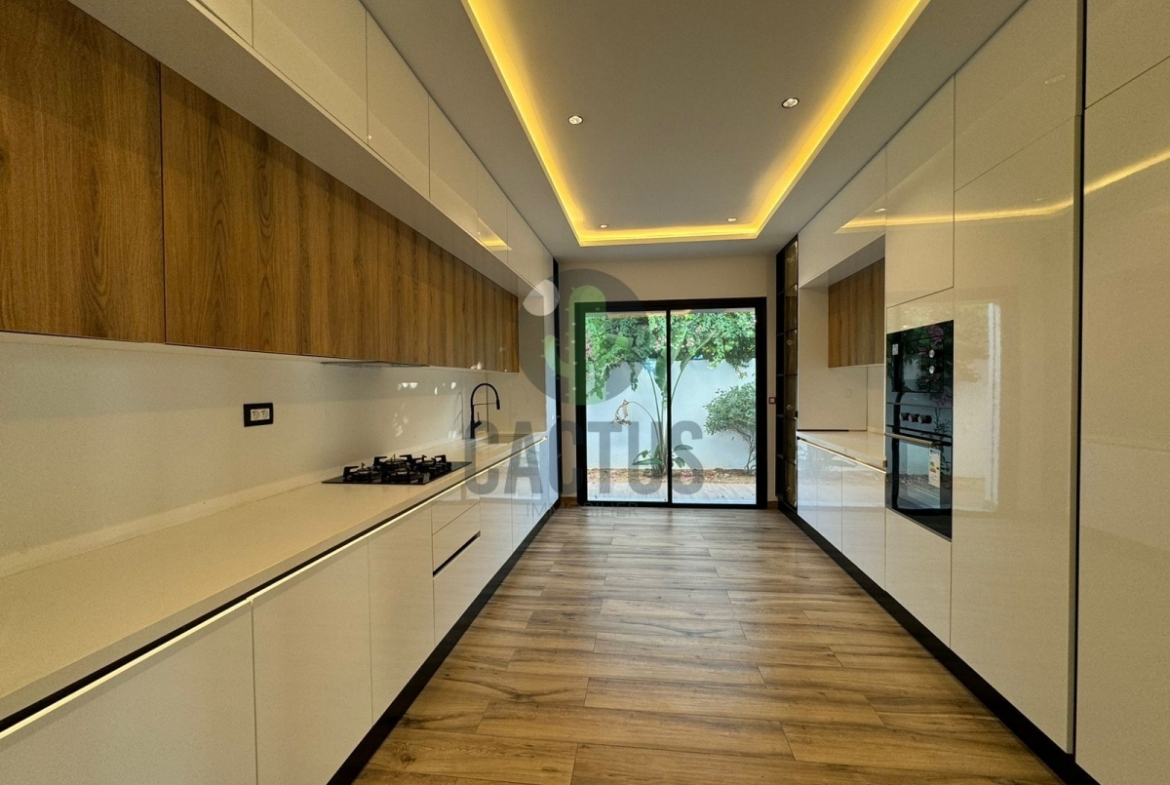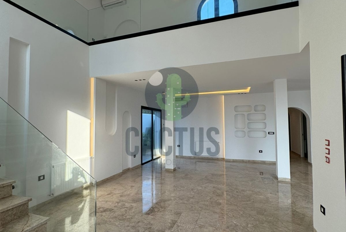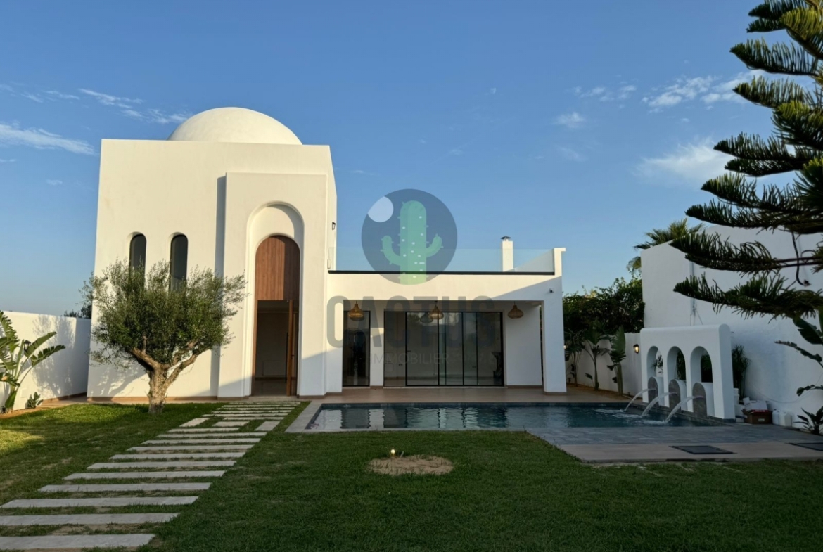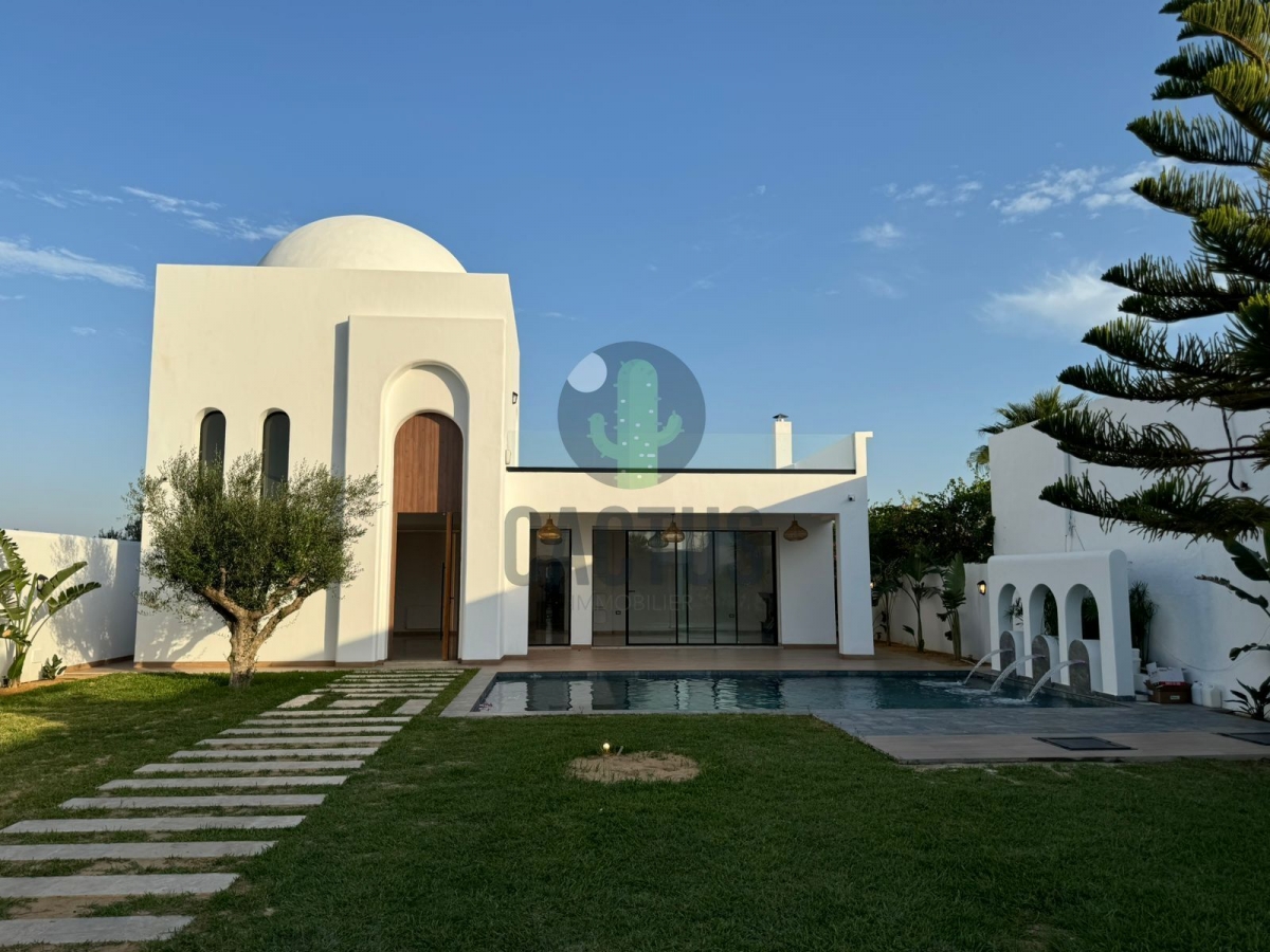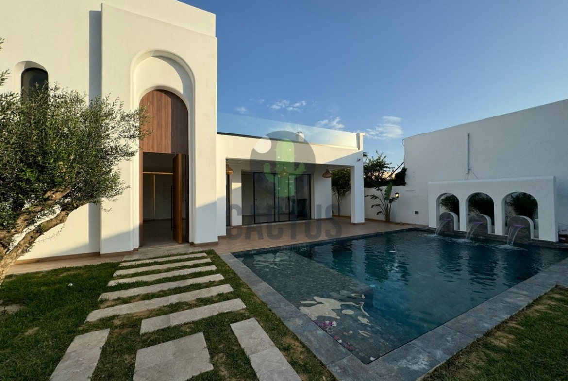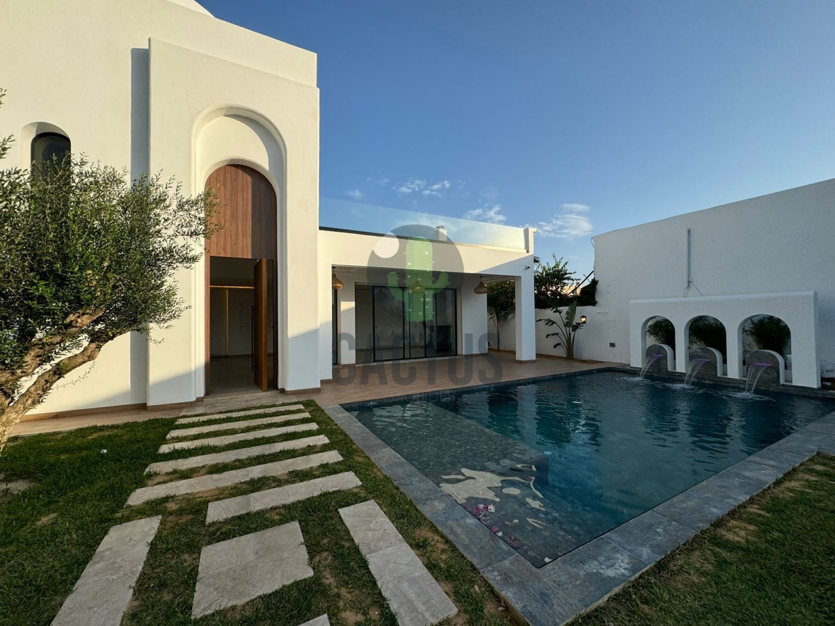 A l'entrée on trouve un spacieux salon lumineux exposé en marbre Kadhel ouvrant sur une terrasse complétée par une jolie piscine avec cascade ainsi qu'une cuisine indépendante bien aménagée et équipée (plaque, hotte et four) complétée par un jardin et une salle d'eau pour les invités.