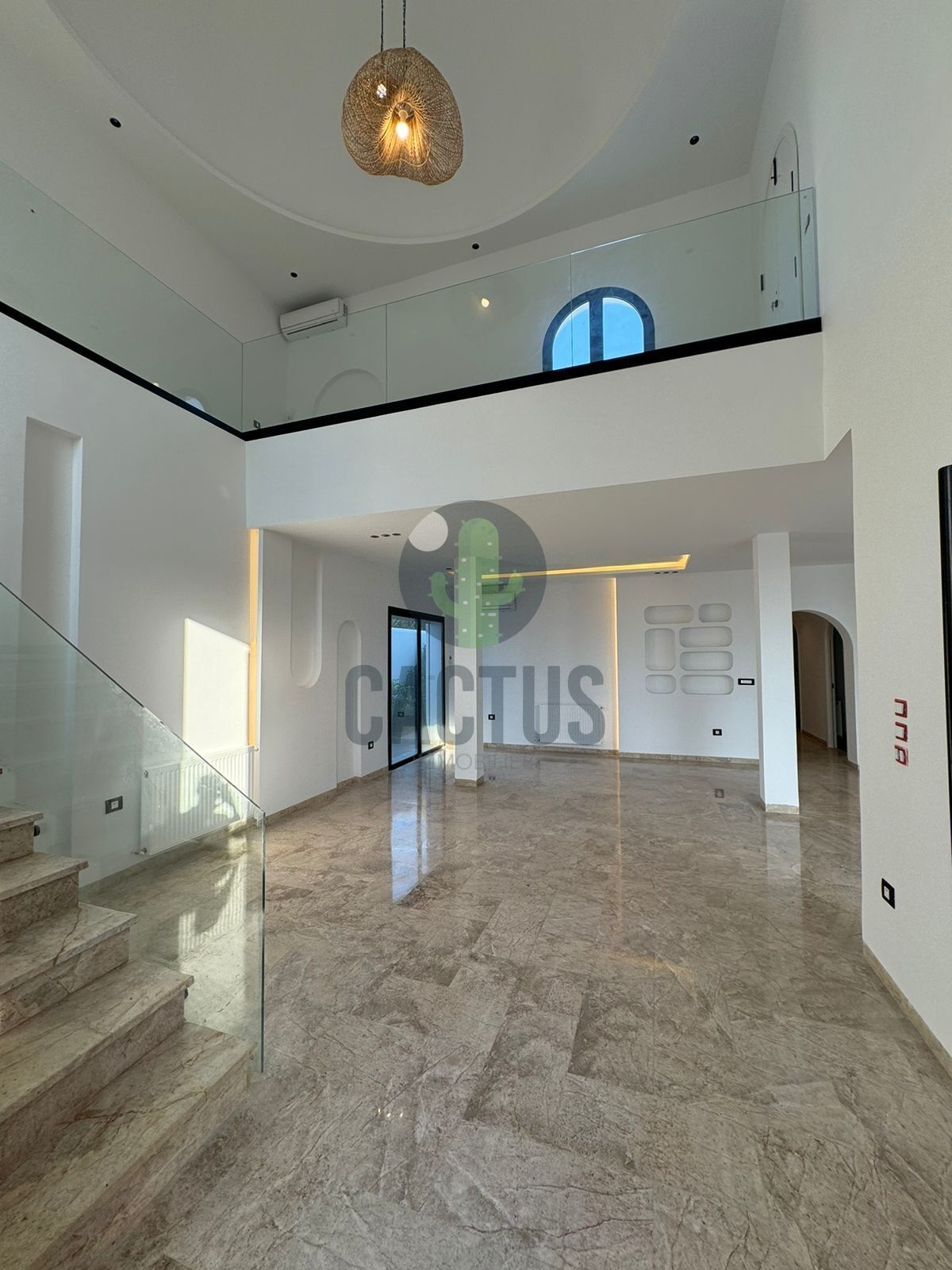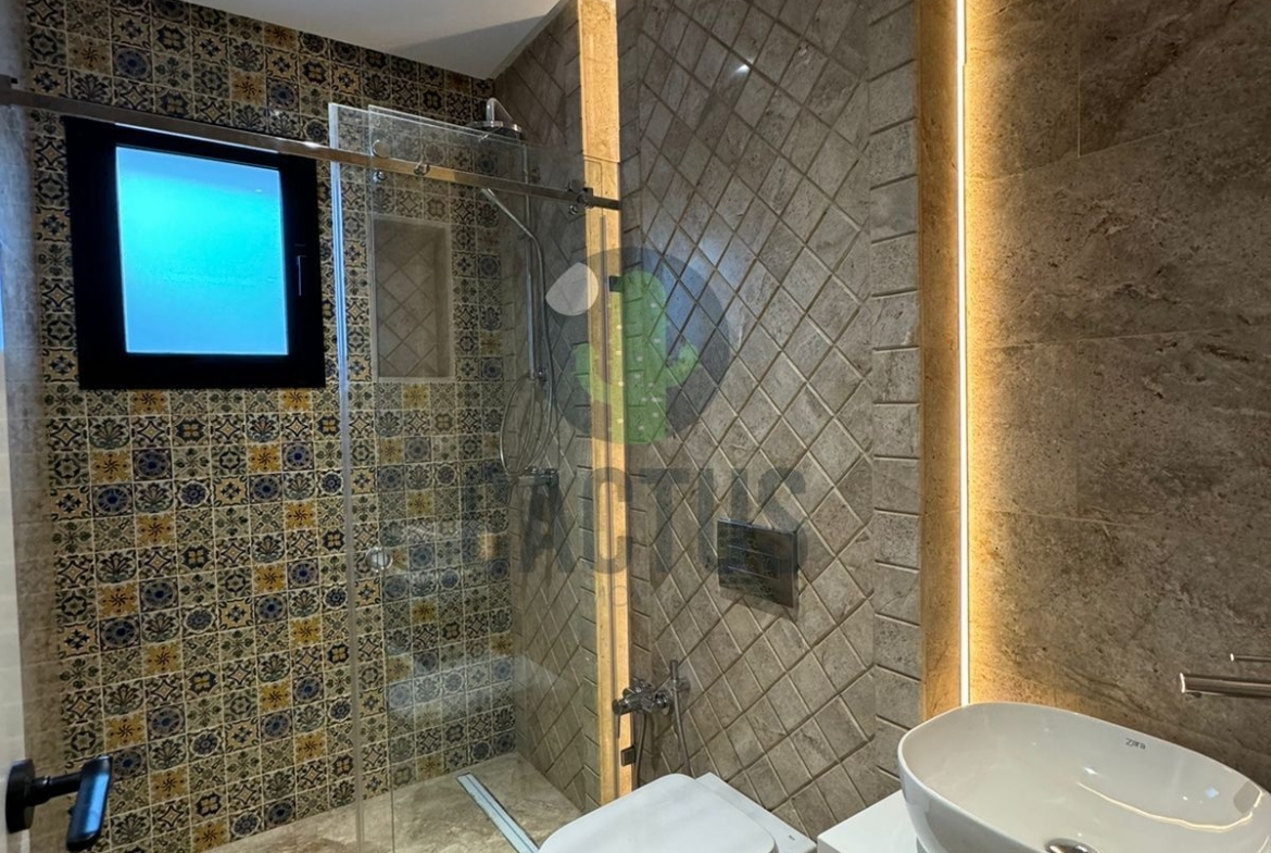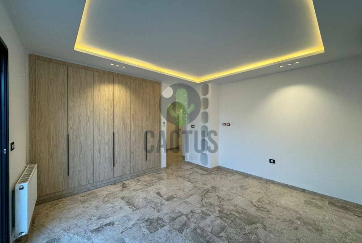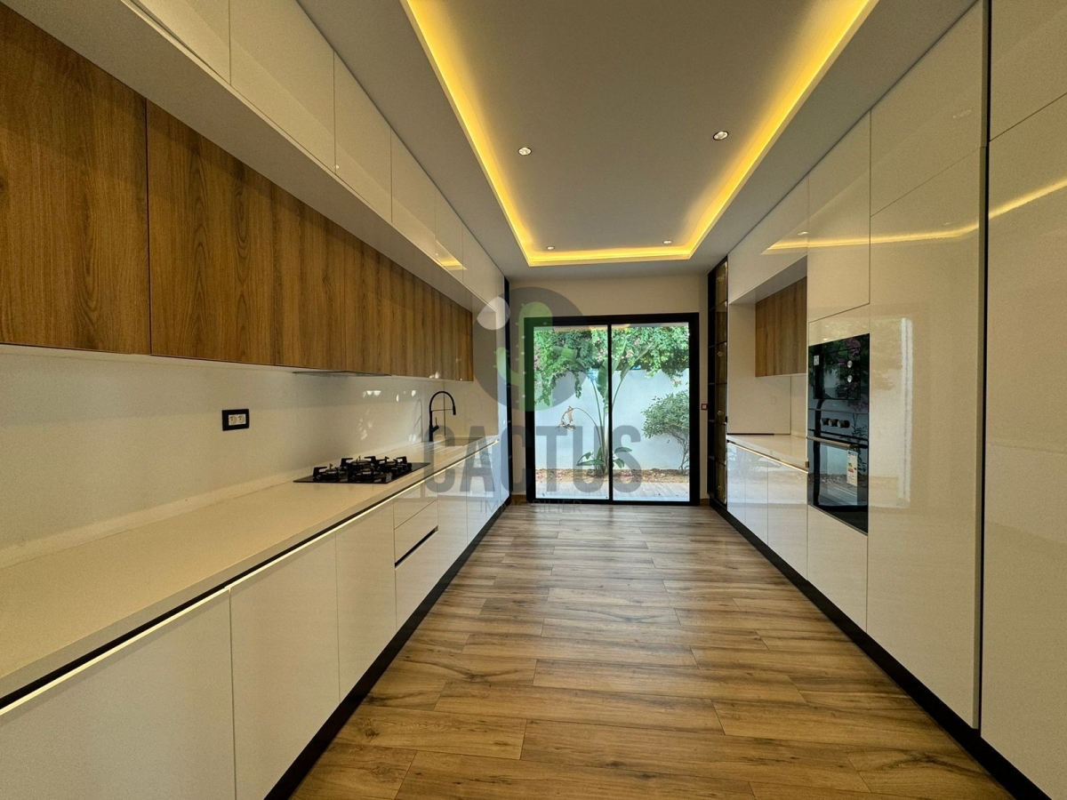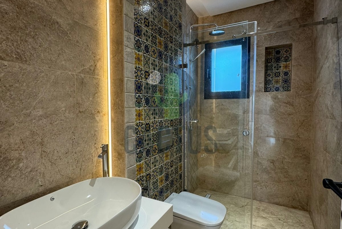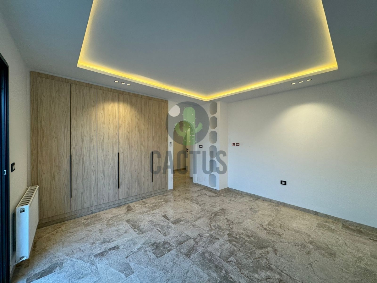 A l'entrée on trouve un spacieux salon lumineux exposé en marbre Kadhel ouvrant sur une terrasse complétée par une jolie piscine avec cascade ainsi qu'une cuisine indépendante bien aménagée et équipée (plaque, hotte et four) complétée par un jardin et une salle d'eau pour les invités.