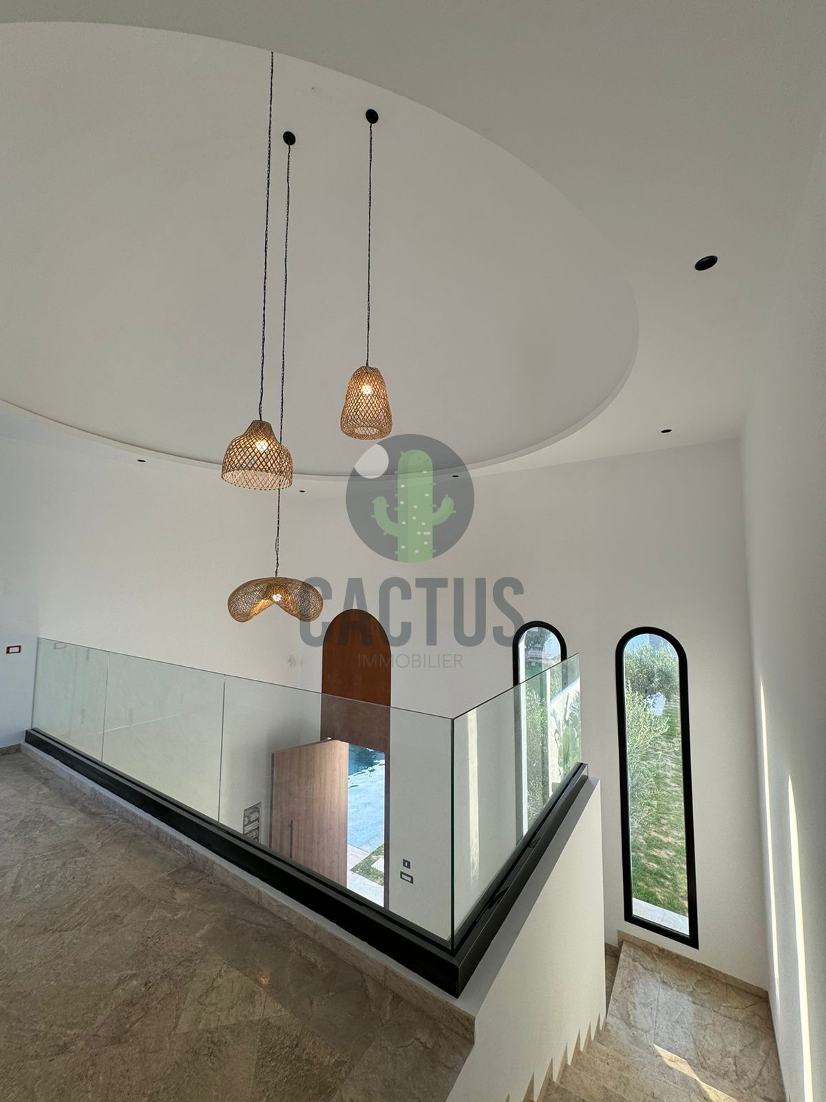 Cette villa plein pieds de 330 m² se dresse au milieu d'un terrain de 1012m² est située au cœur d'un quartier calme à Sidi Hamed à deux minutes de l'autoroute Tunis-Hammamet.