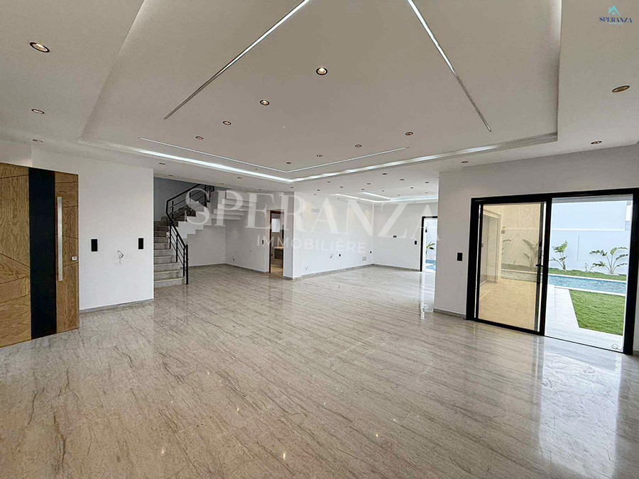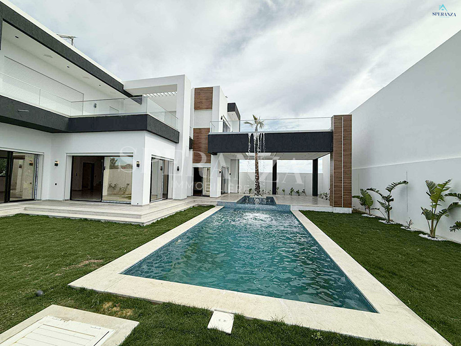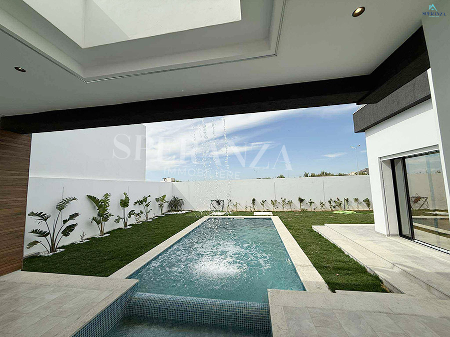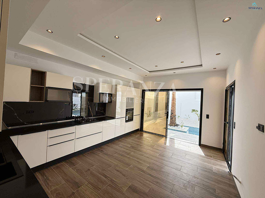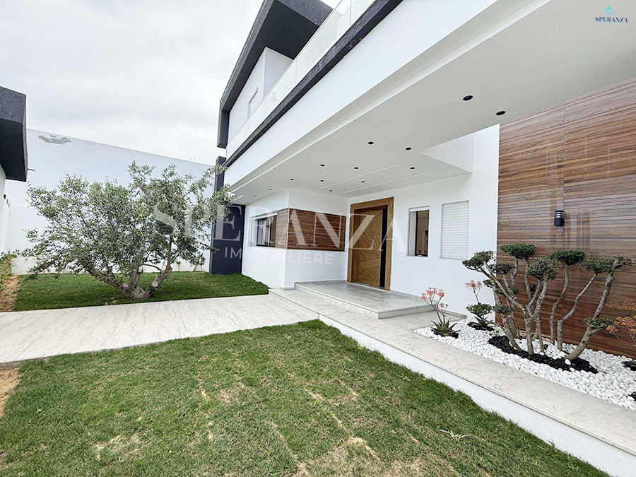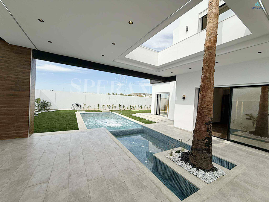 Speranza immobilière vous propose à la vente Cette villa style moderne située à Hammamet nord . L'entrée principale bénéficie d'un jardin gazonné qui offre plusieurs espaces, une piscine. Au rez de chausser se trouve un salon lumineux grâce à ses fenêtres qui offrent une vue sur le jardin,une cuisine aménagée avec des espaces de rangement ,une chambre à coucher ,une salle d'eau pour les invités. Un escalier nous mène vers le 1er étage qui se compose d'une suite parentale et de deux chambres à coucher, une terrasse vue des mers. Et un garage pour la voiture.