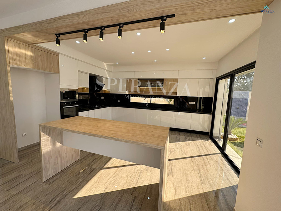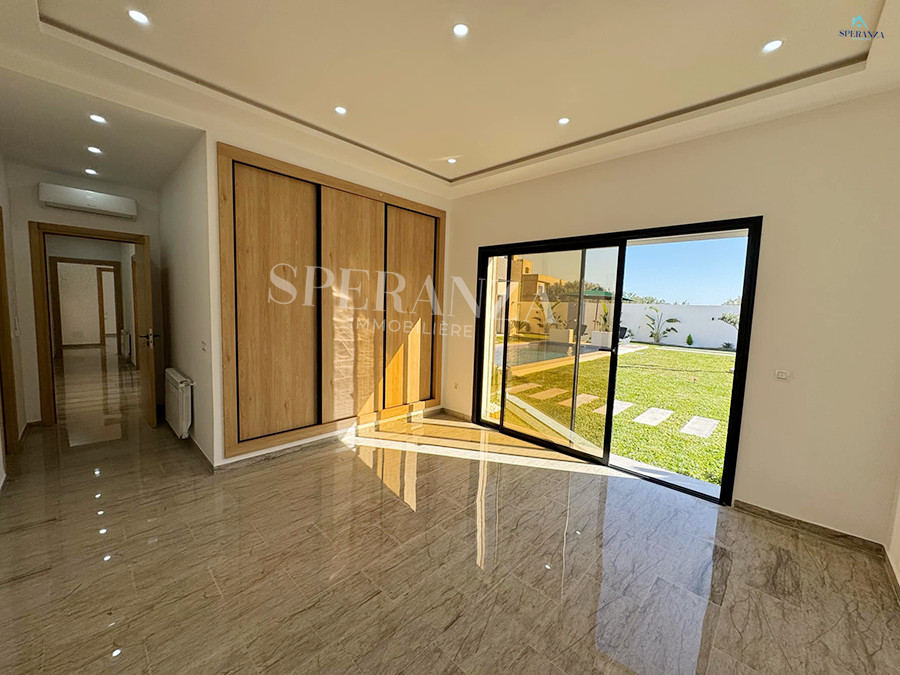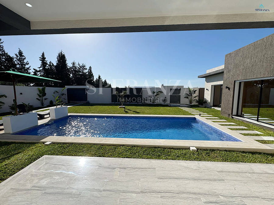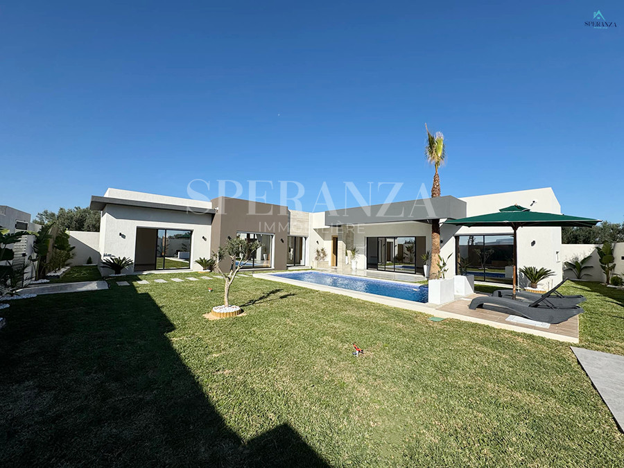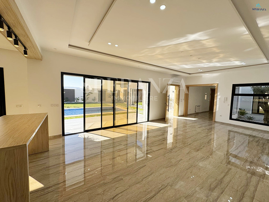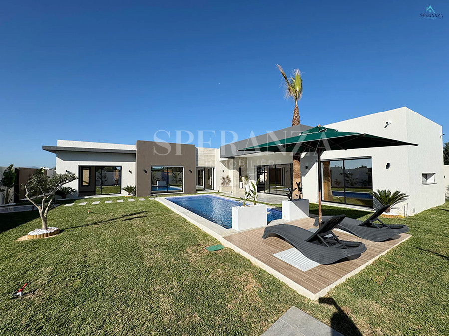 Speranza immobilière vous propose la vente Cette villa est située à Hammamet sud (sidi Hamed). L'entrée bénéficie d'un jardin gazonné qui offre plusieurs espaces de détente disposant d'une piscine. La partie jour est composée principalement d'un salon spacieux. grâce à ses grandes ouvertures, une cuisine dispose de plusieurs éléments de rangement ,salle d'eau.la partie nuit se compose par une suite parentale, trois chambre à coucher .Un abri pour la voiture .