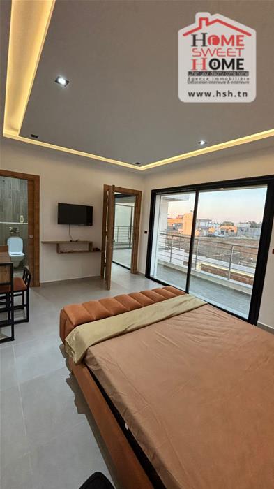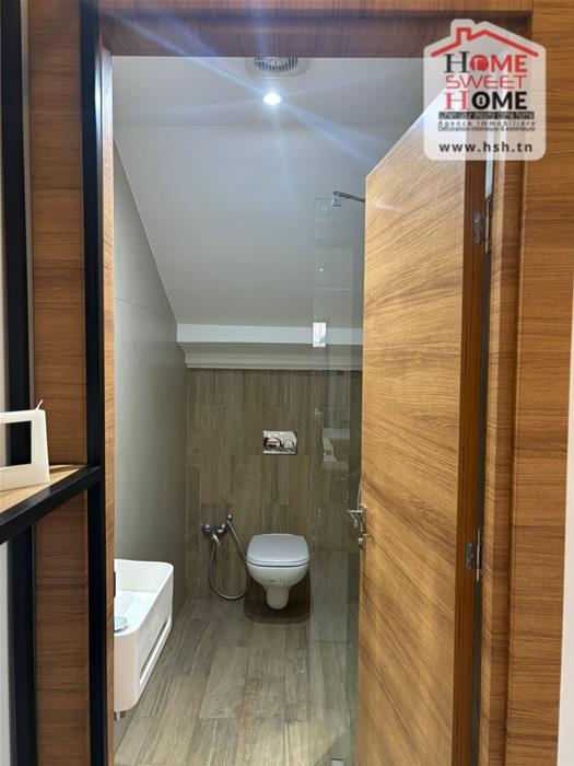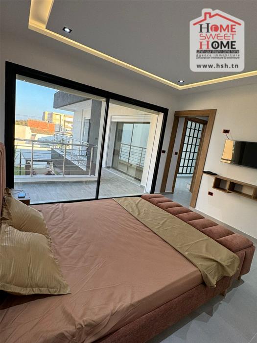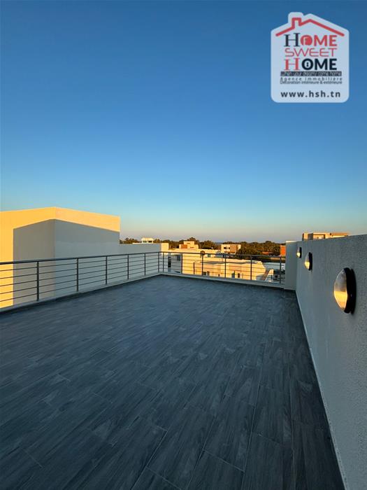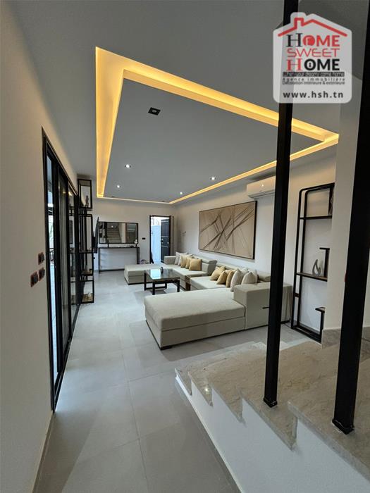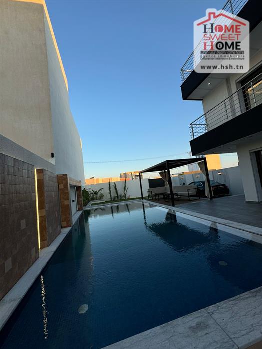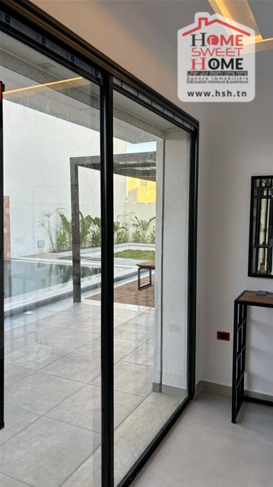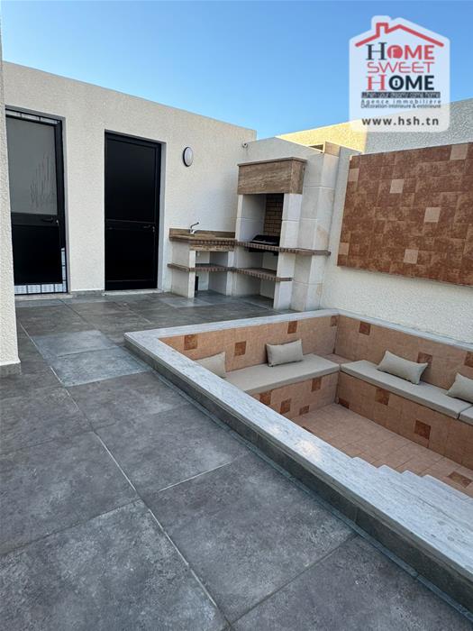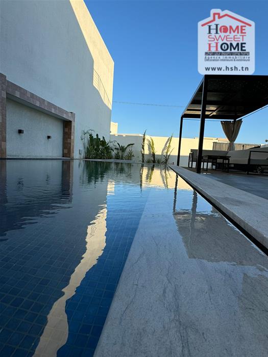 Villa meublée sur un terrain d'une superficie de 300m², située à Kerkouane, à proximité de la mer. Au RDC, on trouve un salon, une cuisine équipée et une salle d'eau. Au 1er étage on trouve 2 suites, chacune équipée d'un climatiseur et d'une télévision. Au 2ème étage se trouve une suite avec climatiseur et télévision. A l'extérieur, la villa dispose d'un jardin et d'une piscine.