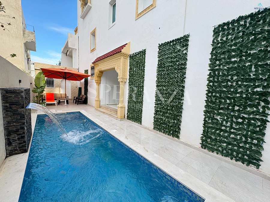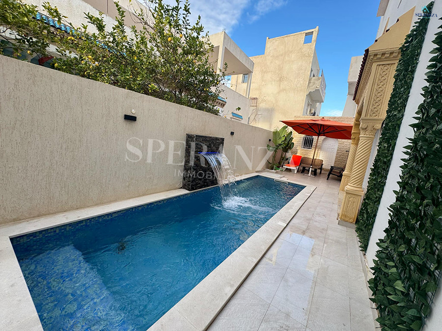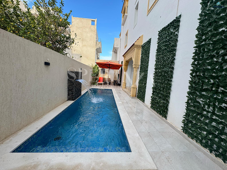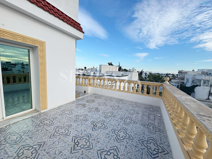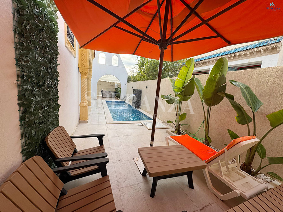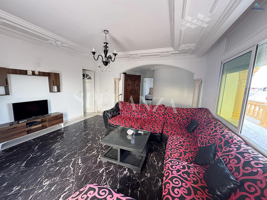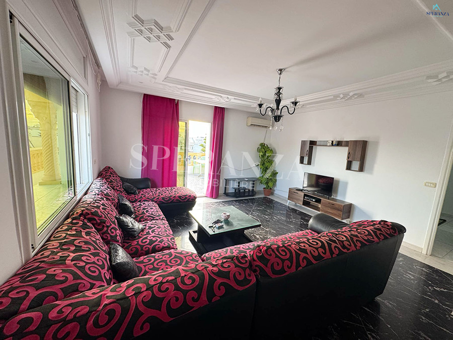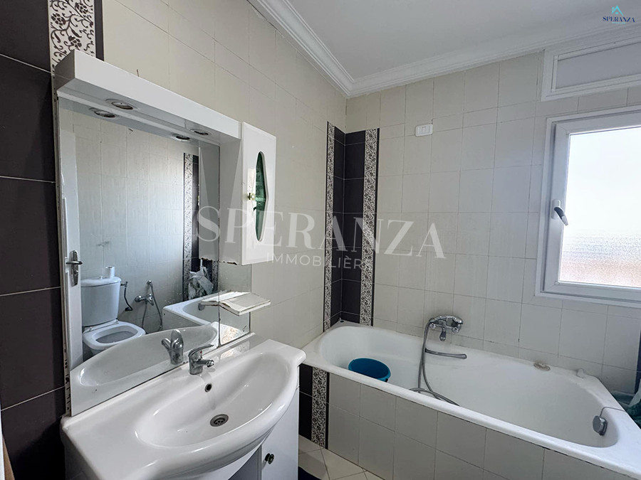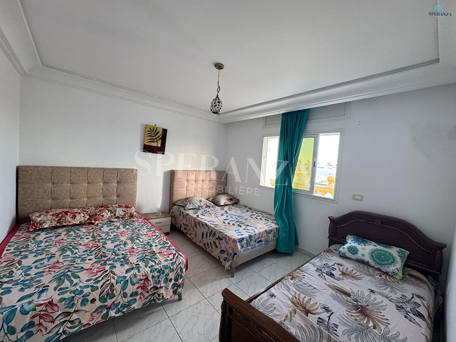 Speranza Immobilière Hammamet vous propose à la location annuelle cet appartement situé à Hammamet au deuxième étage, dans un quartier calme et sécurisé. L'entrée donne directement sur une piscine privée. L'espace principal comprend un salon lumineux, une cuisine bien équipée et aménagée avec des éléments de rangement nécessaires, ainsi qu'une salle d'eau. Le compartiment nuit se compose de deux chambres à coucher. Une agréable terrasse complète ce bien.