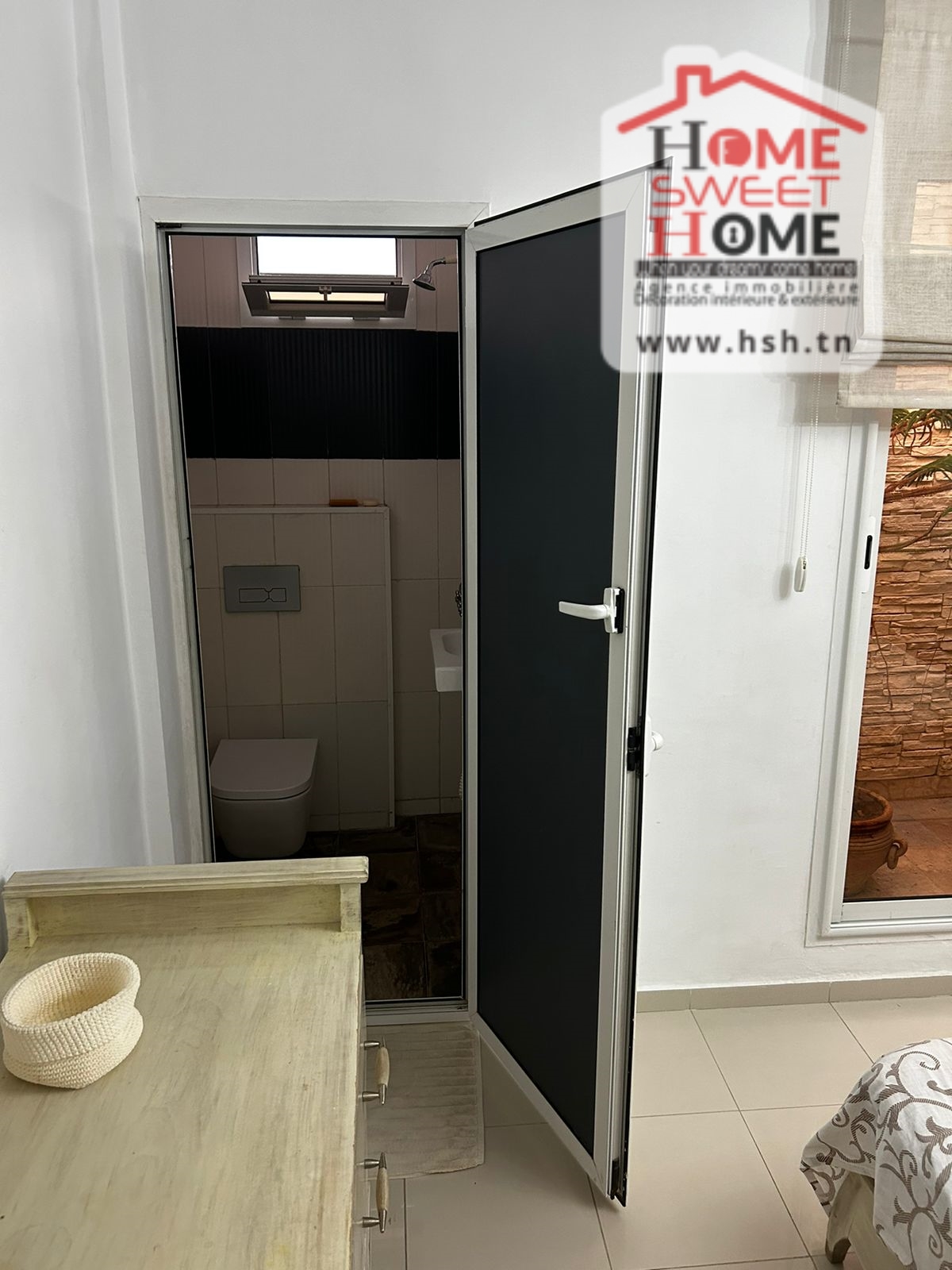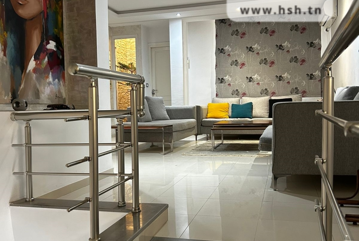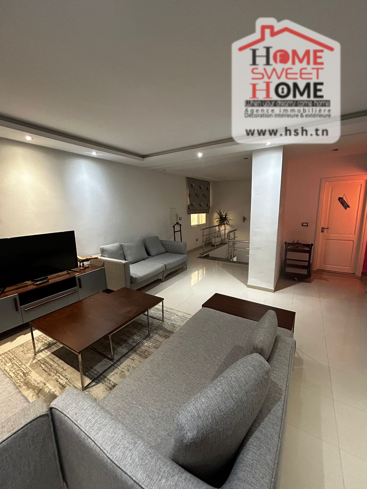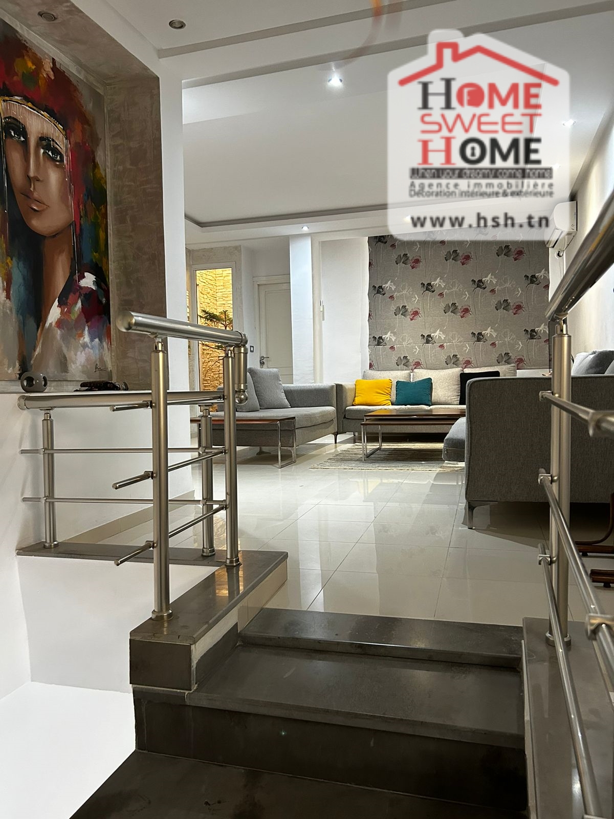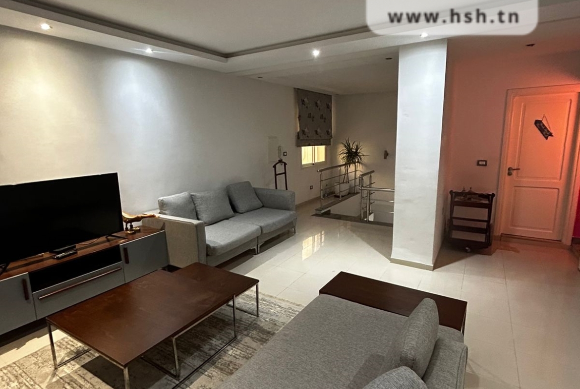 Un étage de villa meublée au 1er étage situé à L'Aouina, à 2min de l'école américaine. A l'entrée, sur un grand salon, une cuisine équipée, une suite parentale, une chambre à coucher et une salle de bain.