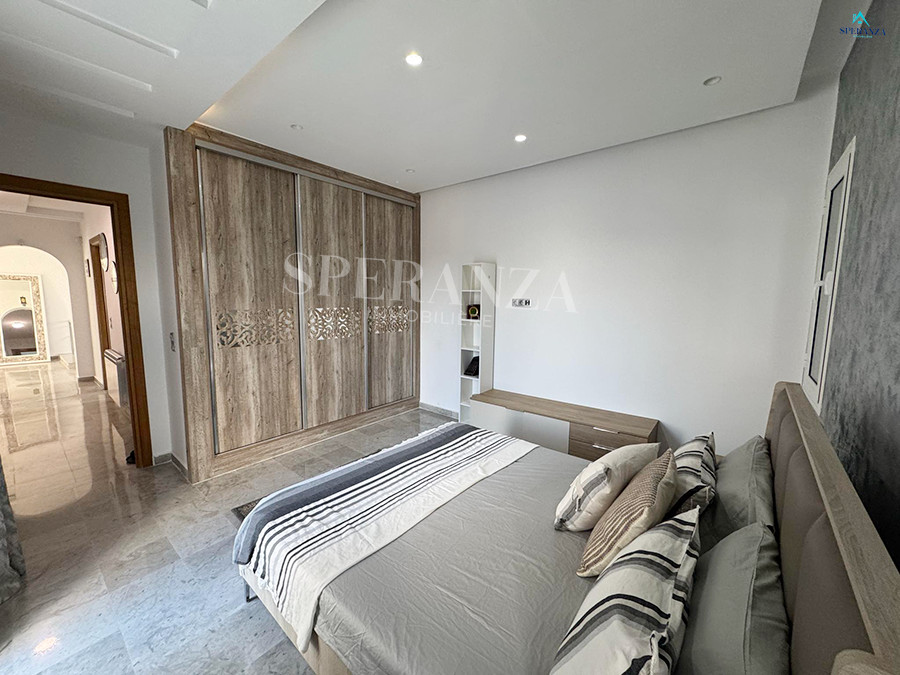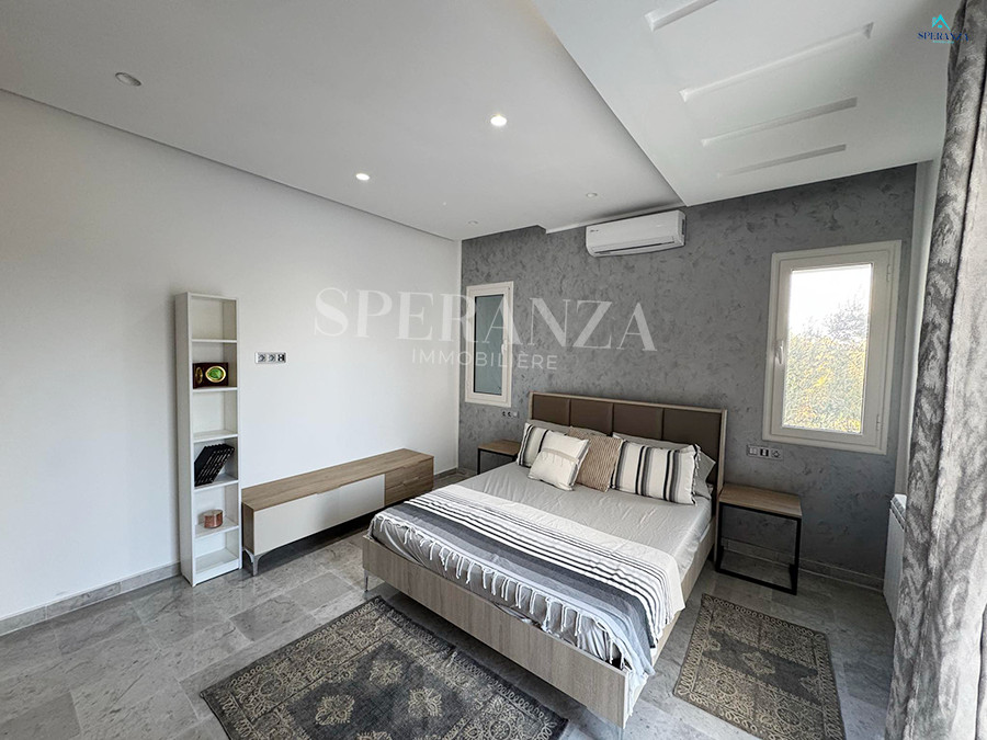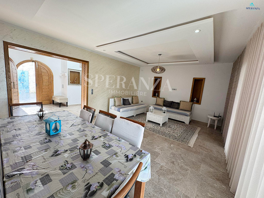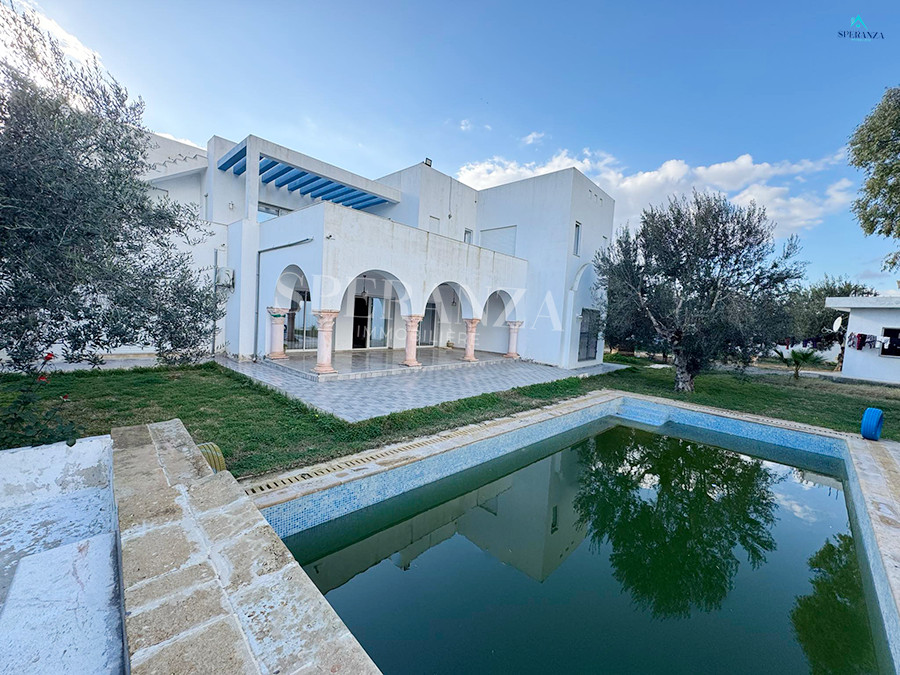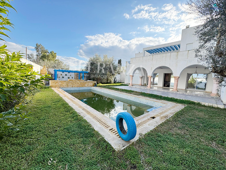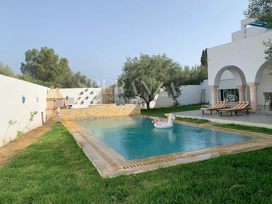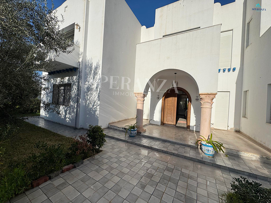 Speranza immobilière Hammamet vous propose à la location annuelle cette villa se situéeé à Hammamet . Dans un quartier calme et résidentiel. L'entrée principale s'ouvre sur un jardin gazonné avec piscine. Un salon lumineux ,un séjour, une cuisine bien équipée et aménagée avec des espaces de rangements,une salle d'eau. Le 1 er étage mène à la partie nuit qui dispose d'une suite parentale, d'une salle d'eau , de trois chambres accuchées et d'une terrasse .Un garage .