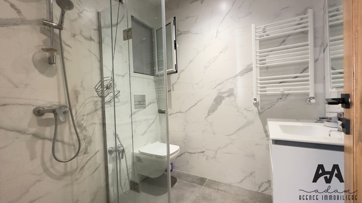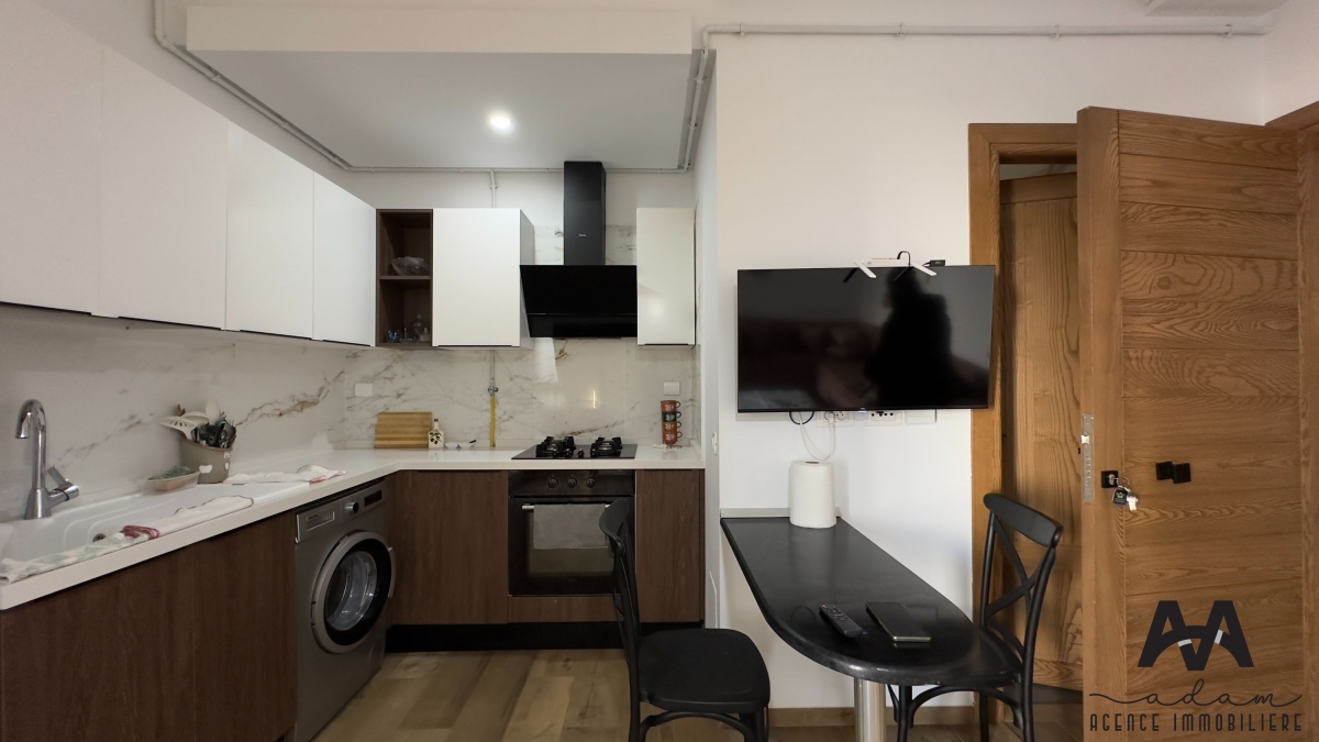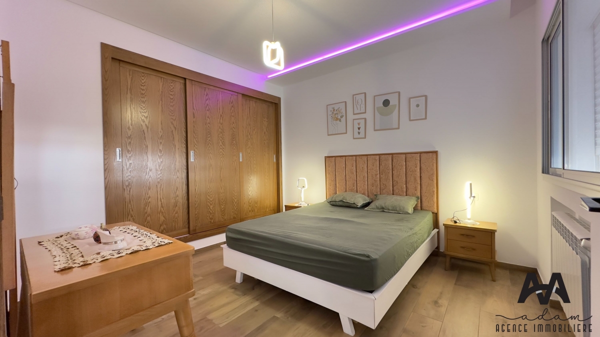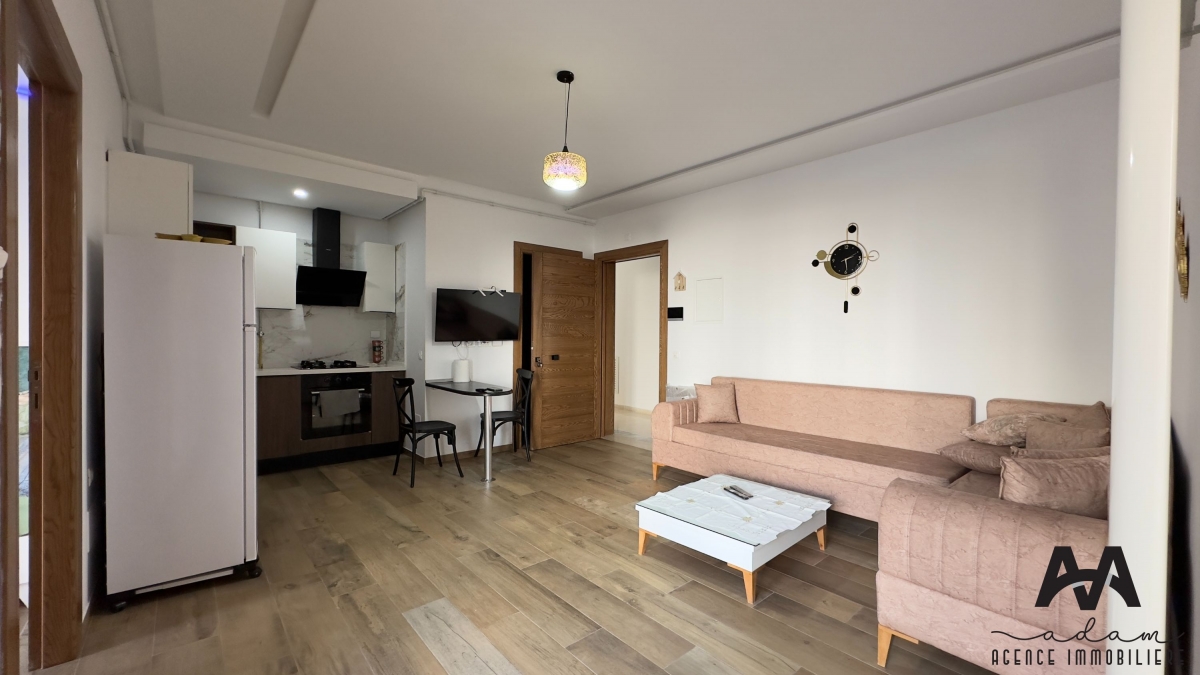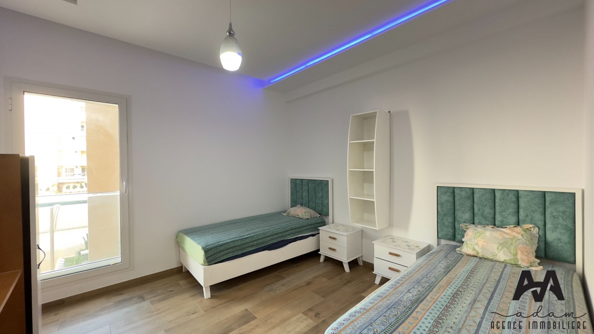 ADAM Agence Immobilière vous propose : Un appartement S+2 meublé dans une résidence sécurisée, avec double ascenseur et piscine collective.