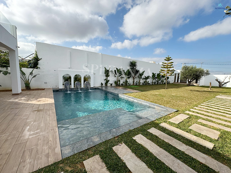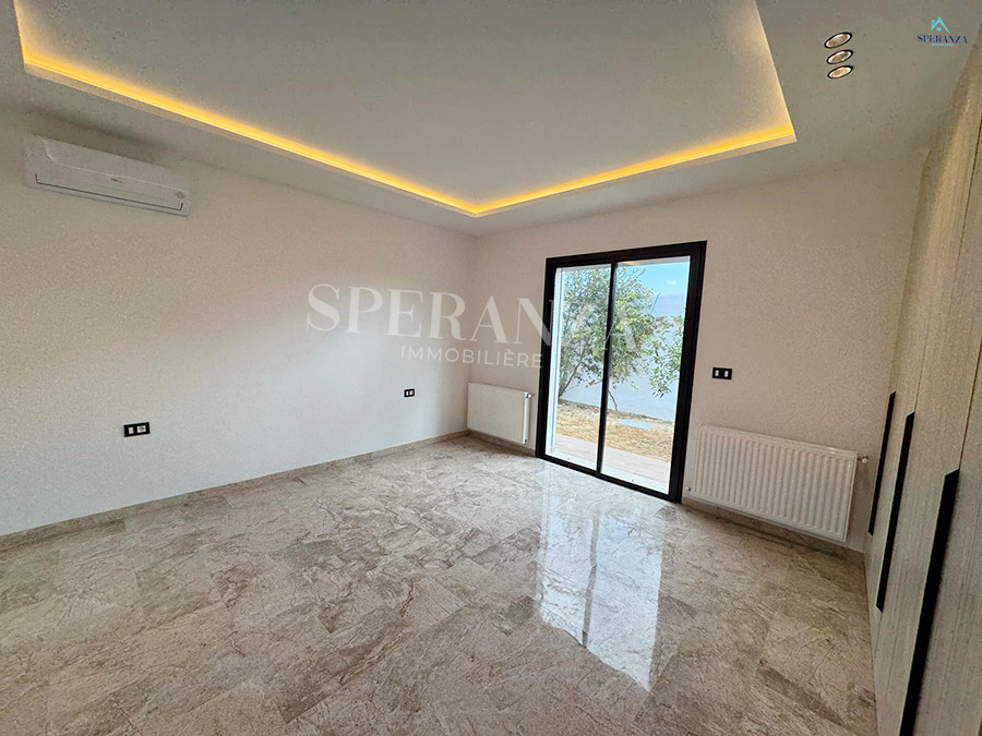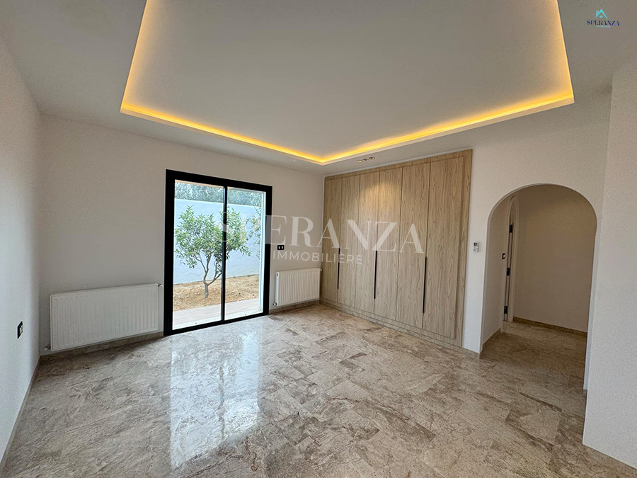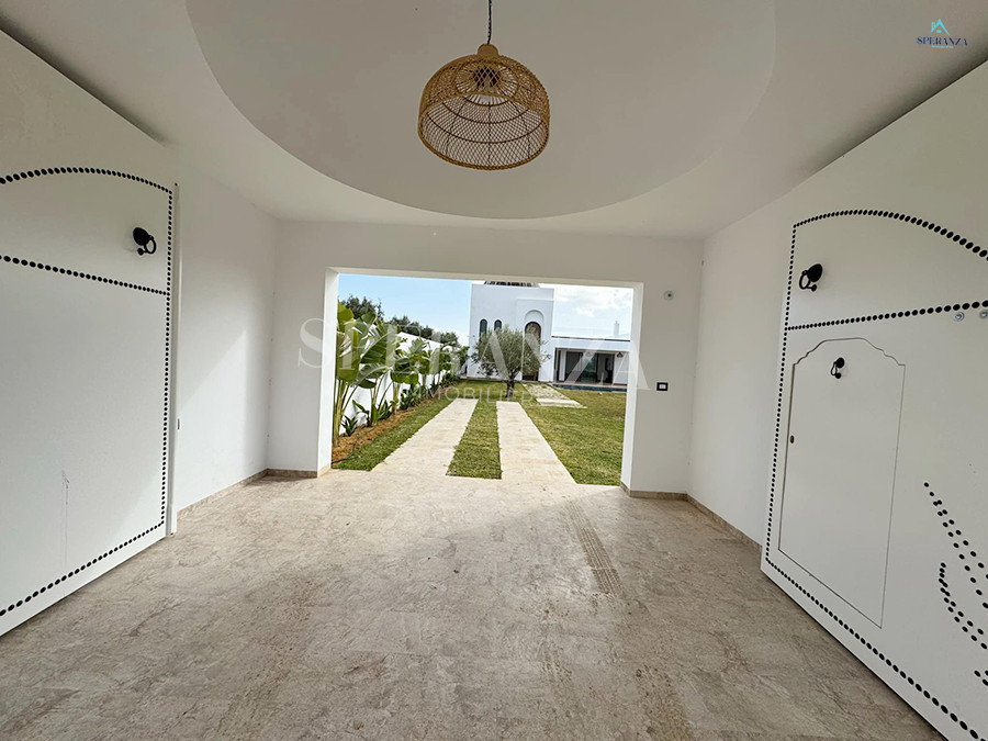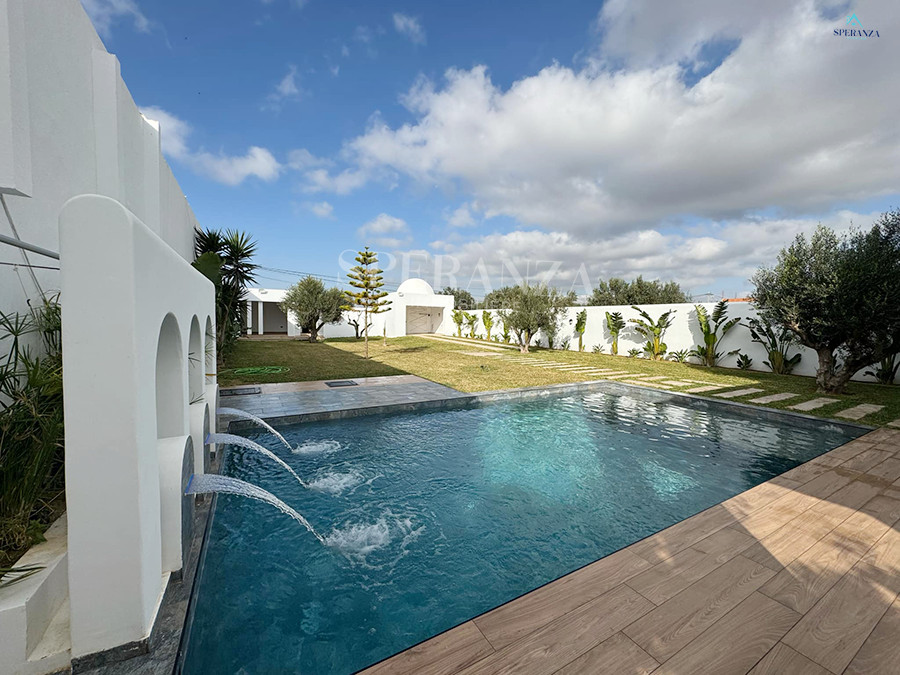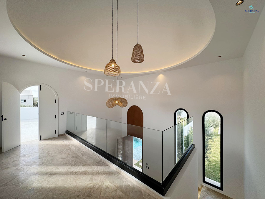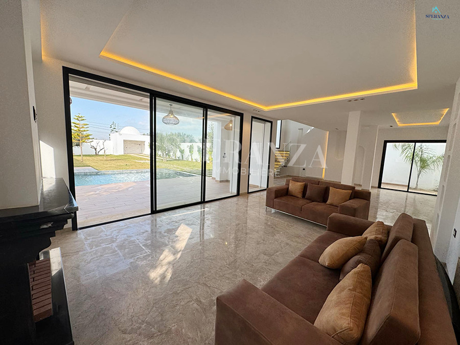 Speranza Immobilière Hammamet vous propose à la vente une villa située à Hammamet Sud, dans un quartier calme. L'entrée principale s'ouvre sur un jardin et une piscine. Le rez de chaussée comprend un salon lumineux avec cheminé, ainsi qu'une cuisine. moderne entièrement équipé et aménagé avec des éléments de rangement pratiques et une salle d'eau pour les invités. Ce niveau dispose également de trois suites parentales. Un escalier mène au premier étage, où vous découvrirez une terrasse offrant une vue sur les montagnes. villa est également doté d'un garage spacieux