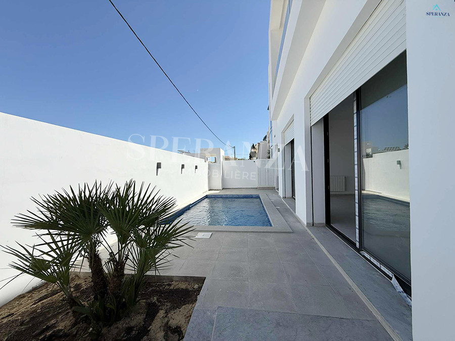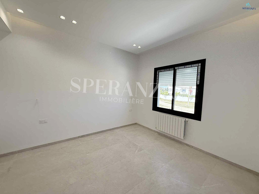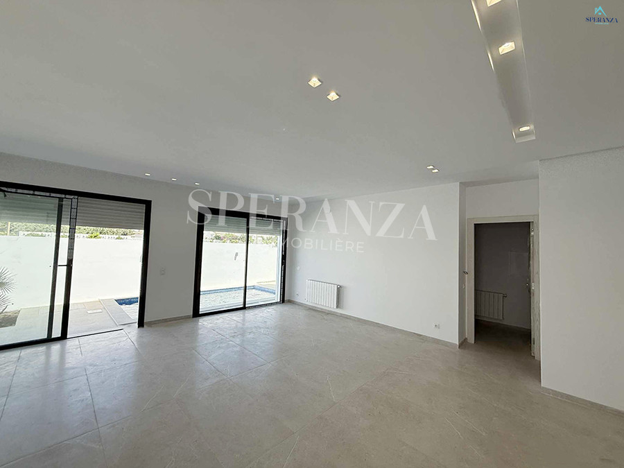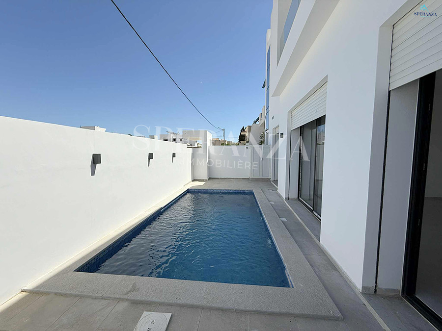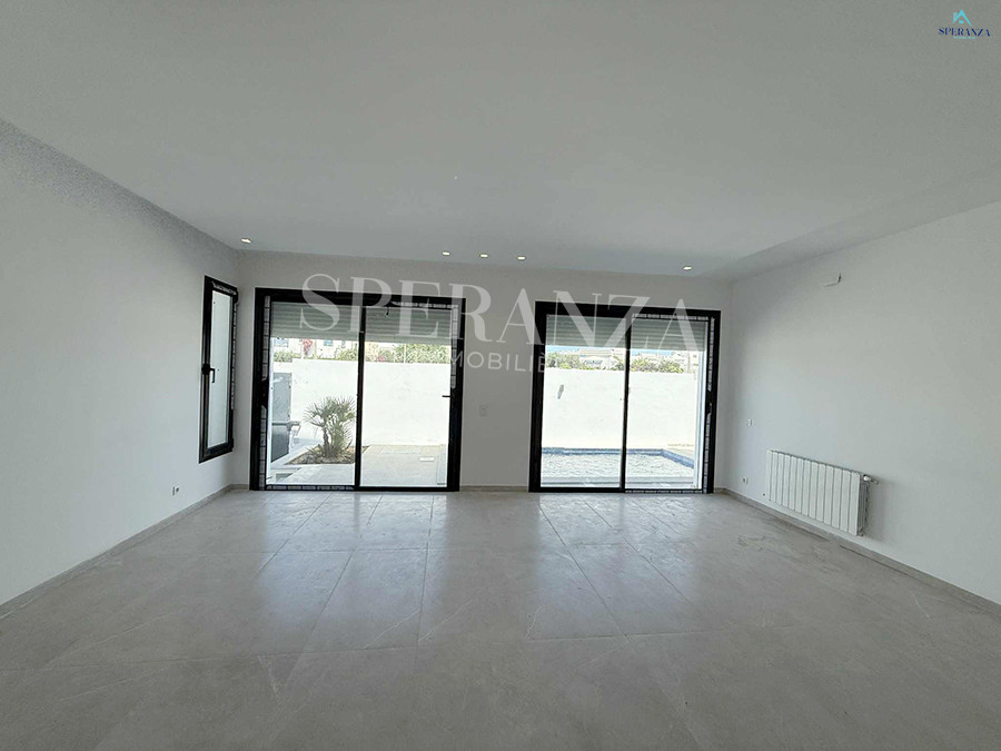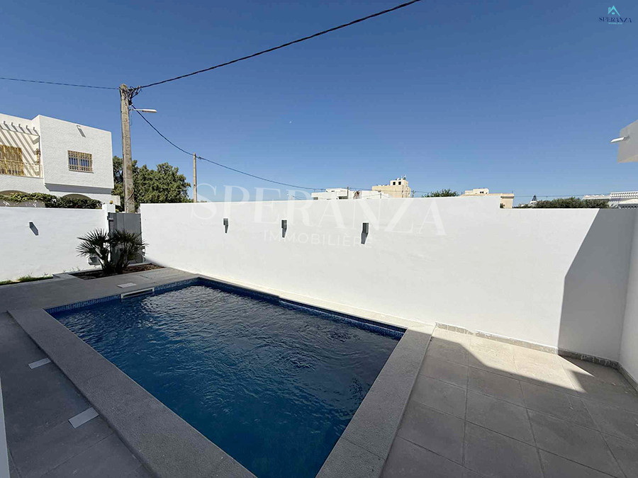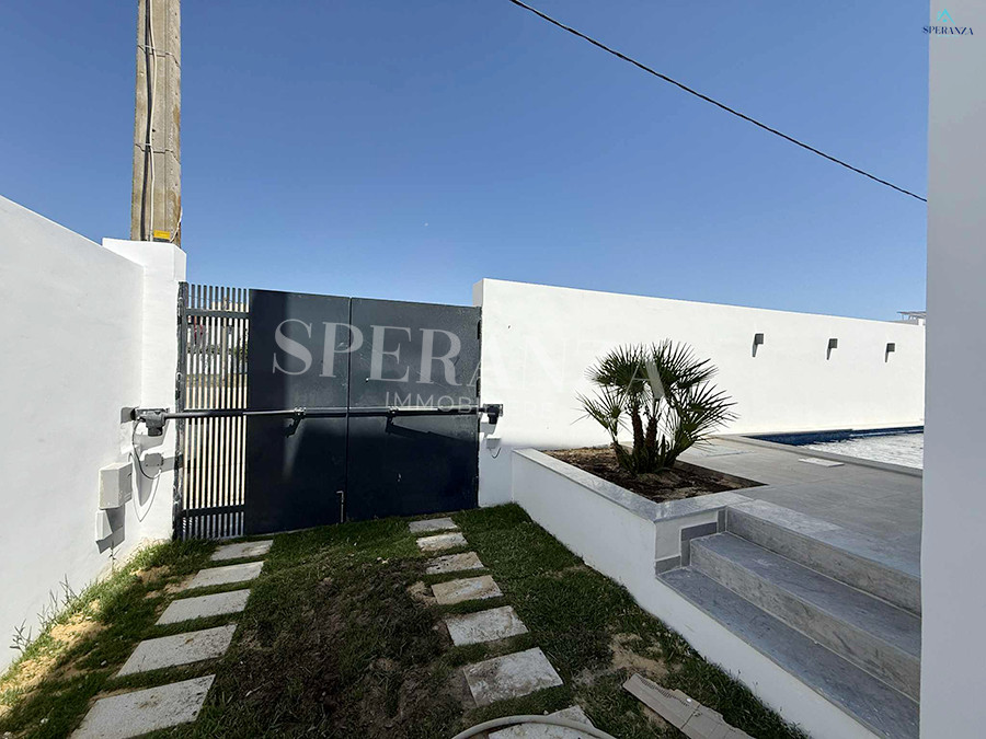 Speranza immobilière Hammamet vous propose à la vente cette villa située à Nabeul, l'entée principale se bénéficie d'un jardin gazonné qui offre plusieurs espaces avec une piscine. La partie jour est composée principalement d'un salon spacieux, une cuisine est bien équiper et aménager avec des espaces de rangement.