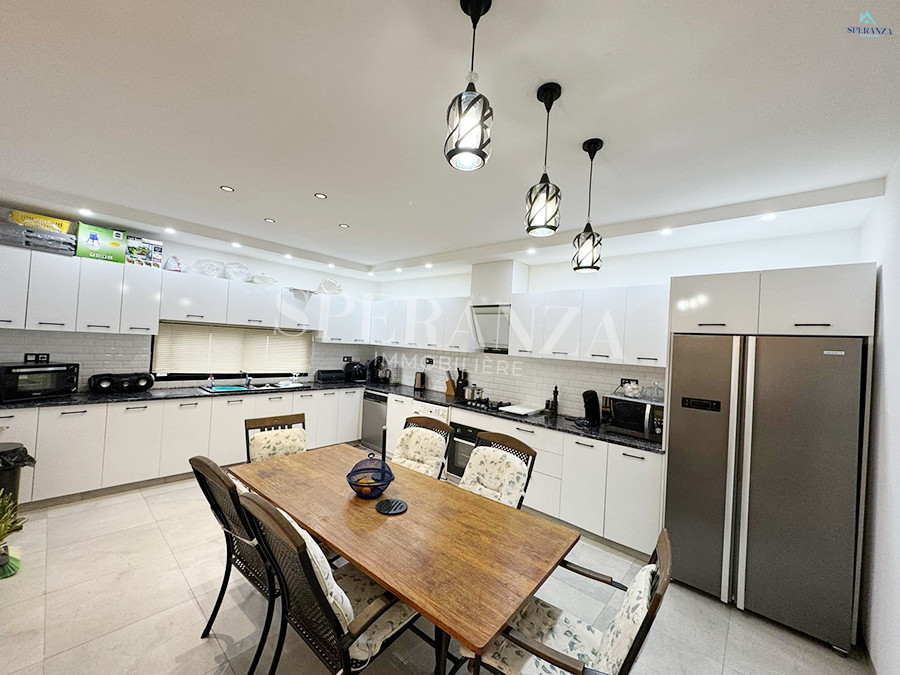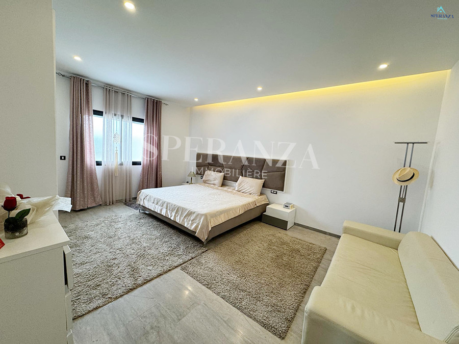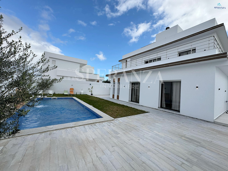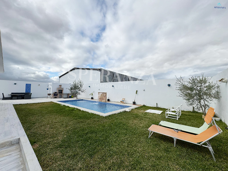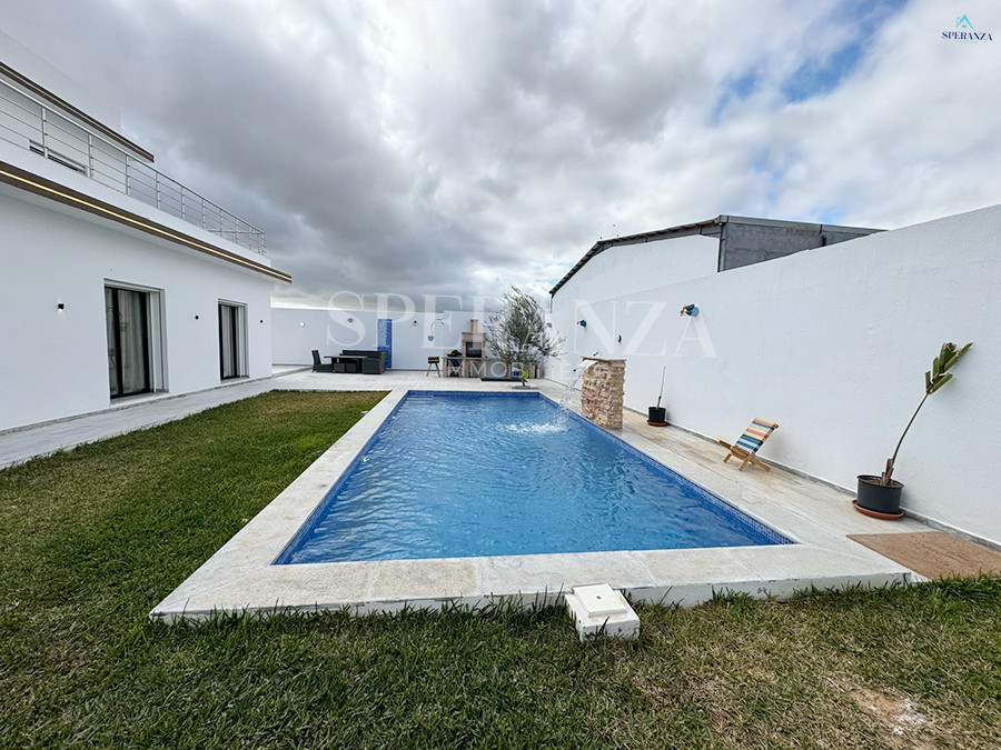 Speranza Immobilière Hammamet vous propose à la vente une villa située à Hammamet Sud, dans un quartier calme.L'entrée principale s'ouvre sur un jardin et une piscine.Le rez-de-chaussée comprend un salon lumineux ,une cuisine moderne entièrement équipée. et aménagé avec des éléments de rangement pratiques et une salle d'eau pour les invités.Ce niveau dispose également de deux chambres.Un escalier nous mène au premier étage, où se trouve également deux chambres et une salle de bain.