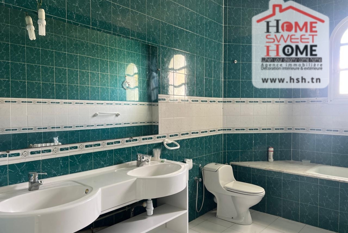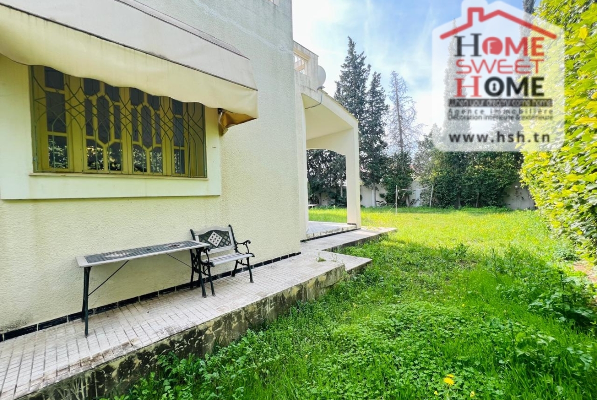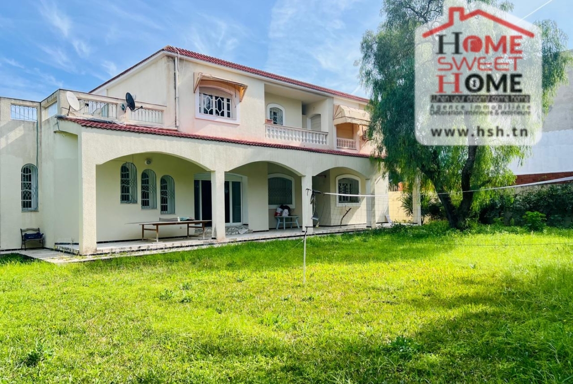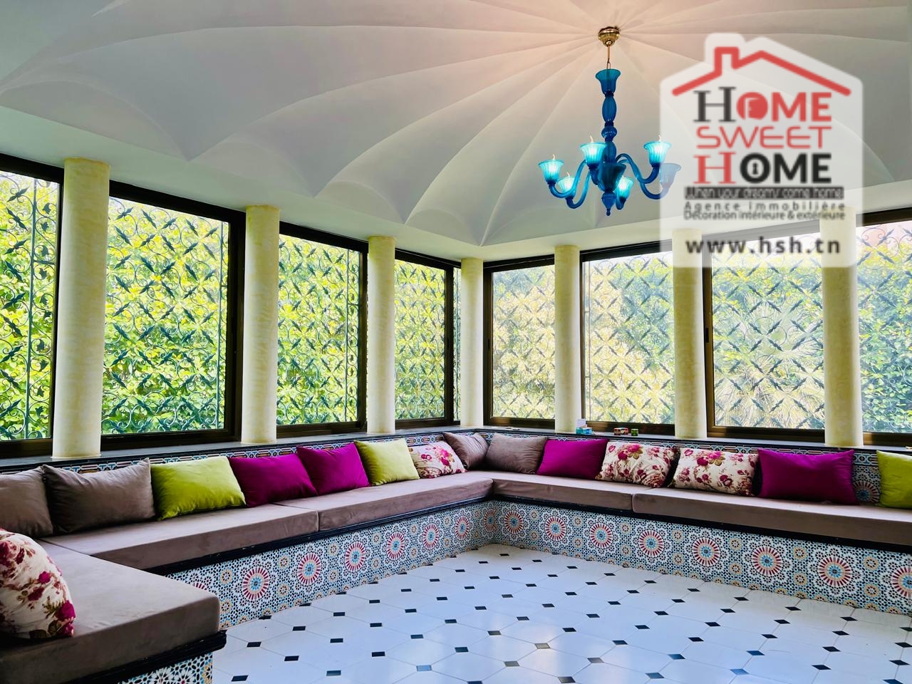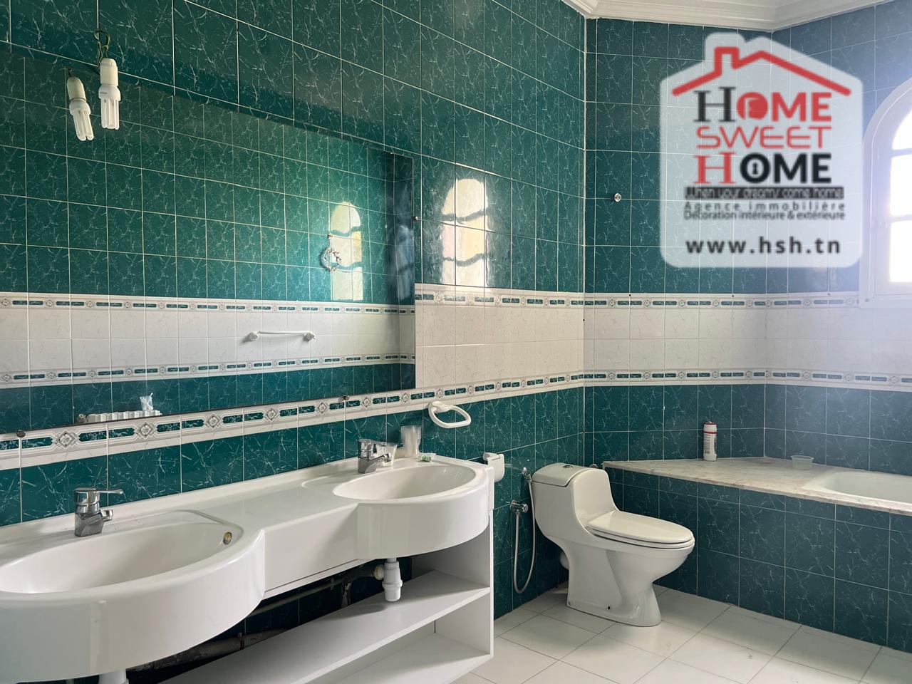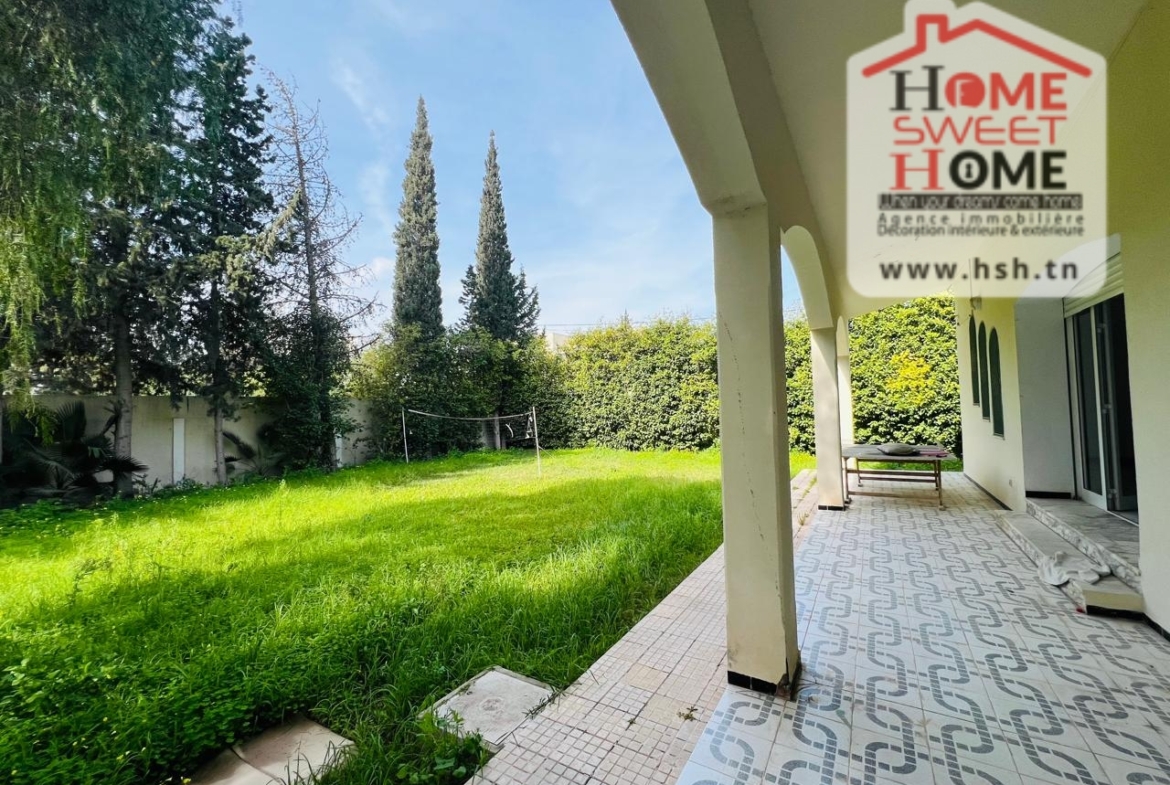 Une luxueuse Villa située dans un quartier prisé des Jardins de l'Aouina. À l'entrée, on découvre un salon lumineux, un séjour, une cuisine équipée, deux chambres et une salle d'eau pour les invités. À l'étage, une suite parentale, cinq chambres avec dressings (dont une avec balcon), une terrasse ainsi qu'une salle de bain. À l'extérieur, un vaste jardin gazonné et un garage.