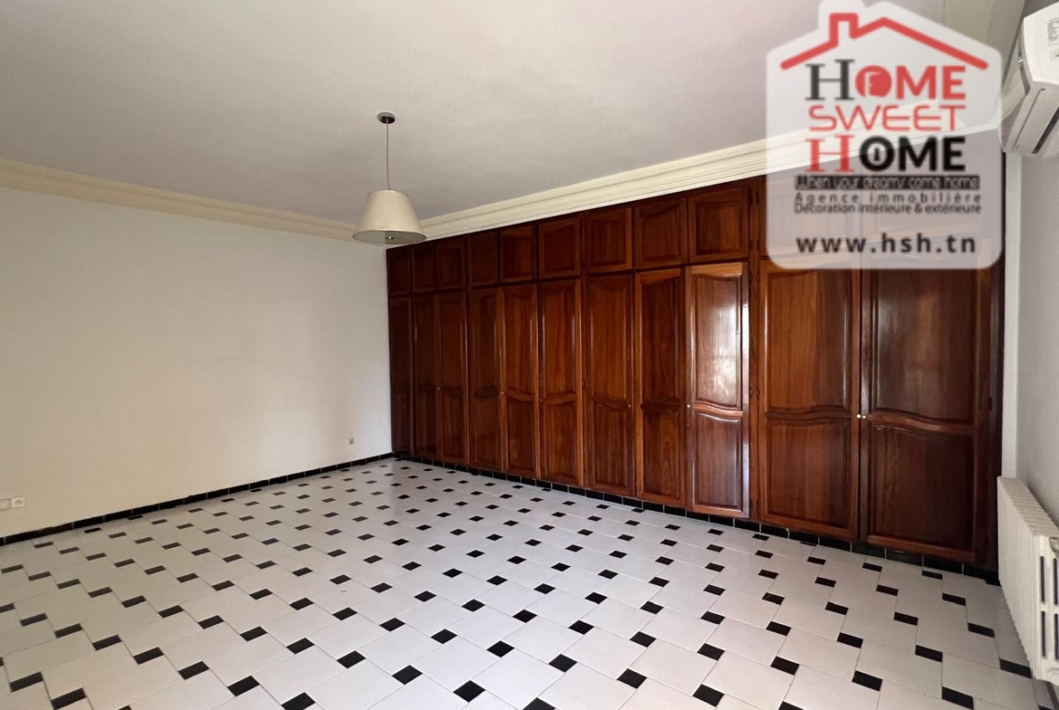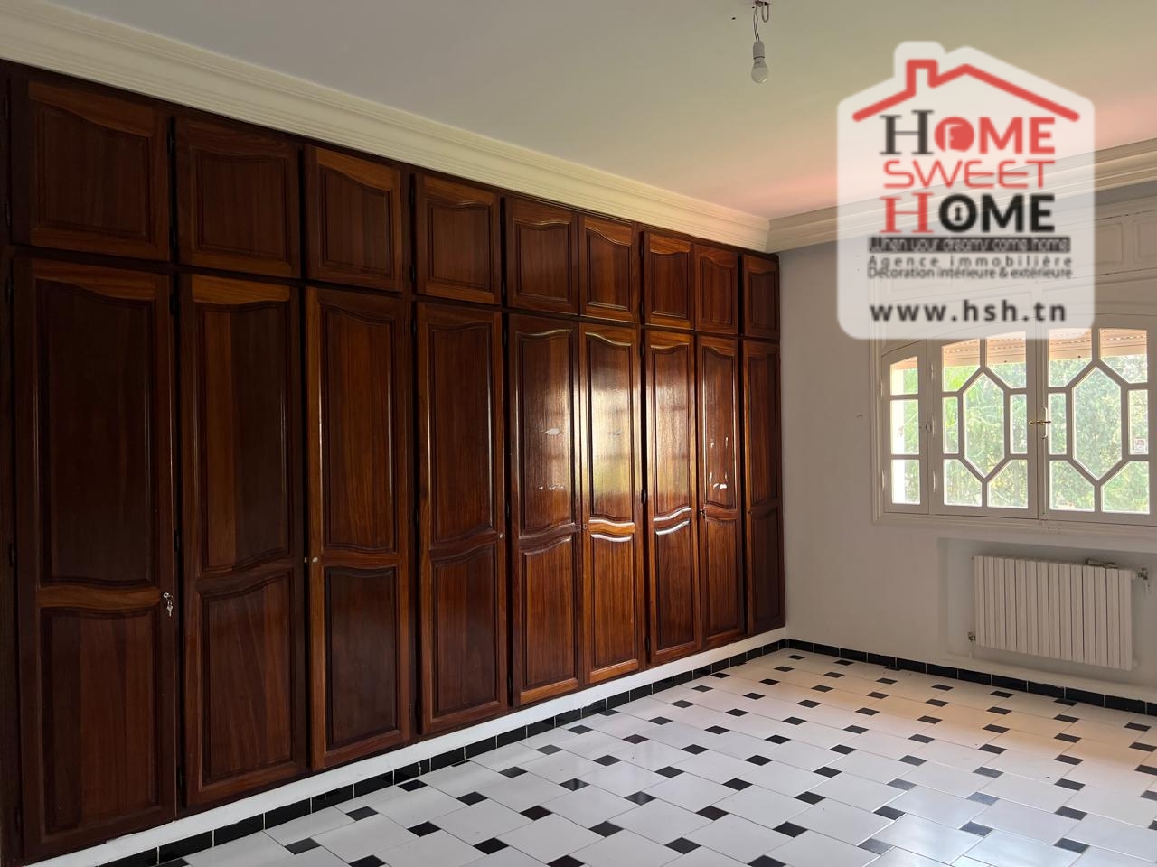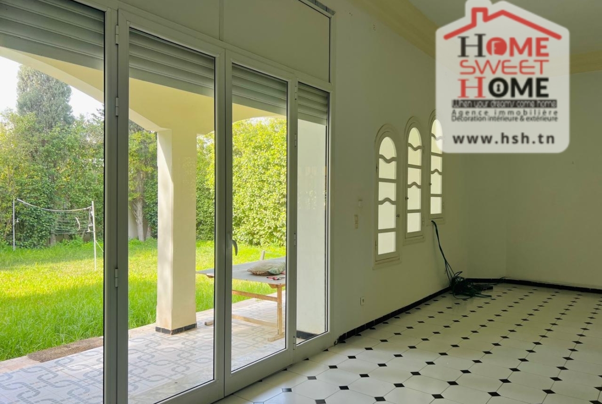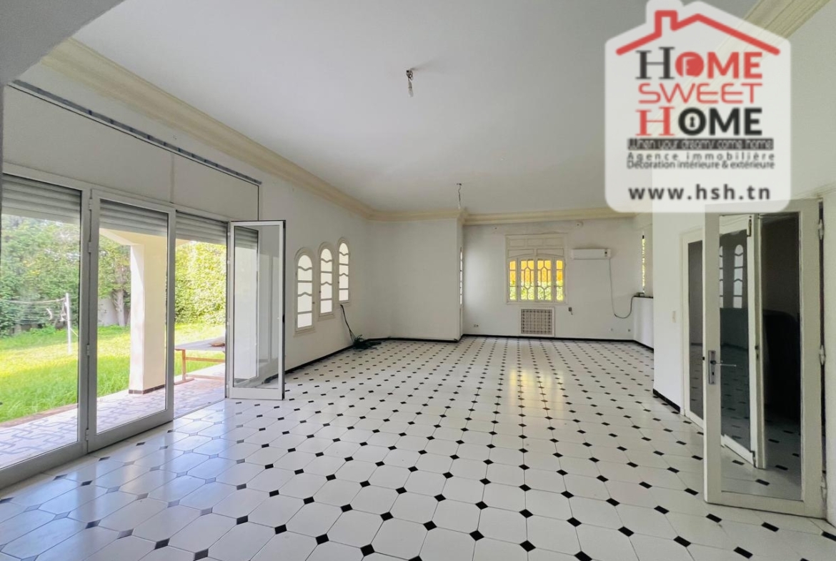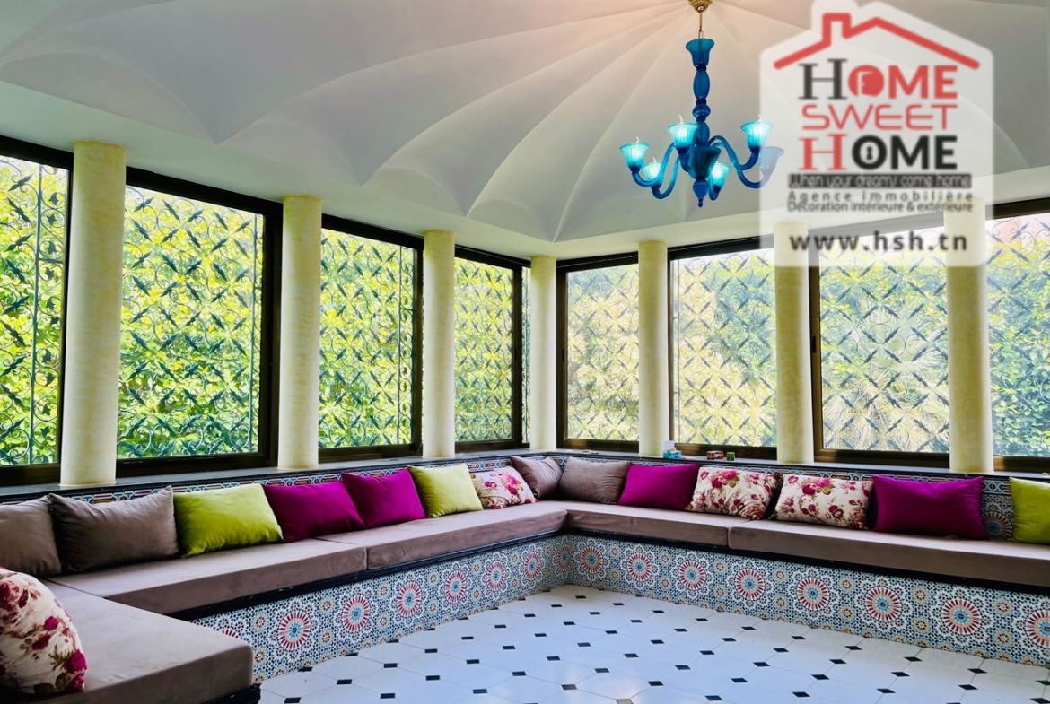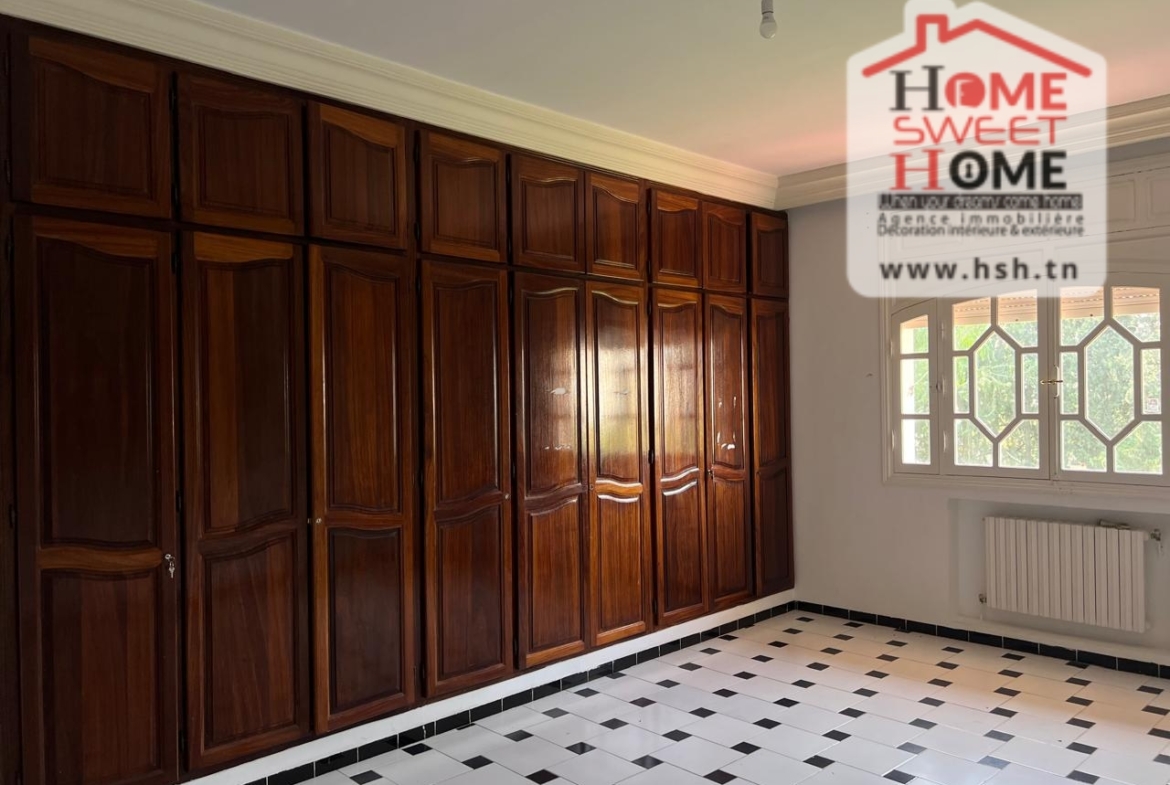 Une luxueuse Villa située dans un quartier prisé des Jardins de l'Aouina. À l'entrée, on découvre un salon lumineux, un séjour, une cuisine équipée, deux chambres et une salle d'eau pour les invités. À l'étage, une suite parentale, cinq chambres avec dressings (dont une avec balcon), une terrasse ainsi qu'une salle de bain. À l'extérieur, un vaste jardin gazonné et un garage.