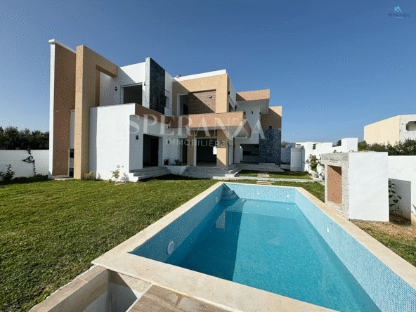 A vendre à Mrezga Hammamet nord une belle Villa s+3 neuve jamais habitée avec jardin de 230 m², bien placée dans un endroit très calme et résidentiel.