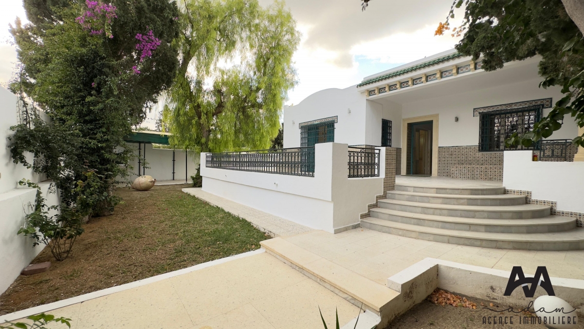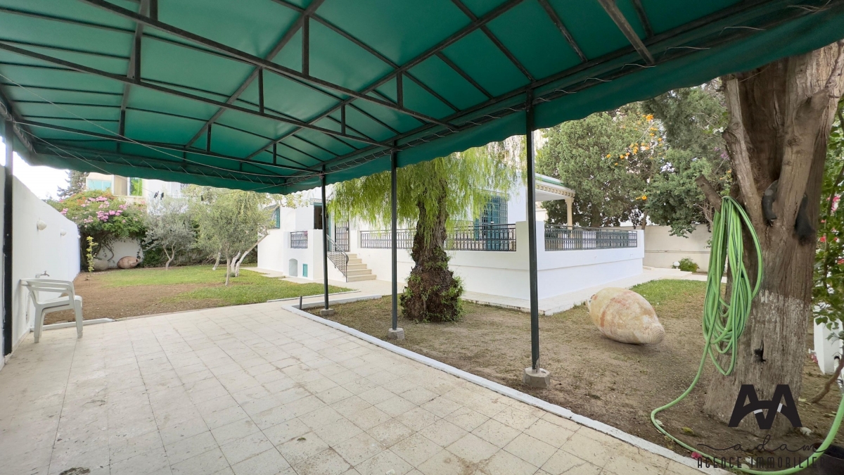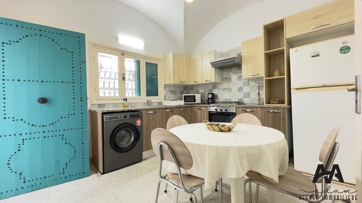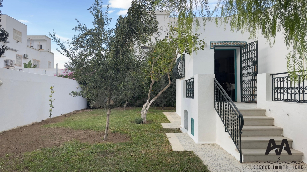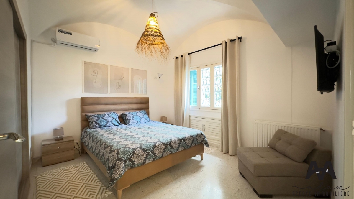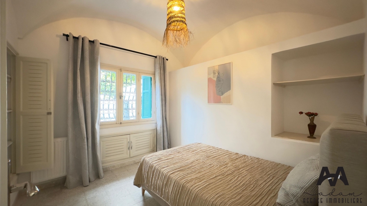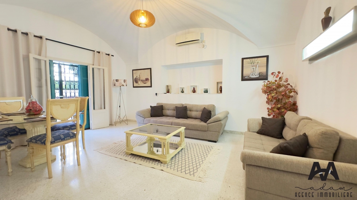 Villa S+3 meublée à louer annuellement, située aux Jasmins, Nabeul, à seulement 3 minutes à pied de la plage.