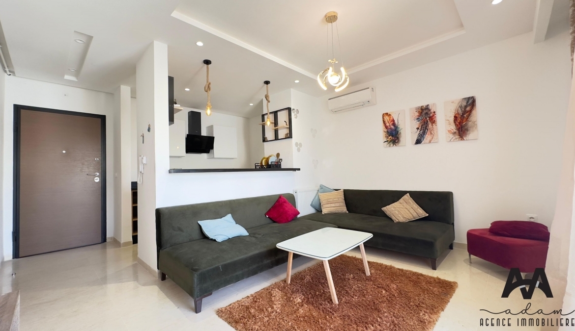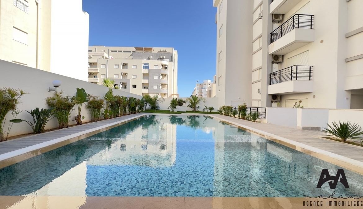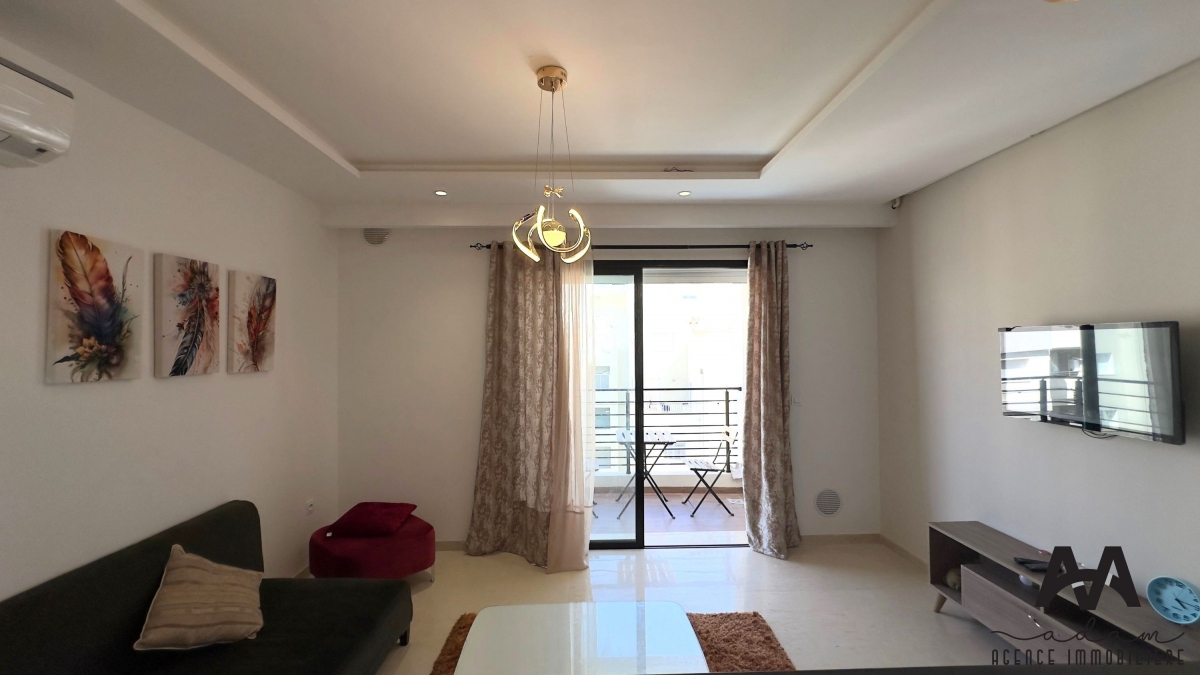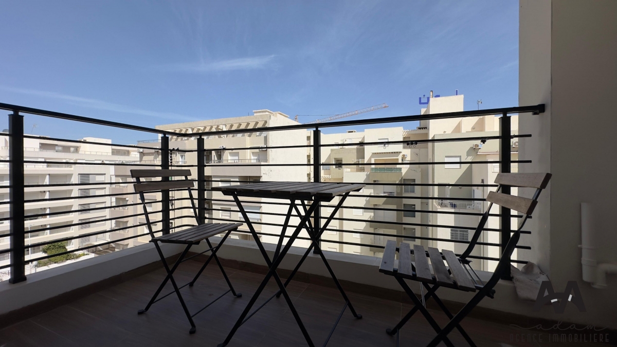 Un appartement s+1 au 5eme étage dans une résidence gardée avec piscine et double ascenseur, Il se compose d’un salon balconnet vue de piscine, chambre parentale avec dressing, kitchenette équipé aménagé (plaque, hotte, four, frigidaire et une machine à laver) et salle de douche .