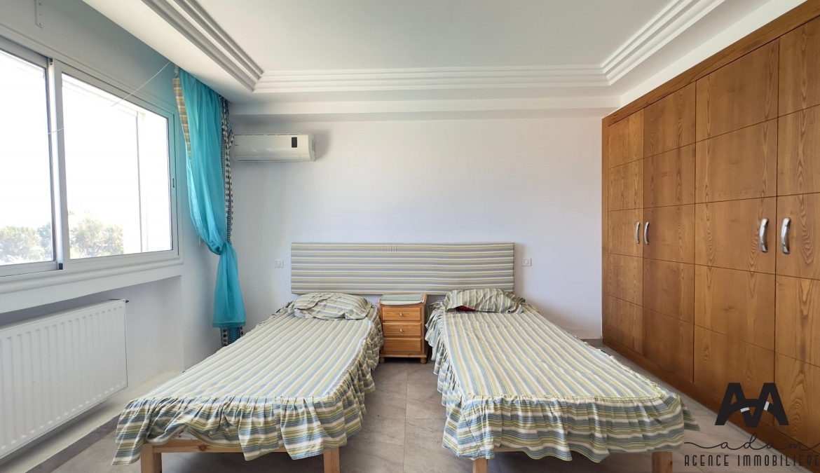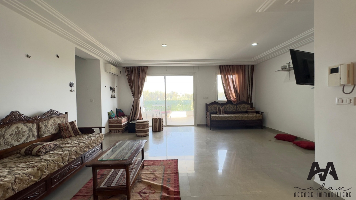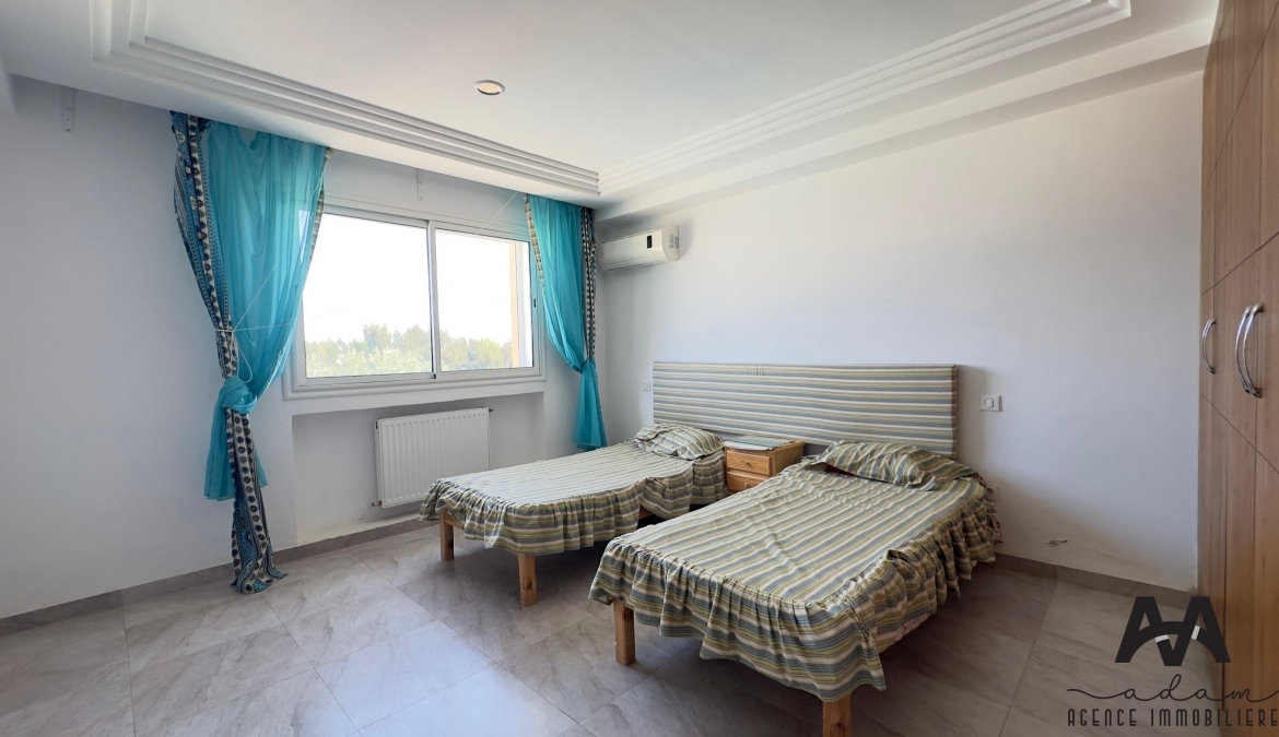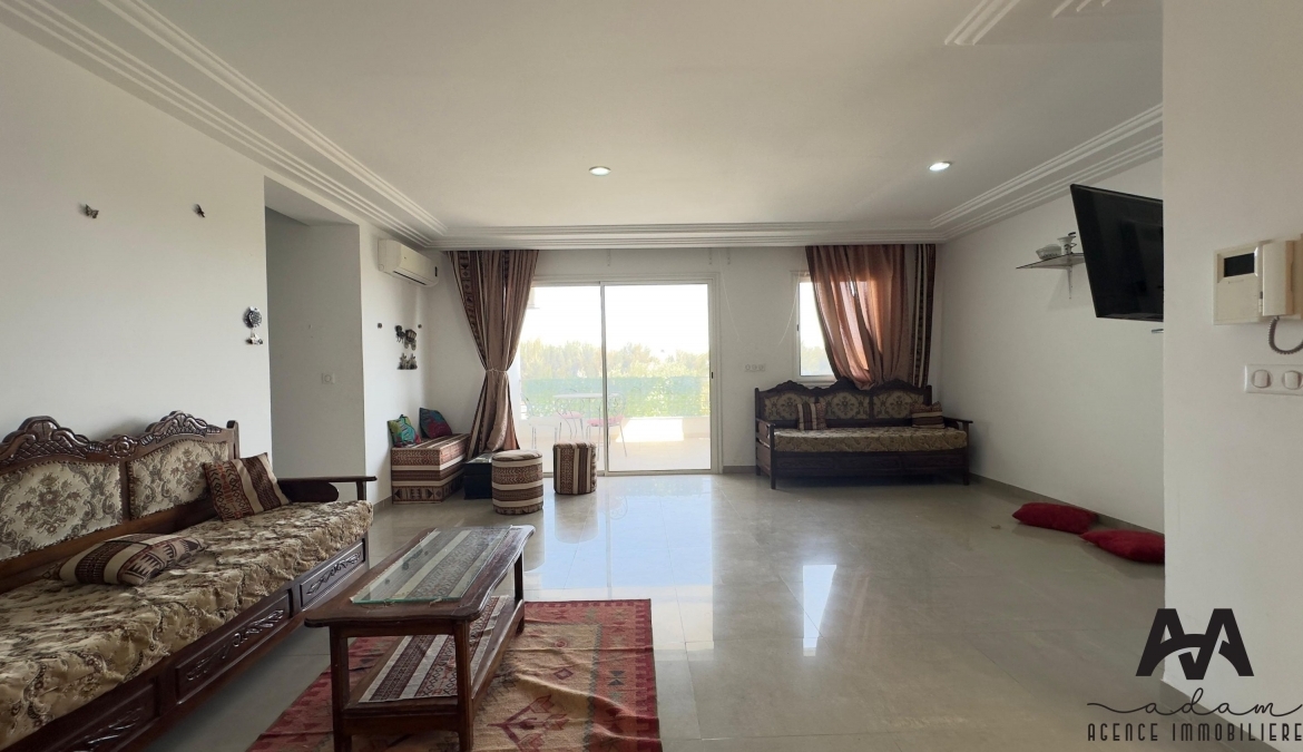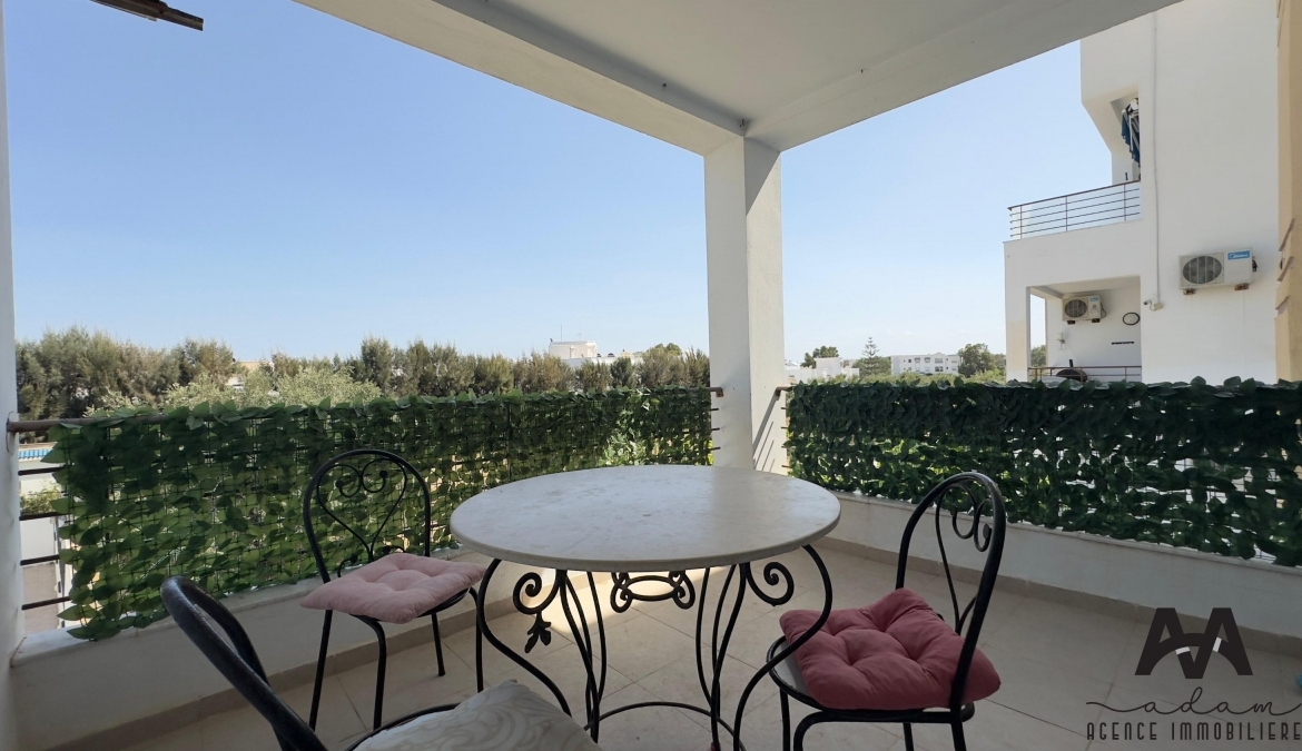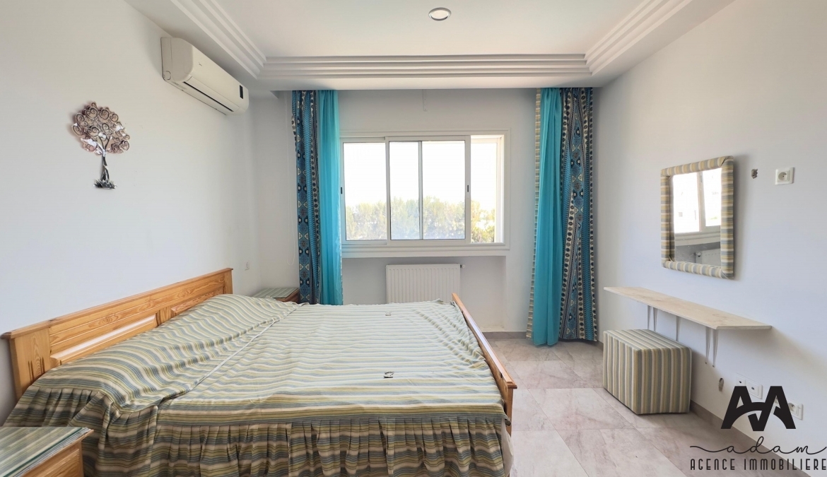 ADAM Agence Immobilière vous propose à la location un bel appartement S+2 meublé, situé au 1er étage d’une résidence sécurisée avec piscine collective, idéalement implanté à Mrezga, proche des commodités et à quelques minutes de la plage.