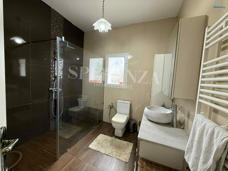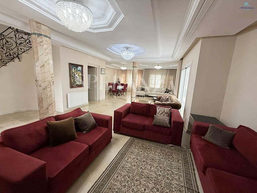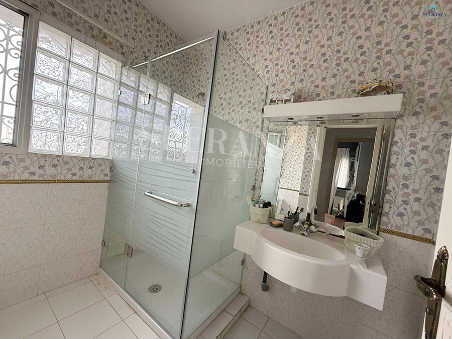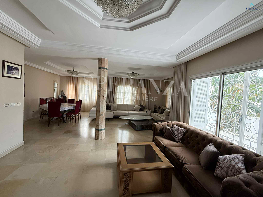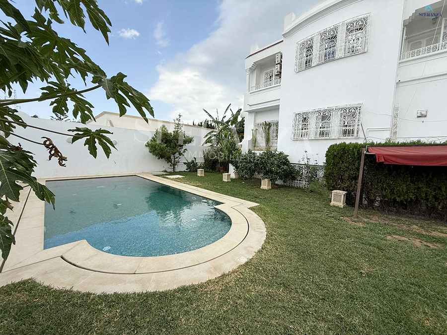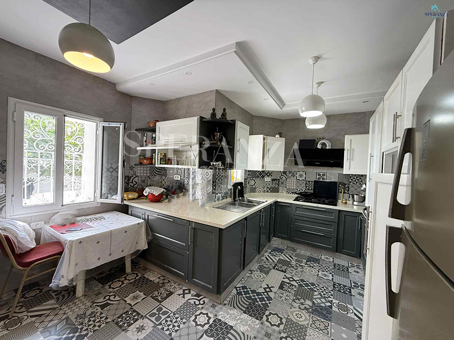 Speranza immobilière Hammamet vous propose à la location vacances cette Villa située à Hammamet sud (Jinen Hammamet).Elle est bénéficiée d’un jardin gazonné avec piscine qui offre plusieurs espaces de détente.La partie jour est composée principalement d’un salon spacieux .La cuisine dispose de plusieurs éléments de rangements, une salle d’eau pour les invitées et une chambre à coucher. Un escalier qui nous mène au compartiment nuit dans lequel prennent place une suite parentale et deux chambres à coucher. Ainsi qu’un grand terrasse . (NB: 7 minutes à pieds à la plage )