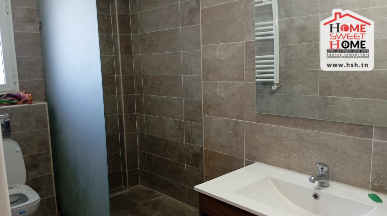 Un appart de charme au 4éme étage avec une vue sur mer situé dans un immeuble sans ascenseur à Raoued Plage. À l’entrée, on trouve un salon, salle à manger avec balcon, une cuisine équipée avec séchoir, une salle d’eau, une suite parentale, 2 chambres et une salle de douche