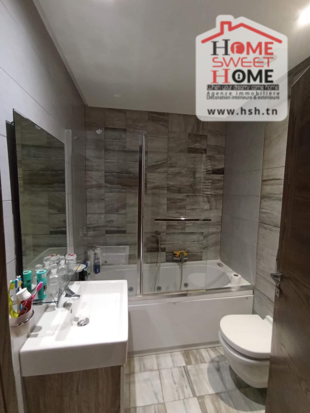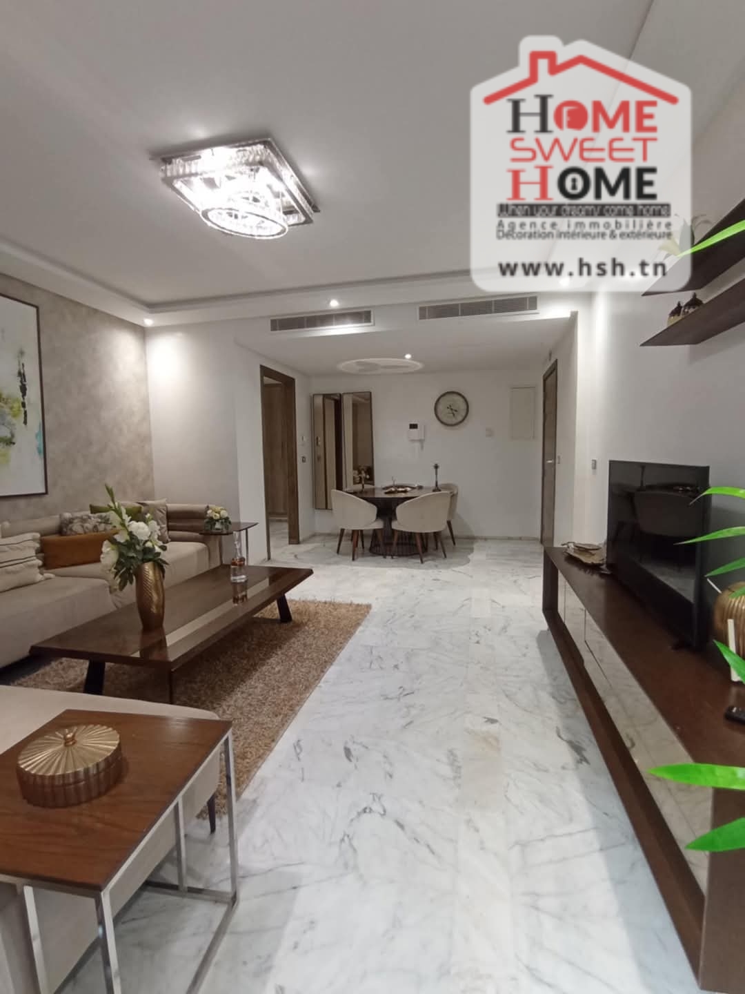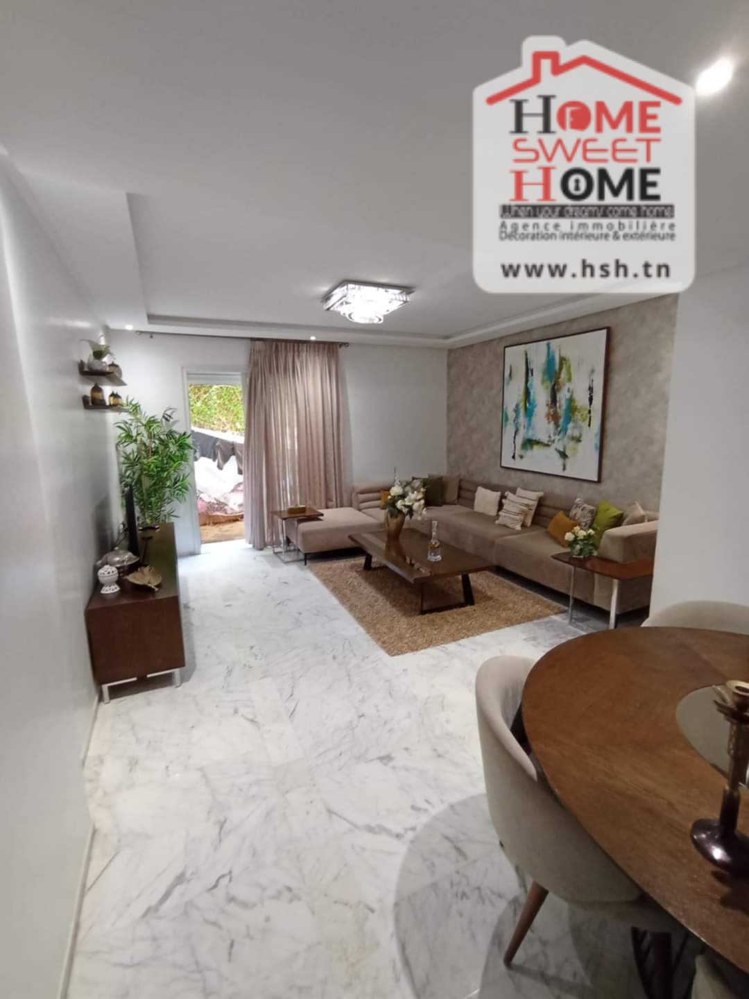 Un luxueux Appart au RDC situé dans une résidence de haut standing aux Jardins de Carthage. A l’entrée, on a un salon, une cuisine équipée avec séchoir, 3 chambres à coucher et deux salles de bains. A l’extérieur, on a un jardin et une place de parking sous-sol.