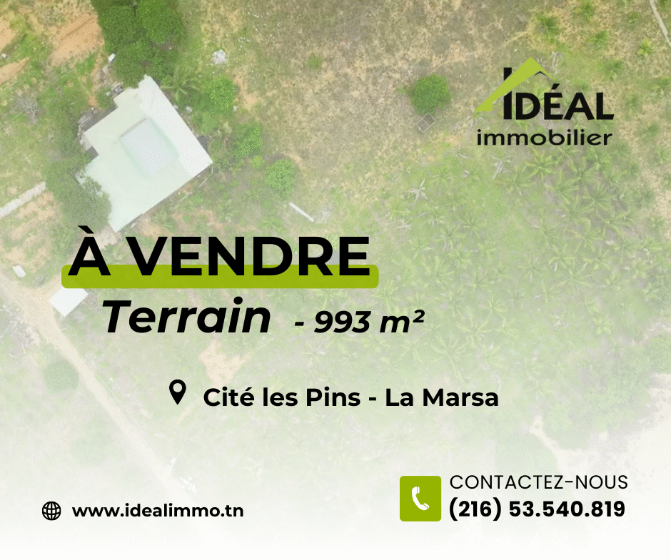 Idéal Immobilier vous propose à la vente un terrain exceptionnel de 993m², situé à Cité Les Pins– La Marsa, dans une zone d’habitation recherchée.