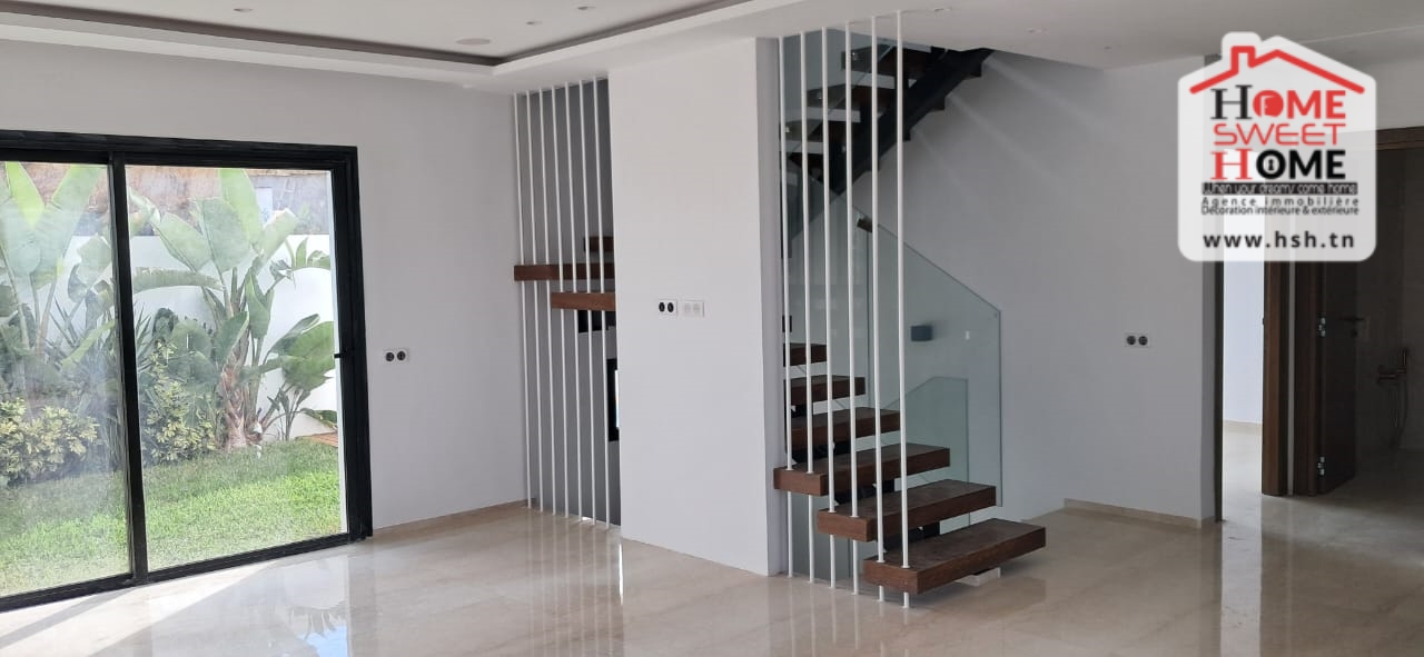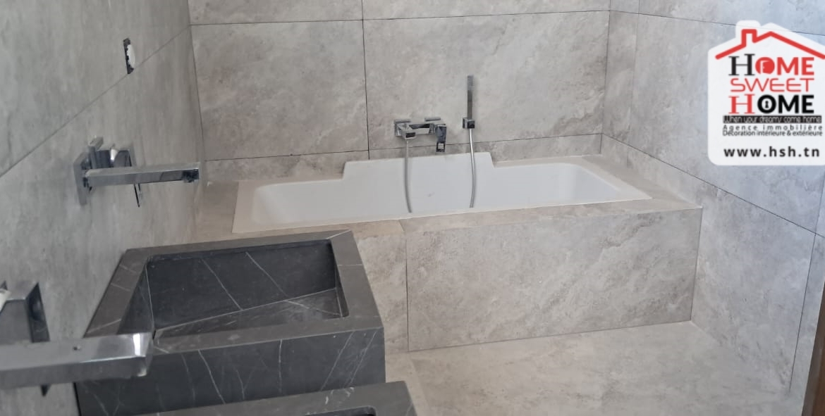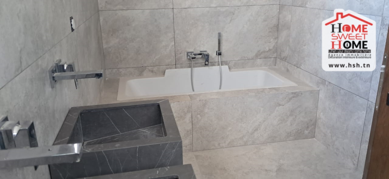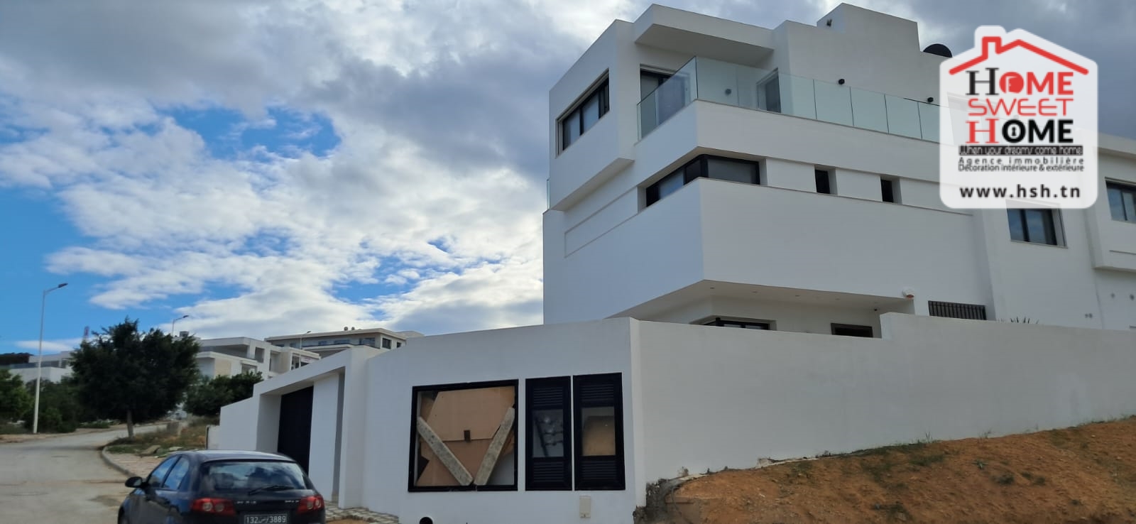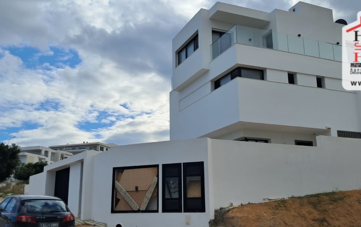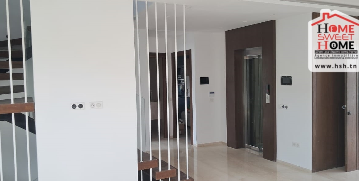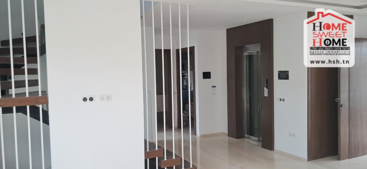 Une luxueuse villa avec piscine de très haut standing situé à Gammarth Supérieur. Au RDJ, On a une salle de jeux, une suite de bonne et une buanderie. Au RDC , on a un grand salon, salle à manger, une cuisine équipée avec séchoir, un séjour et une salle d’eau pour les invités. Au 1er étage , on a une suite parentale, 2 chambres et une salle de bain. Au 2éme étage, On a un salon avec une grande terrasse et une suite royale. A L’extérieur, On a une terrasse, un joli jardin et un abris de voiture. Cette villa dispose également du chauffage central , climatisations central et un ascenseur pour accéder à l’étage.