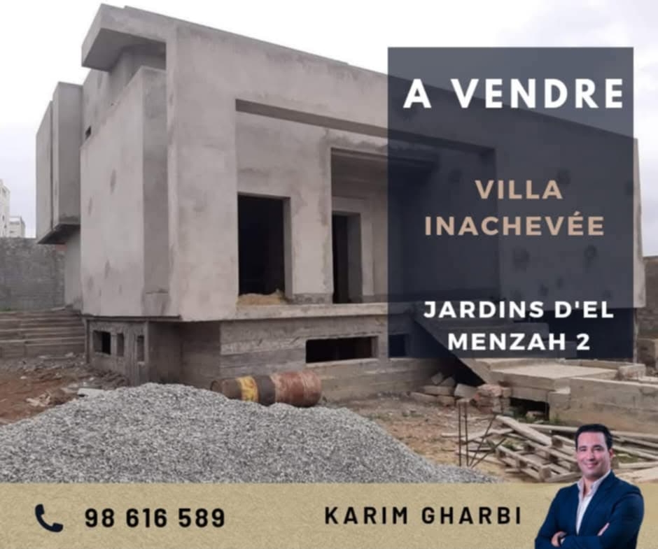 On vous propose la vente une villa inachevée de 849m² aux Jardins d’El Menzah 2 dans un quartier calme et résidentiel proche de toutes commodités. Cette villa édifiée sur une surface habitable de 555m² se compose :