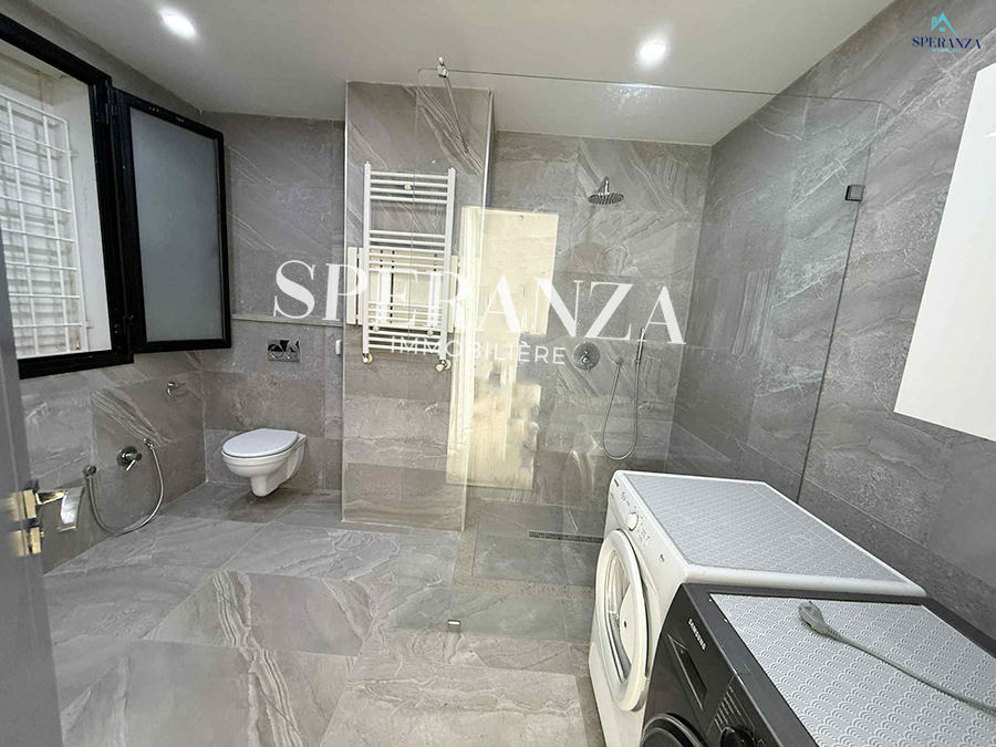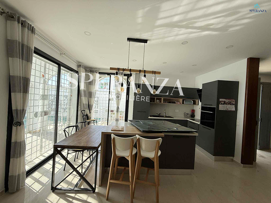 Speranza immobilière vous propose à la location annuelle cette villa style moderne situé à Hammamet centre.L’entrée principale bénéficie d’un jardin qui offre plusieurs espaces et une piscine. La partie jour dispose un salon lumineux grâce à ses fenêtres qui offre une vue sur le jardin, une kitchenette aménagée avec des espaces de rangements, une salle d’eau pour les invités et une suite parentale. Le premier étage dispose deux chambres à coucher et une terrasse. Ainsi qu’un garage.