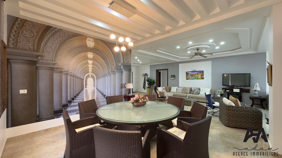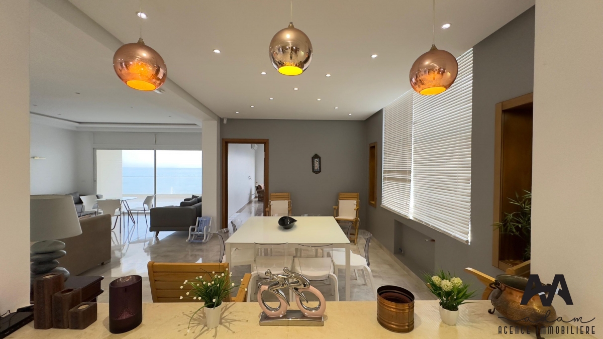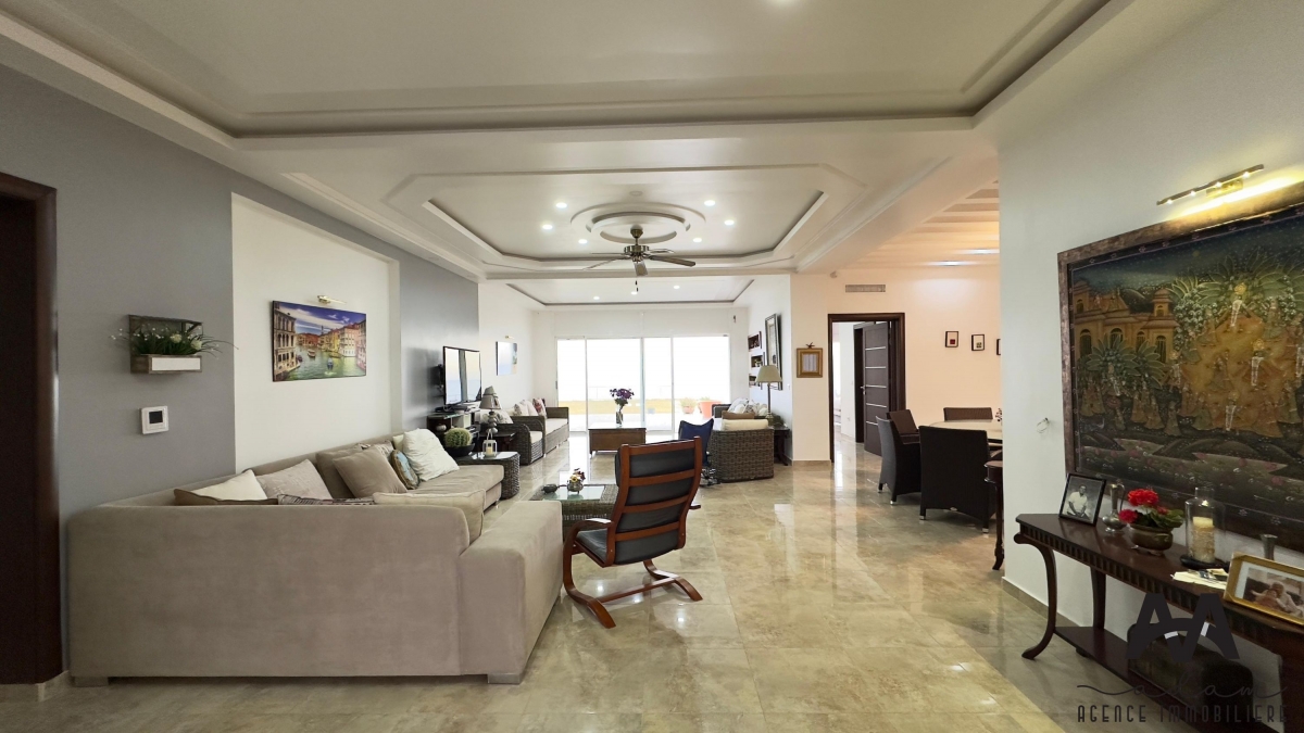L’entrée donne sur un salon open-space et un coin salle à manger vue de mer.